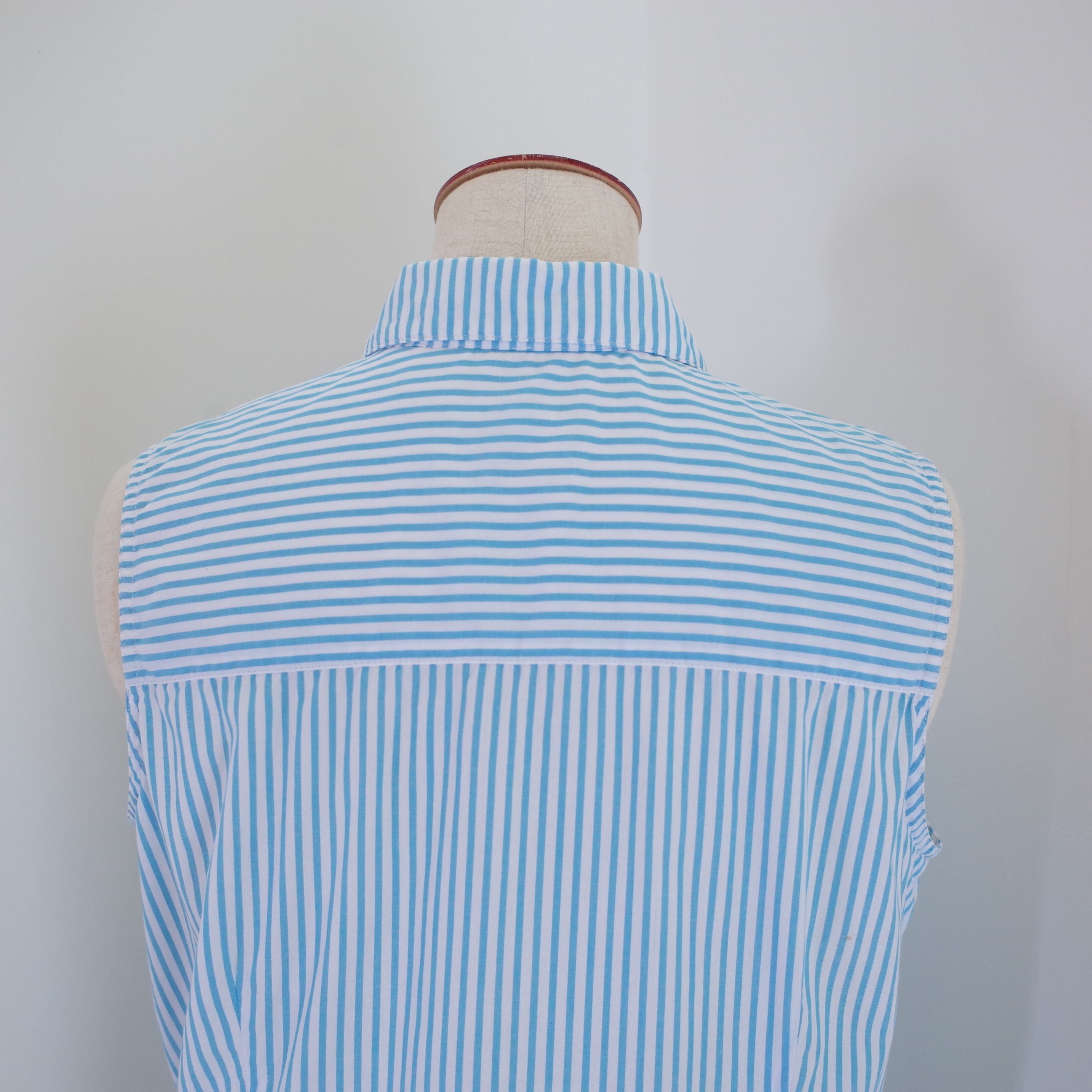Liz sportのノースリーブのストライプシャツ。ボタンではなく、ジップで開閉するタイプ。キャミソールやタンクトップの上に羽織ったり、秋冬はスウェットやニットの下にインしたり。一年通してレイヤードスタイルが楽しめる一着です。