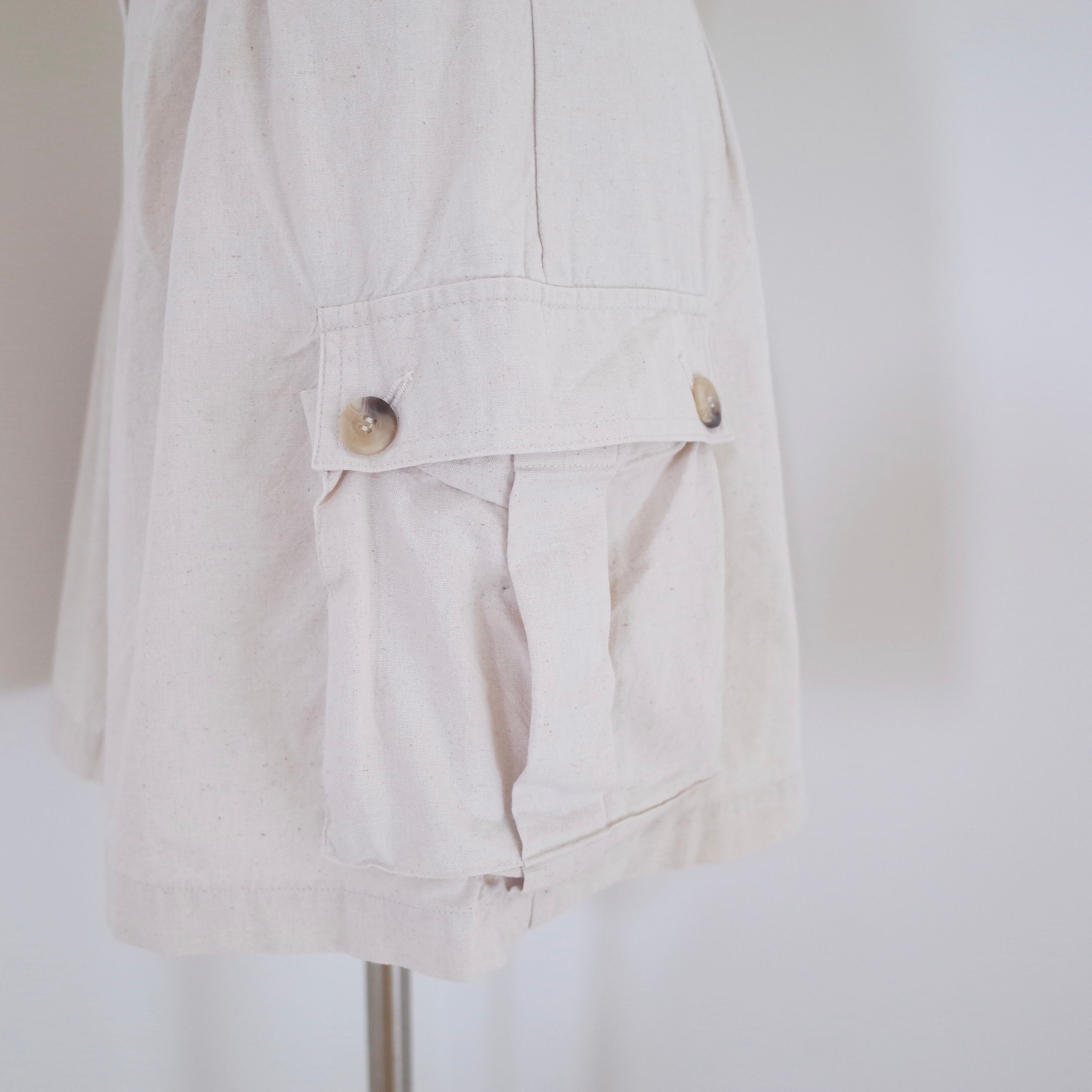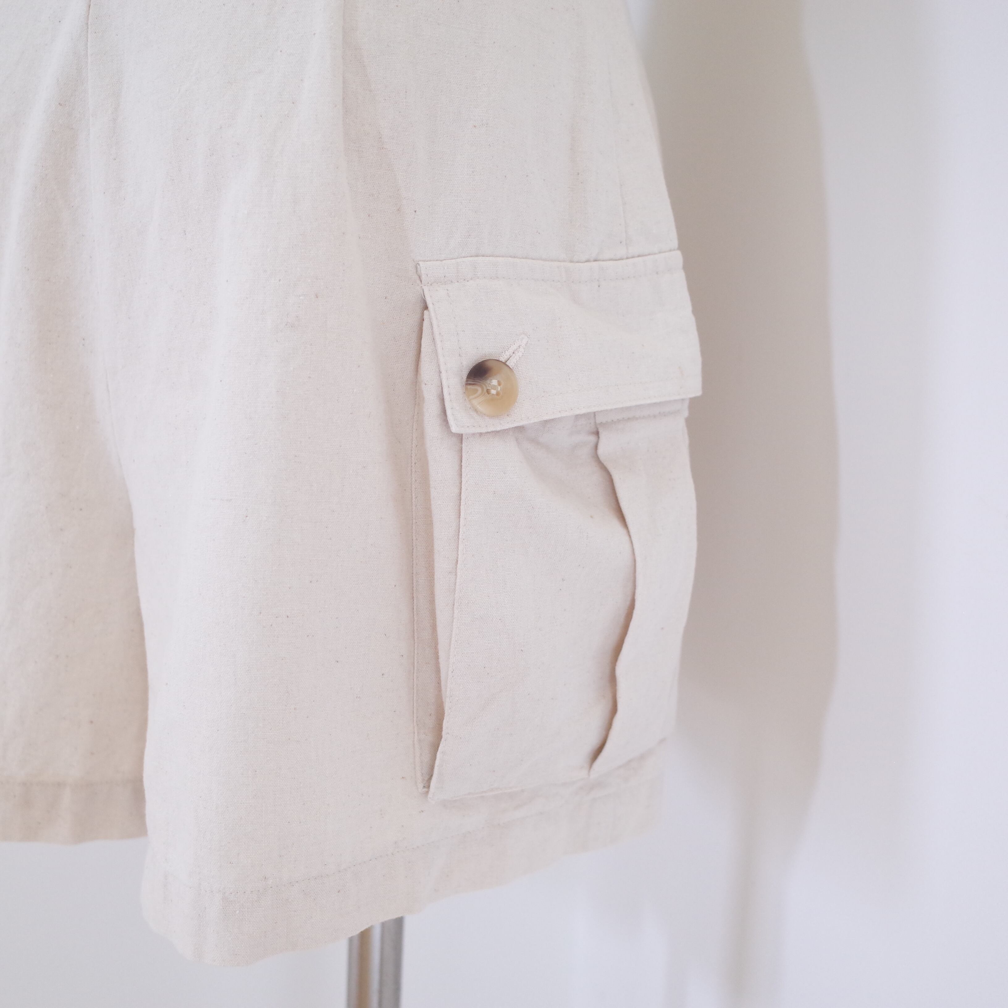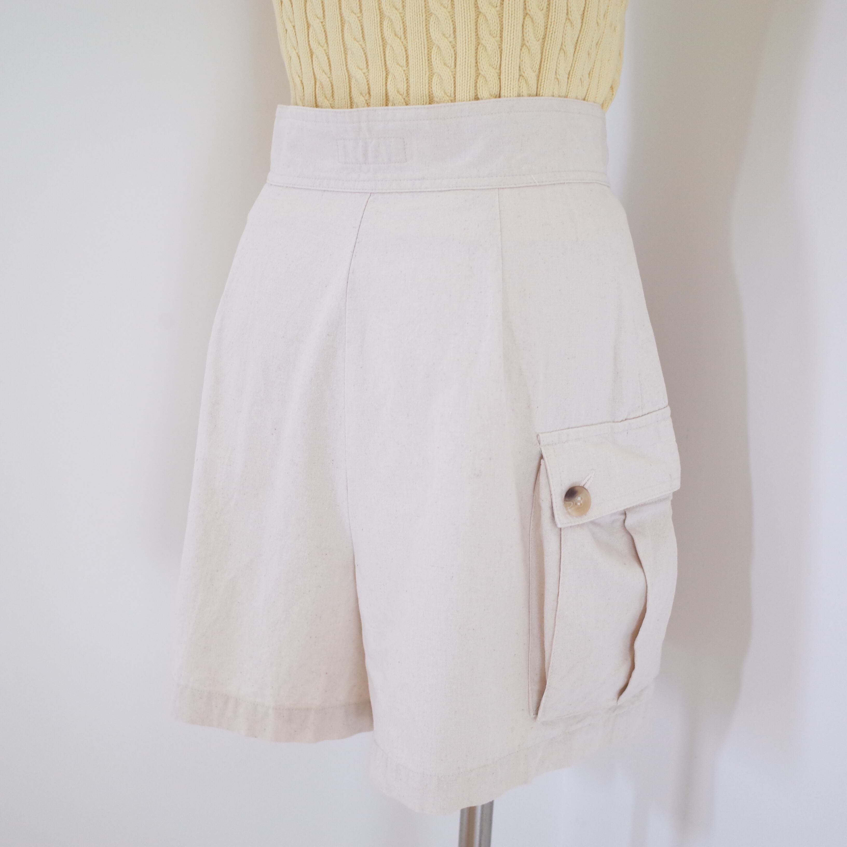 サイドに大きなポケットがついたESPRITのショートパンツ。1980〜90年代に人気だったカリフォルニア発のラグジュアリーアパレルブランド「エスプリ」。風合いの良いコットンの薄手のキャンバス生地。スリータックでキュロットのように広がった程よくボリュームのあるシルエットが、暑い季節でも涼しい穿き心地のショートパンツです。ウエストのデザインもかわいく、ハイウエストなのでタックインしたスタイリングもおすすめです。