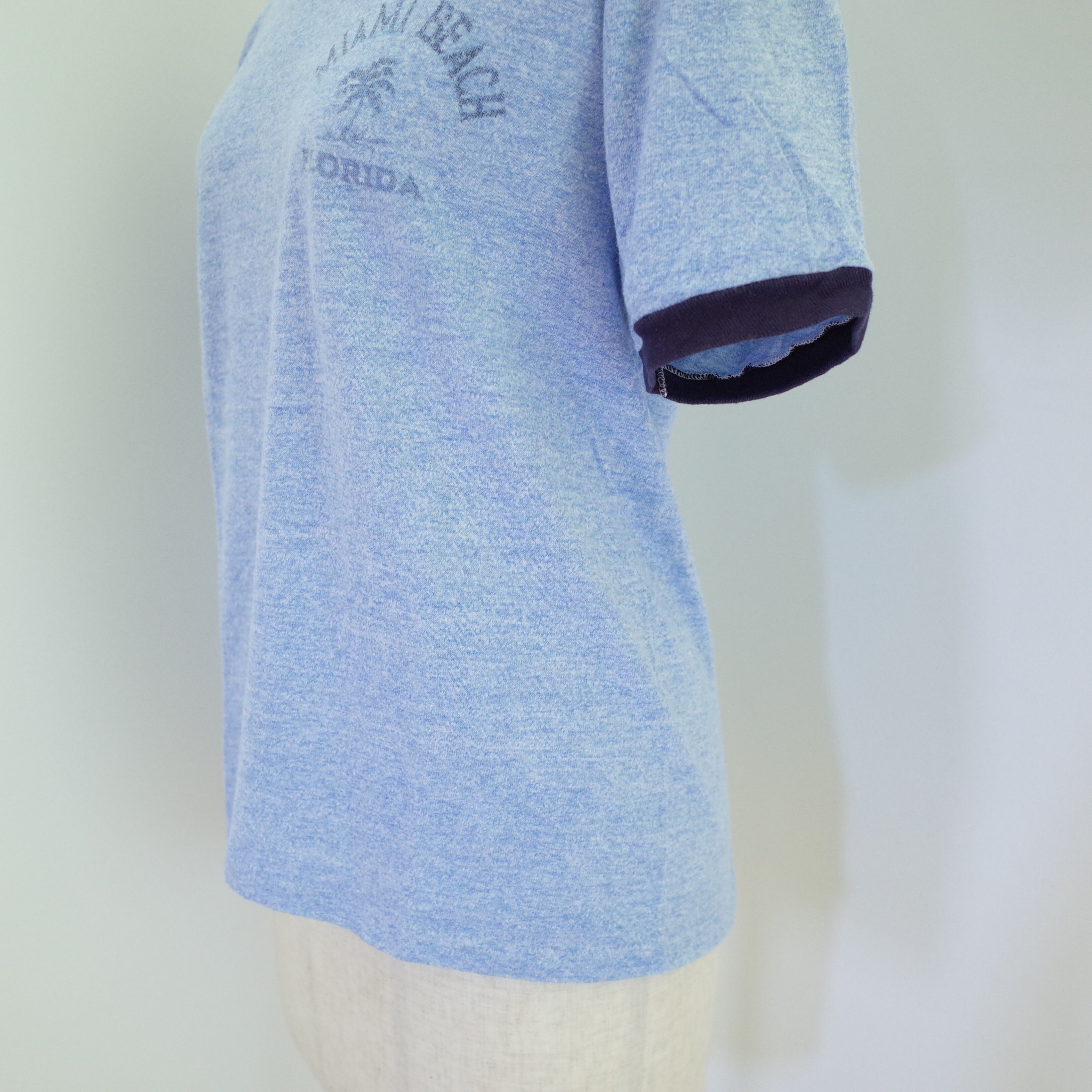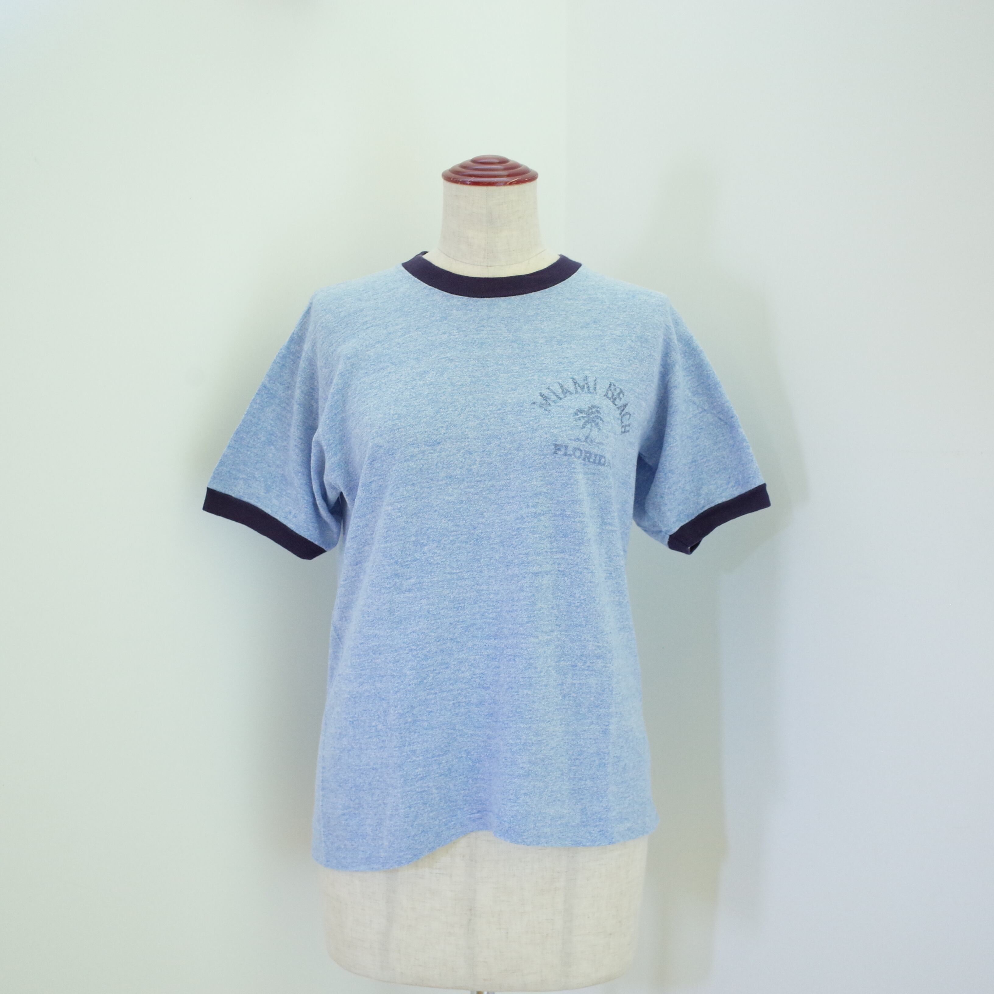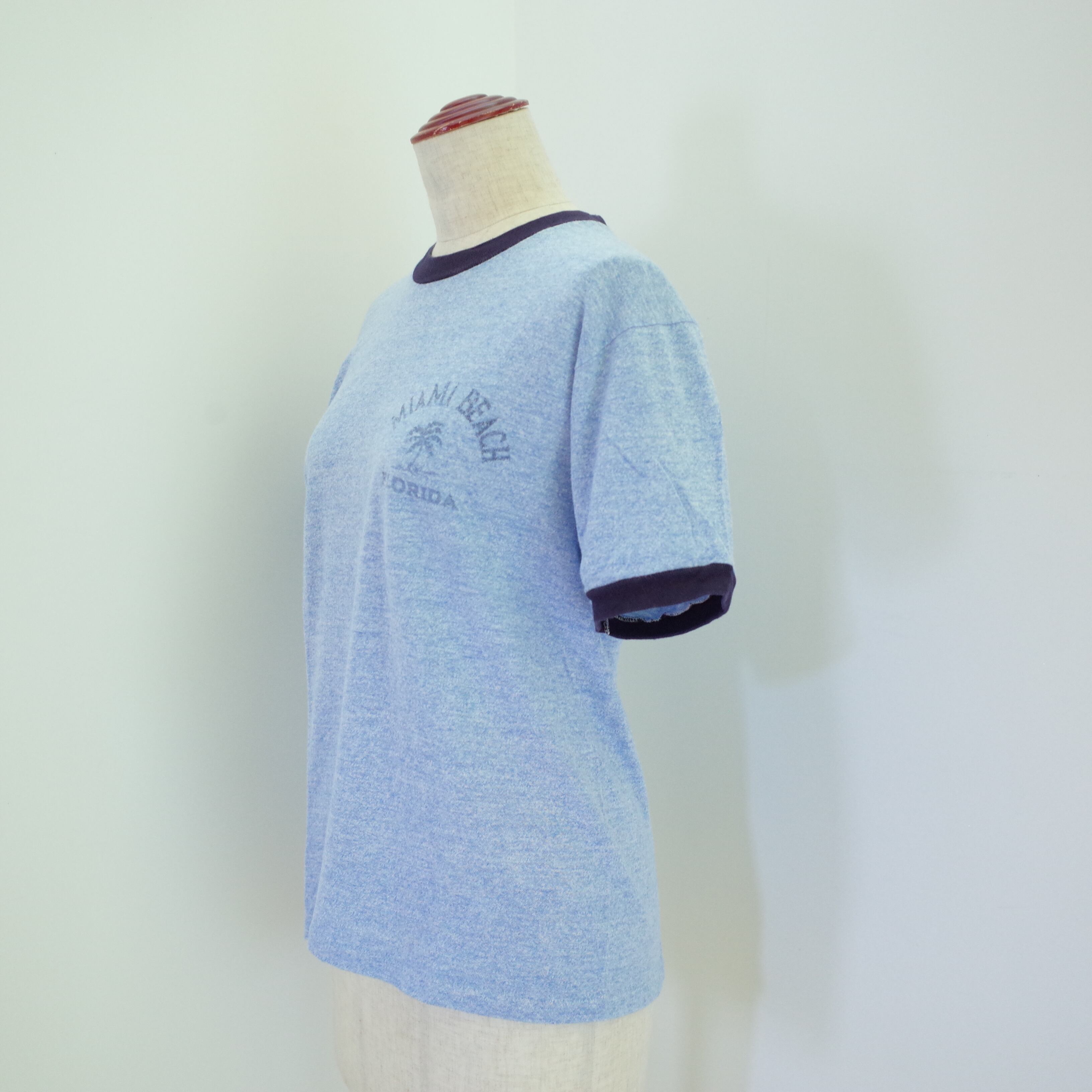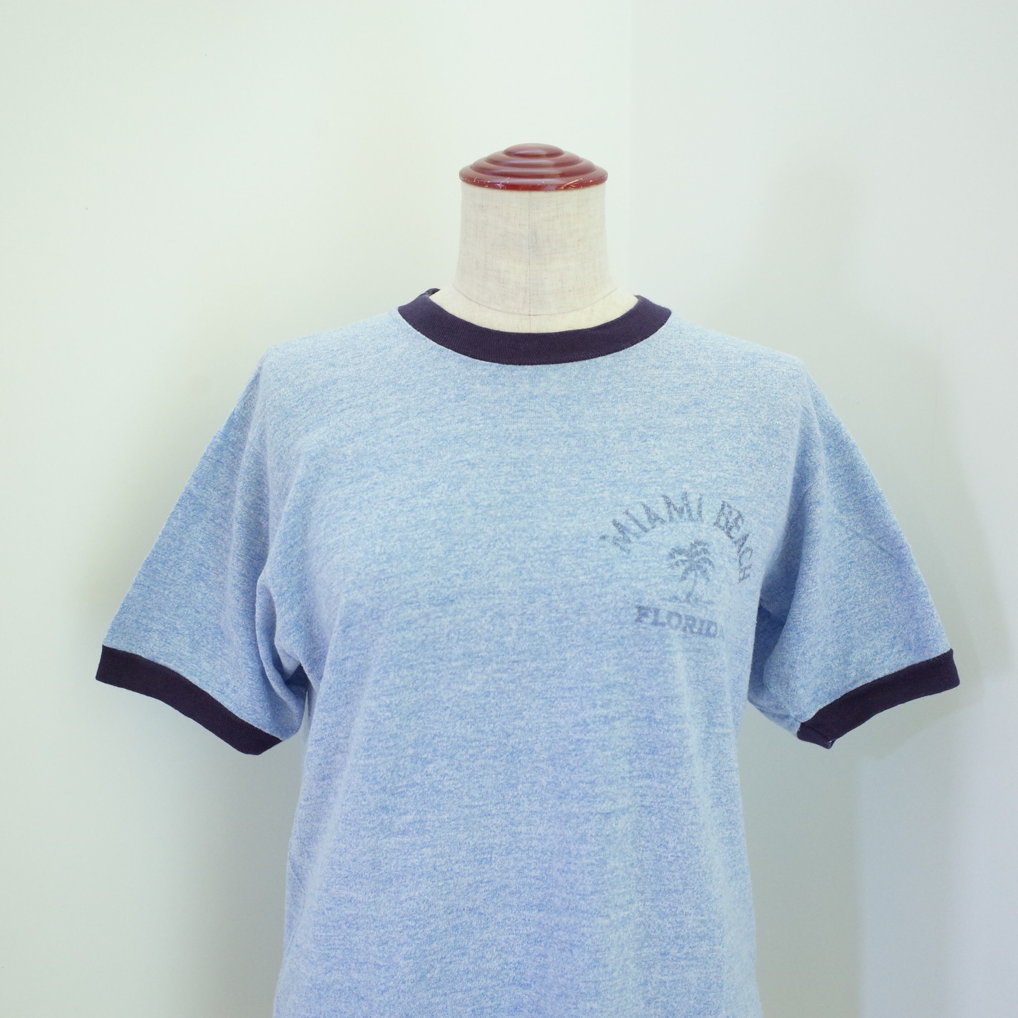 70〜80年代アメリカ製SherryボディのリンガーTシャツ。胸元にはMiami beach Floridaとヤシの木。プリントの擦れた感じや霜降りブルーのカラーがヴィンテージらしい一枚です。
