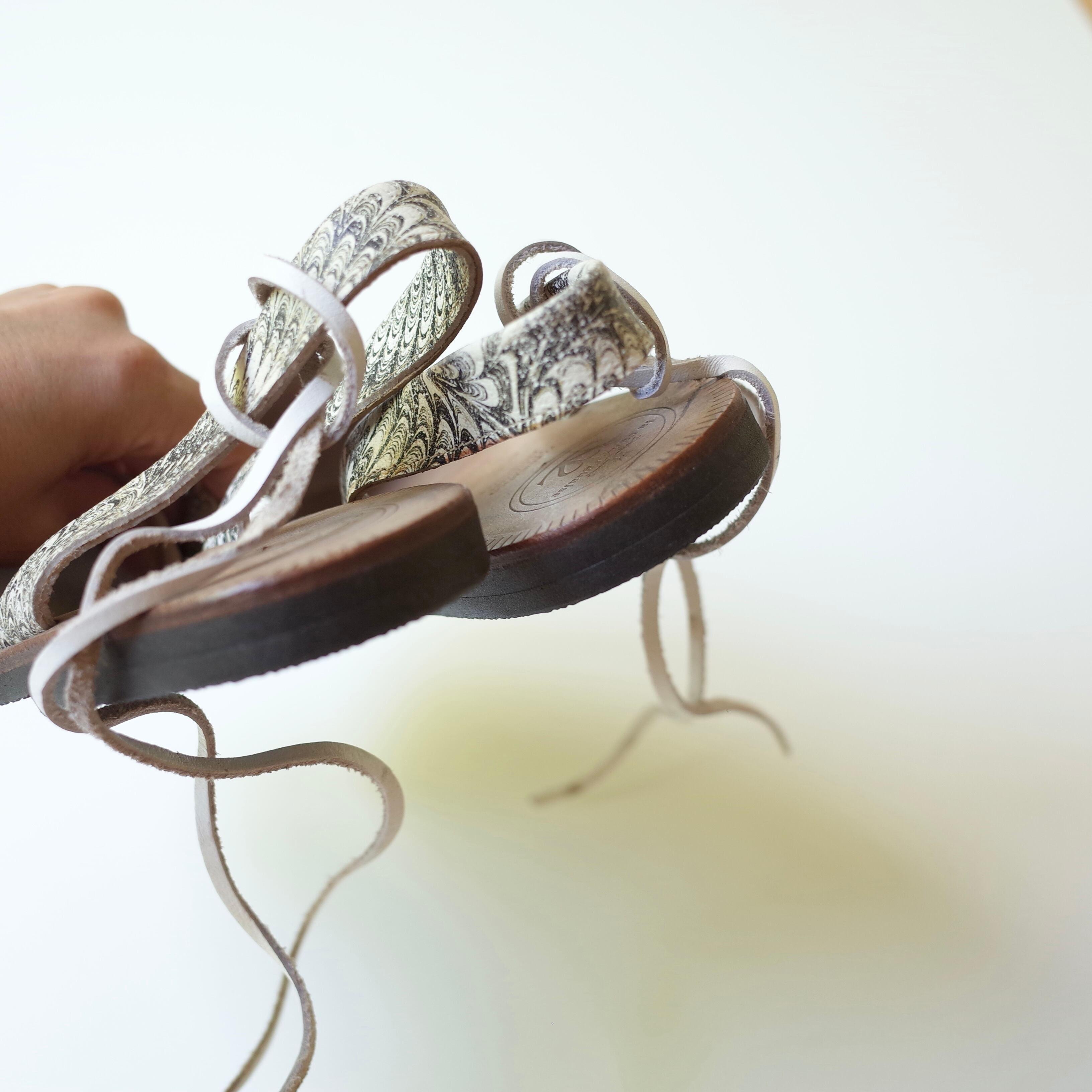 シックなマーブルカラーが目を惹く、フランスのレザーサンダル。甲と踵をホールドし、さらに足首に結ぶタイプのストラップでしっかりとフィットしてくれます。暑さのせいで、マンネリになりがちな夏のスタイルに気分を上げてくれるサンダル。薄手のソックスを合わせれば、春から秋までかわいい一足です。
