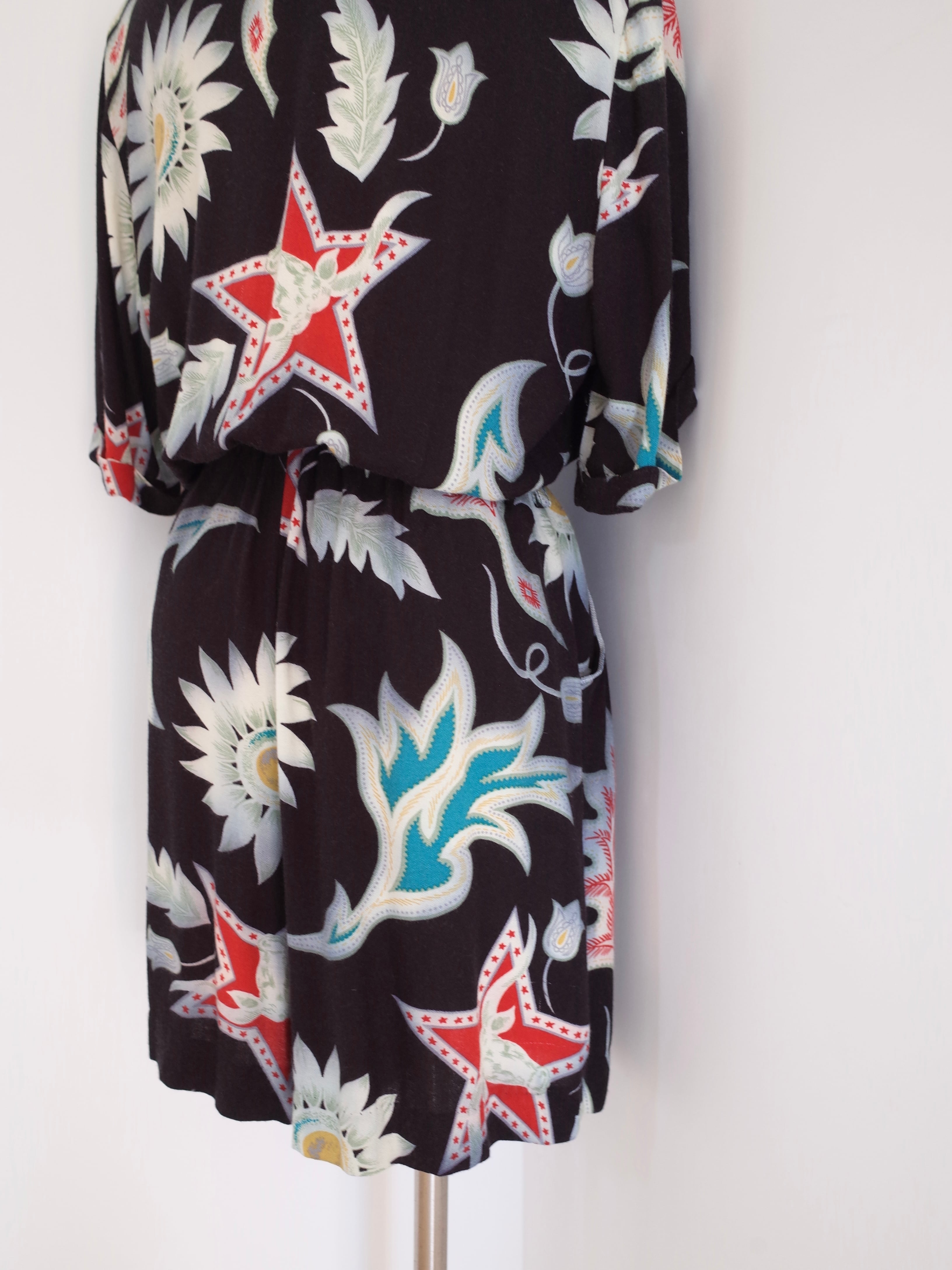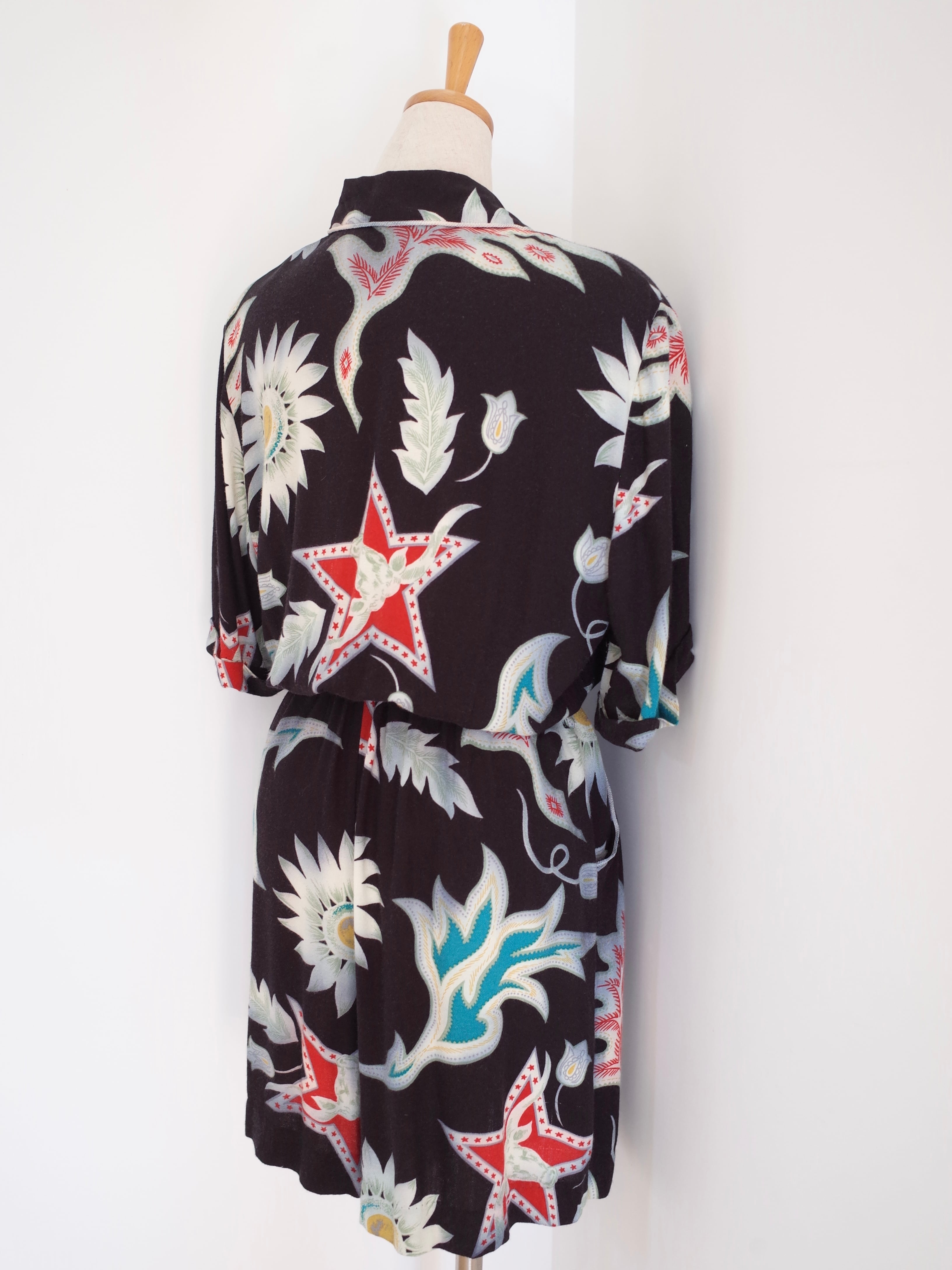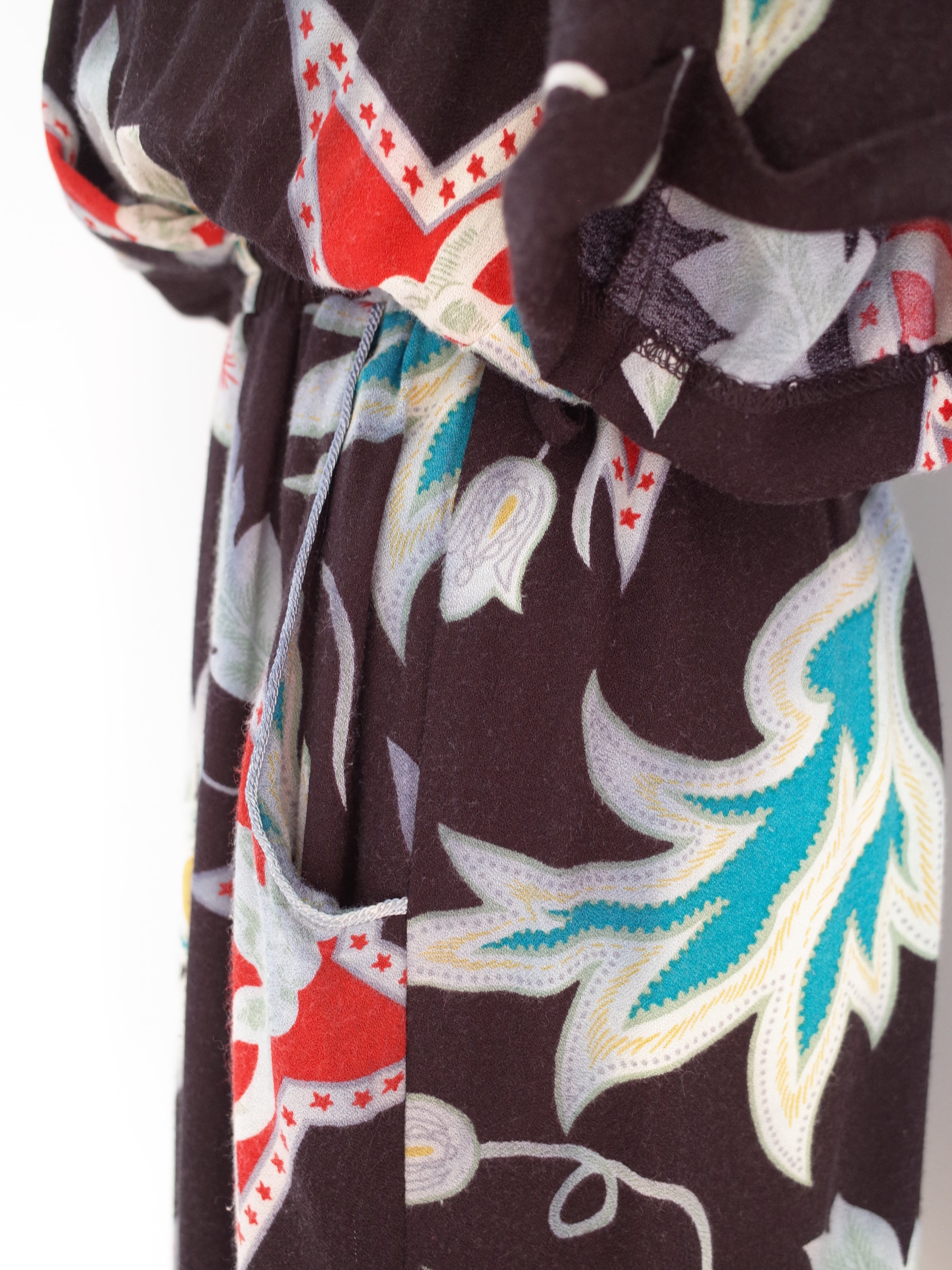 シックな雰囲気の中にポップさもある柄がかわいいオールインワン。アメリカ製です。タンクトップやTシャツをインしてレイヤースタイルも楽しめます。ウエストはゴムでとまるデザインで、裾はキュロットのように広がったシルエットです。一枚で様になるサロペットです。