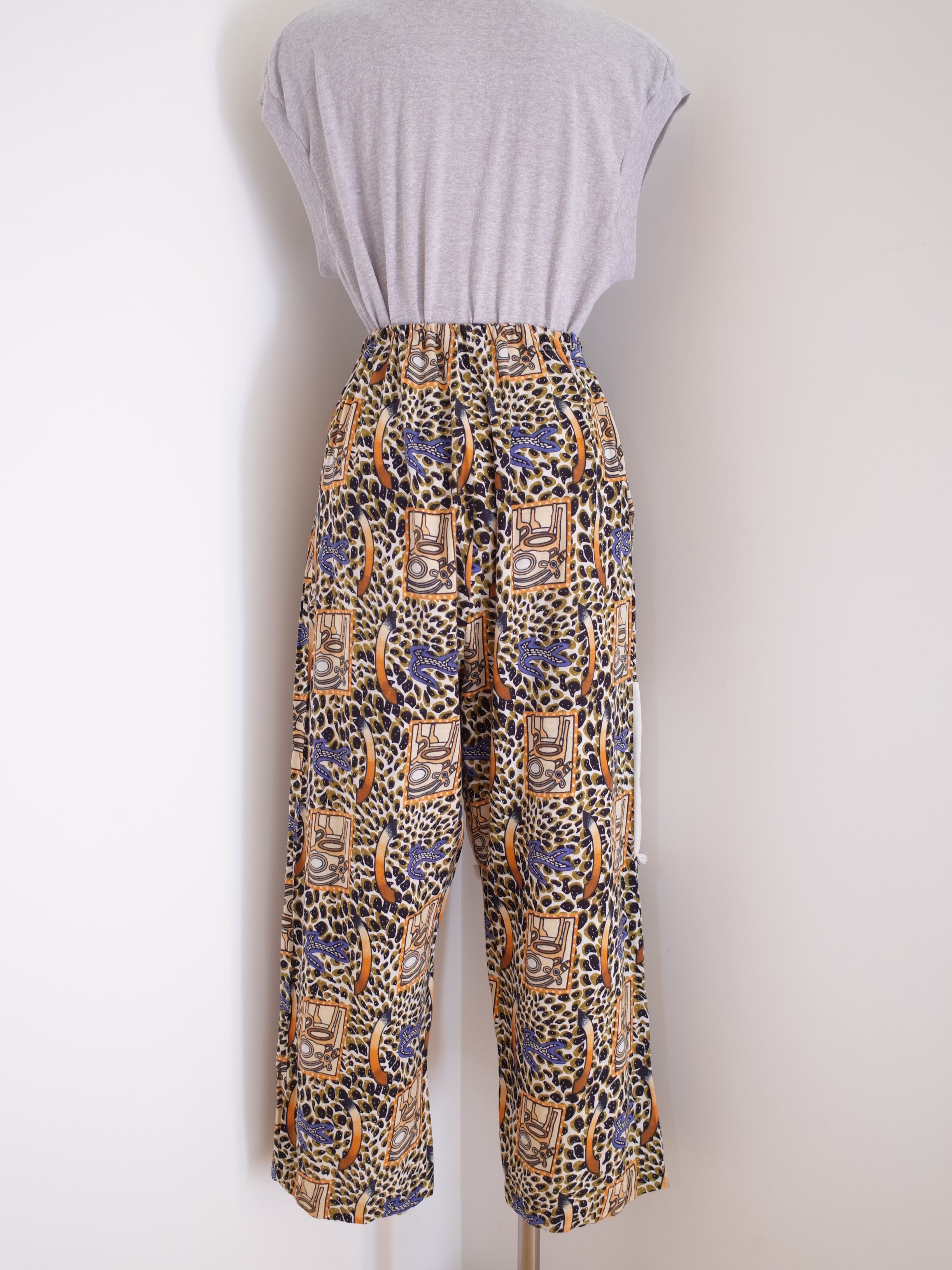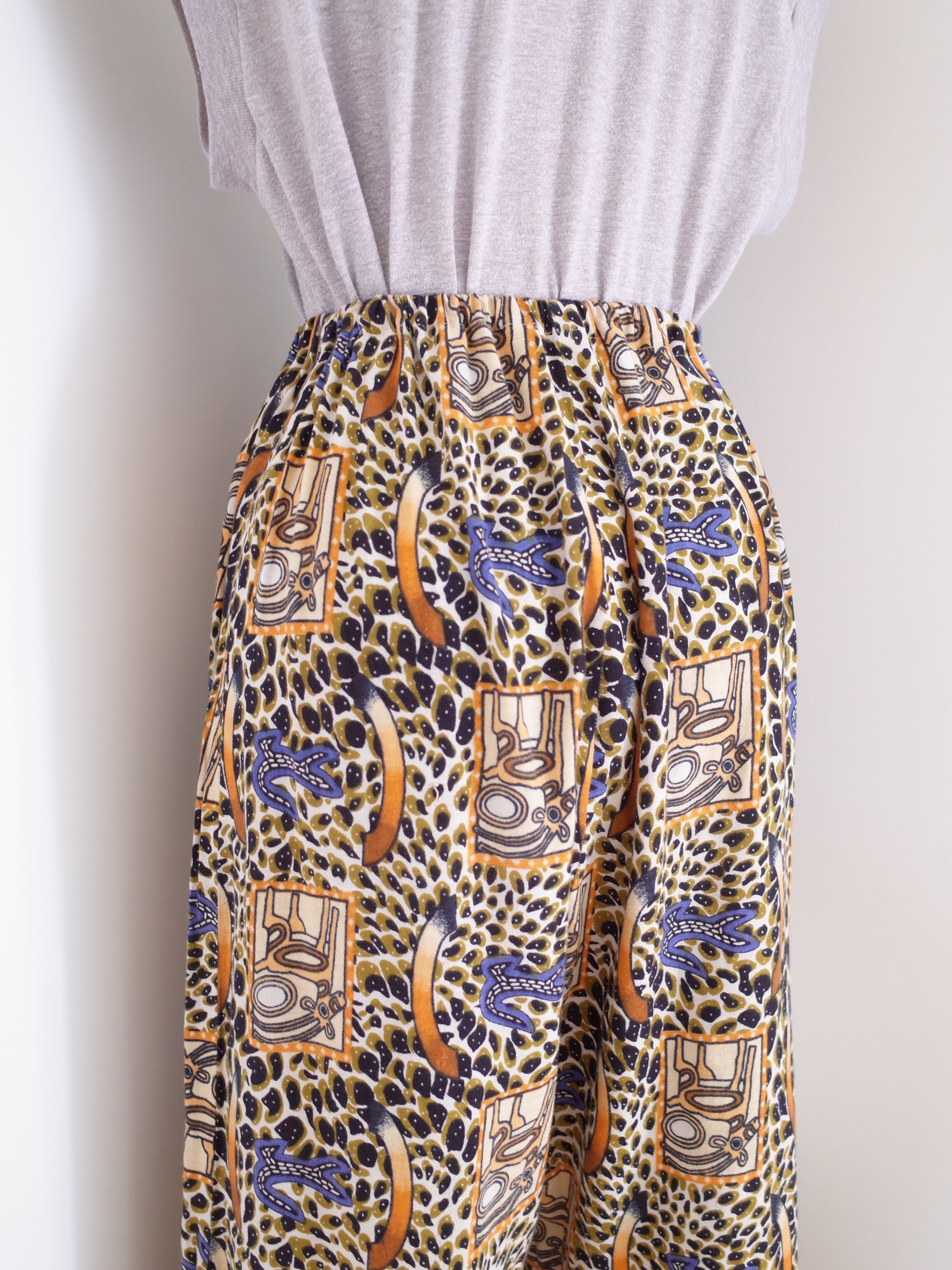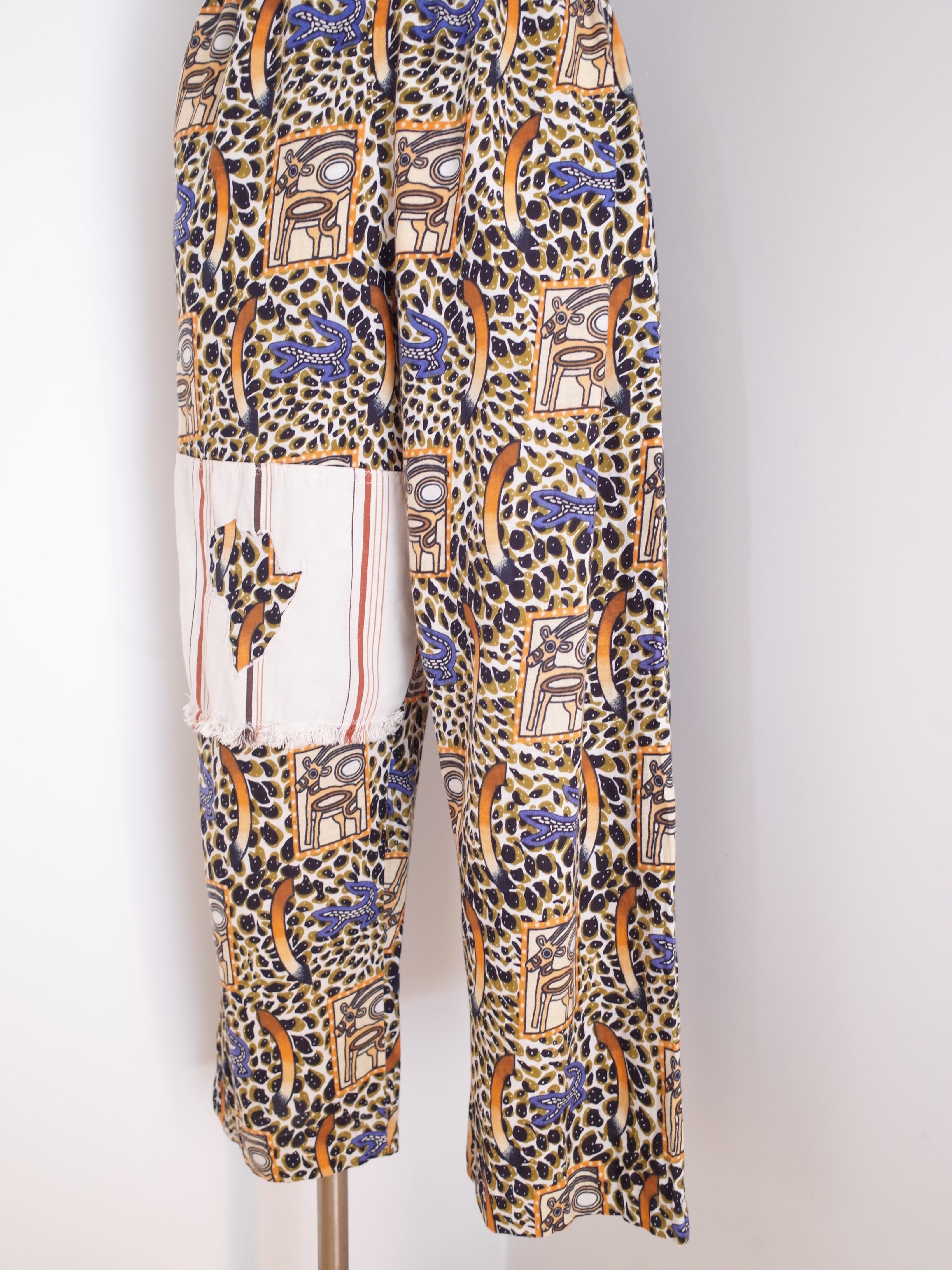 アフリカンファブリックを使用した手縫いのイージーパンツ。右膝にアフリカ大陸のポイント。薄くてシワになりにくいコットン+化繊のような素材が涼しく、少しテロンとした風合いも。ウエストはゴムなので楽ちんなパンツです。右側のみポケットが付いています。