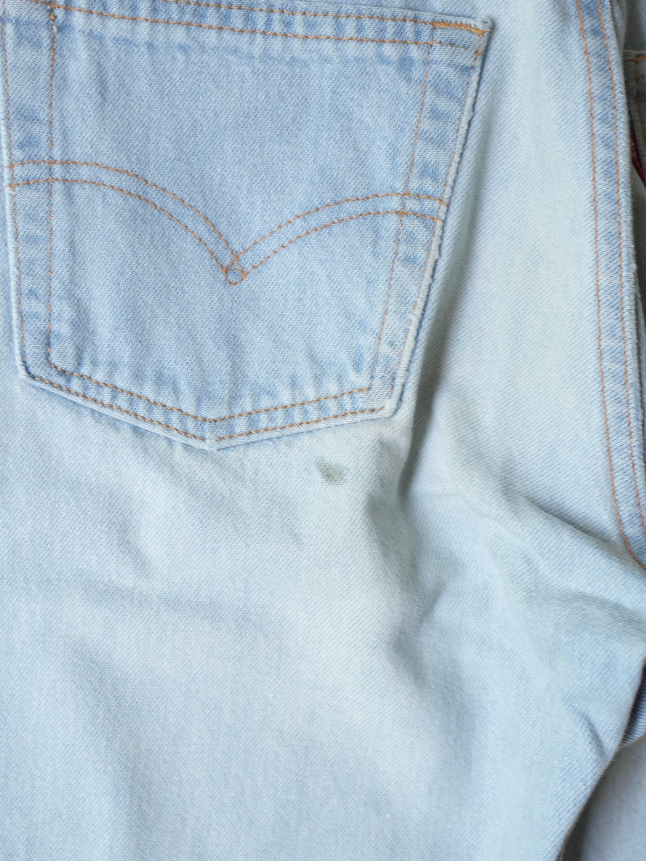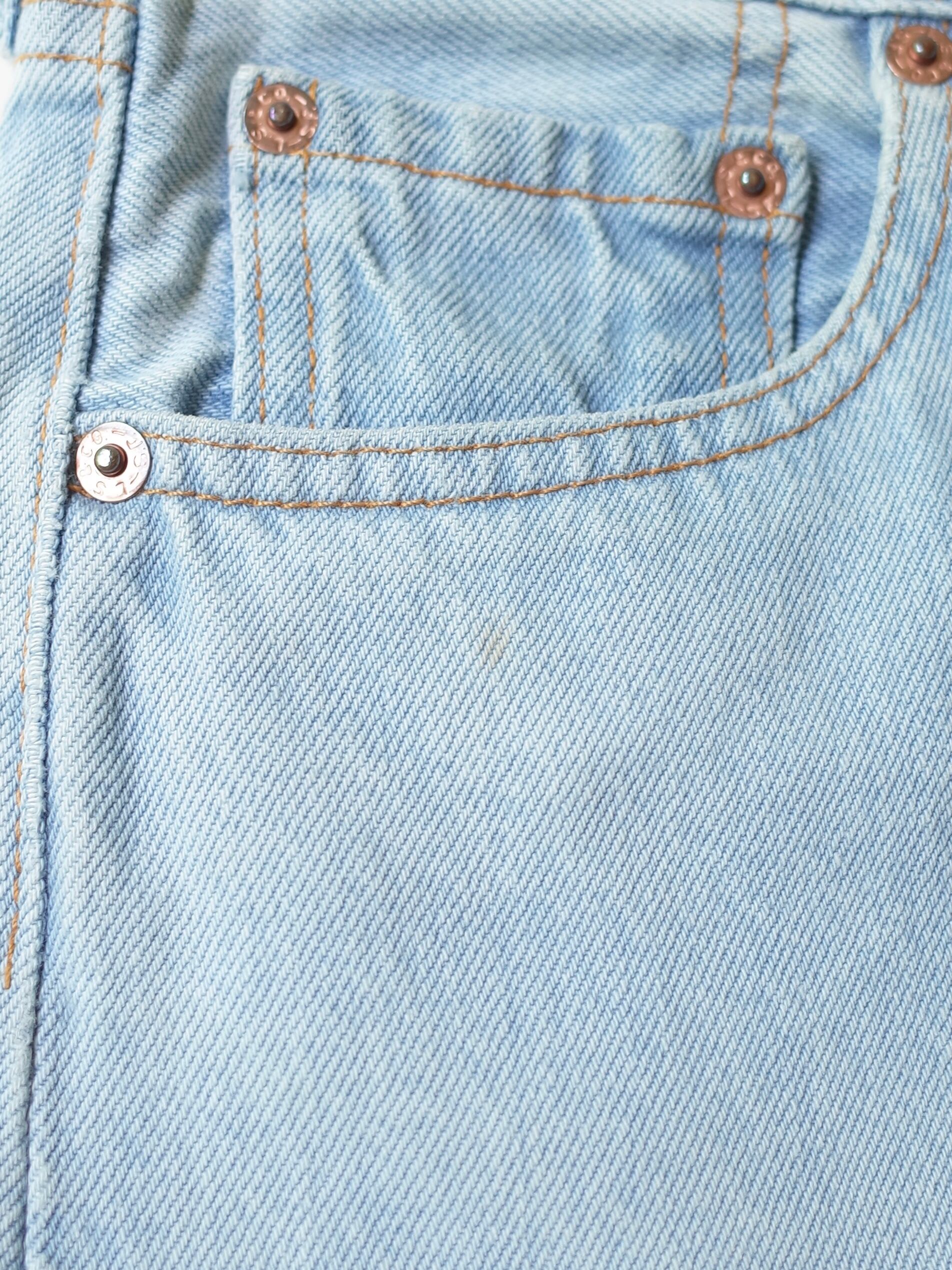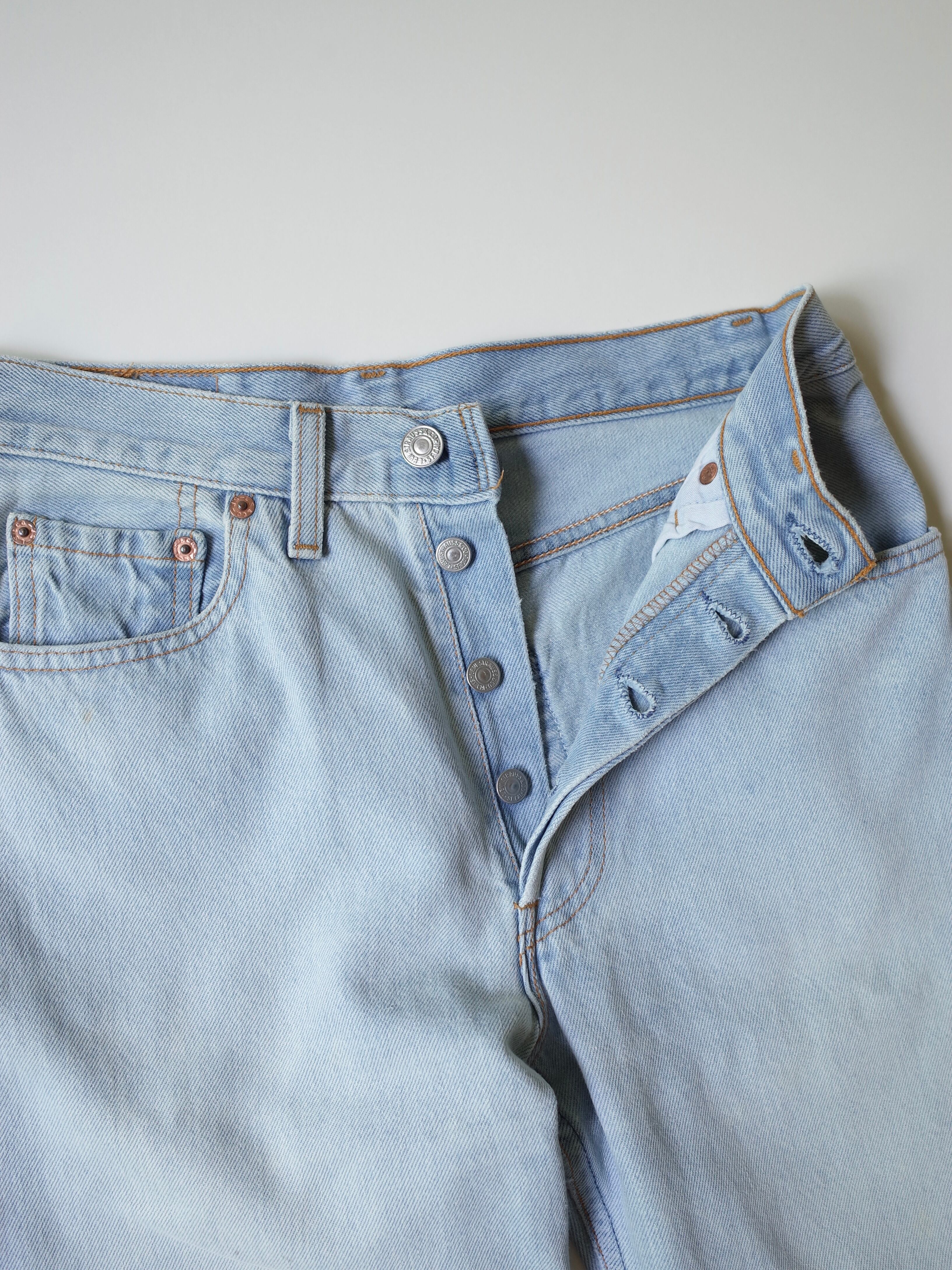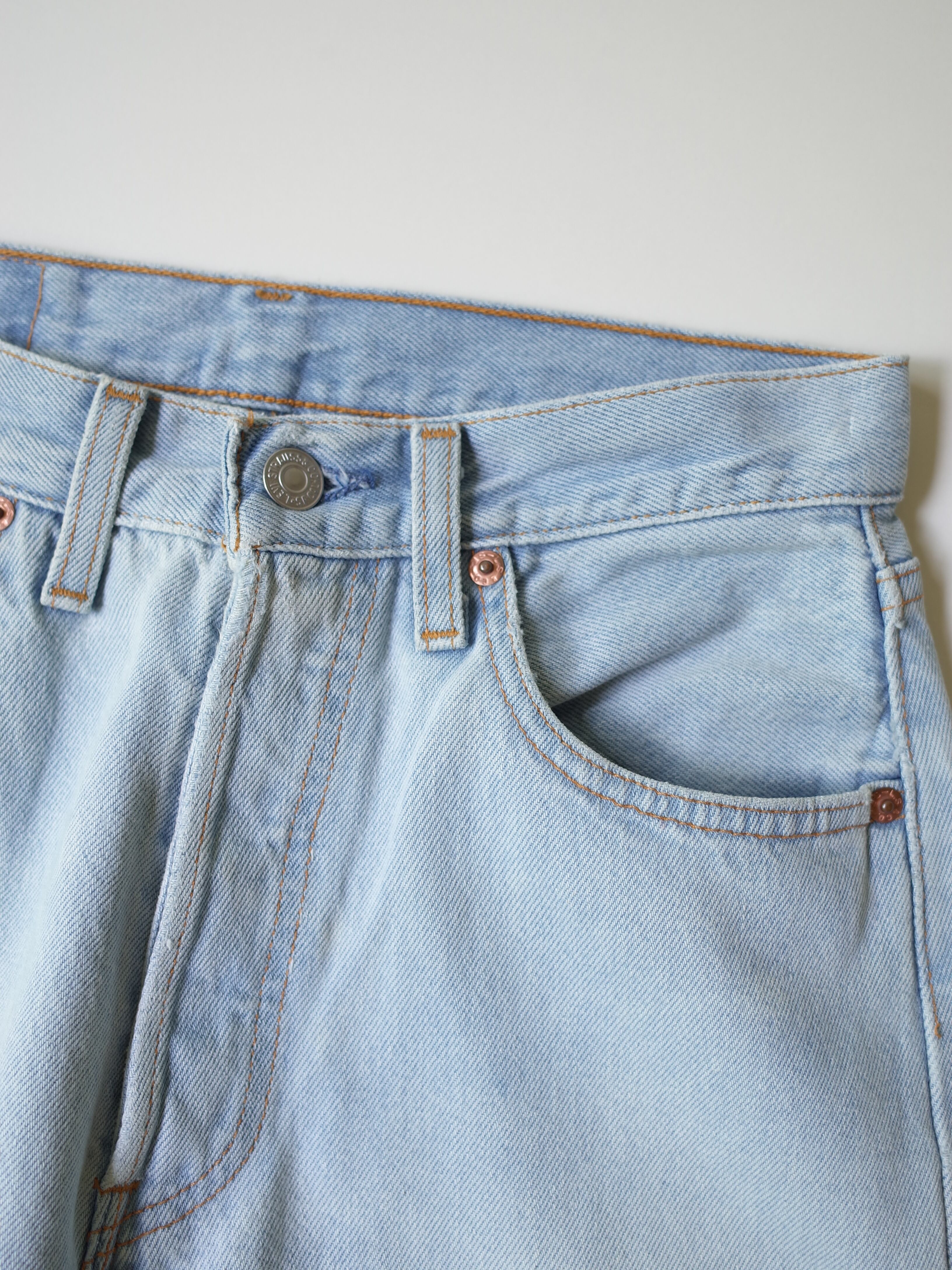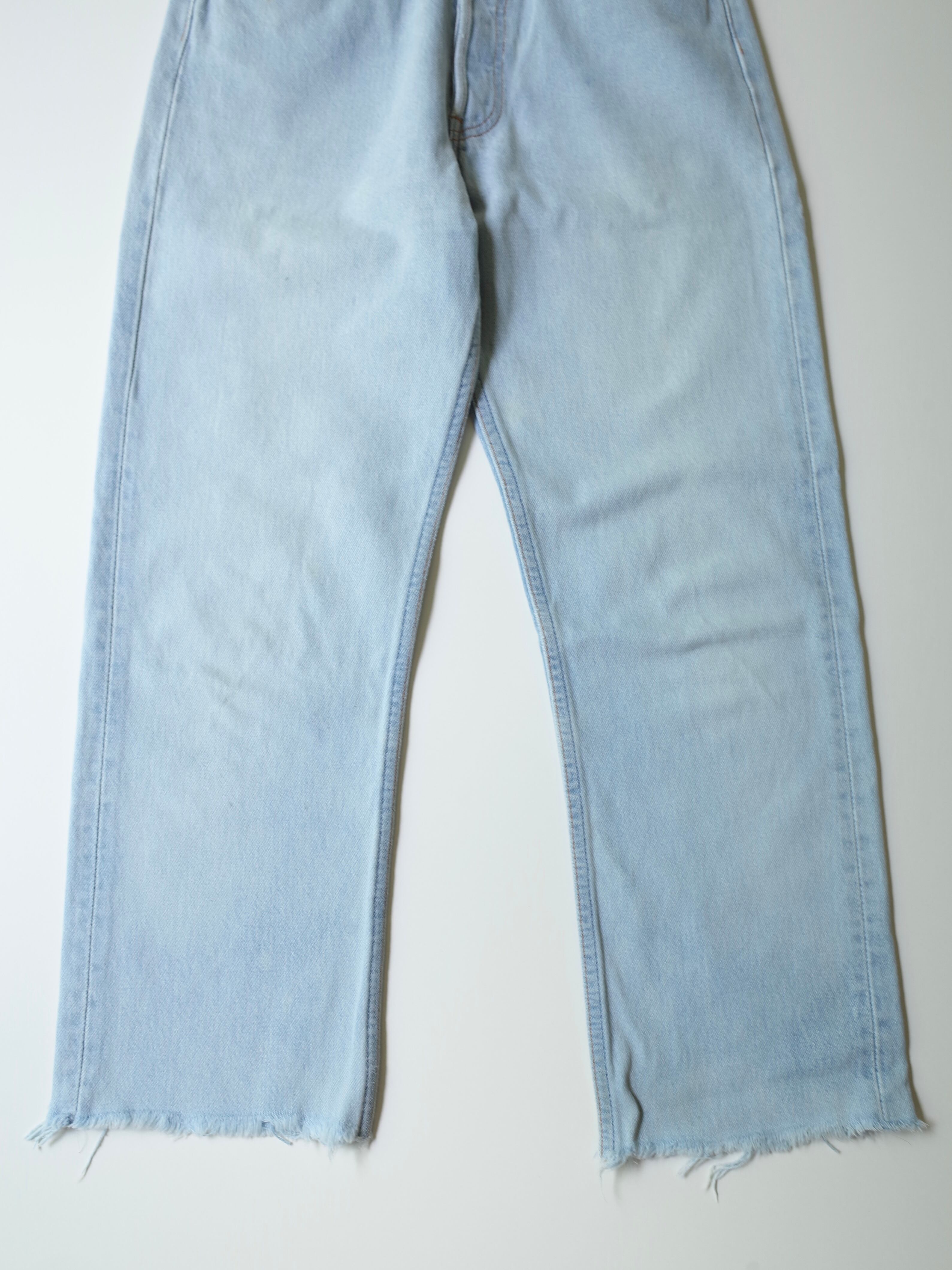 90年代製Levi's501のデニムパンツです。裾はカットオフになっています。色落ちしたライトブルーのカラーが夏ににぴったりの一本。Tシャツとサンダルで爽やかに履きたいジーンズです。