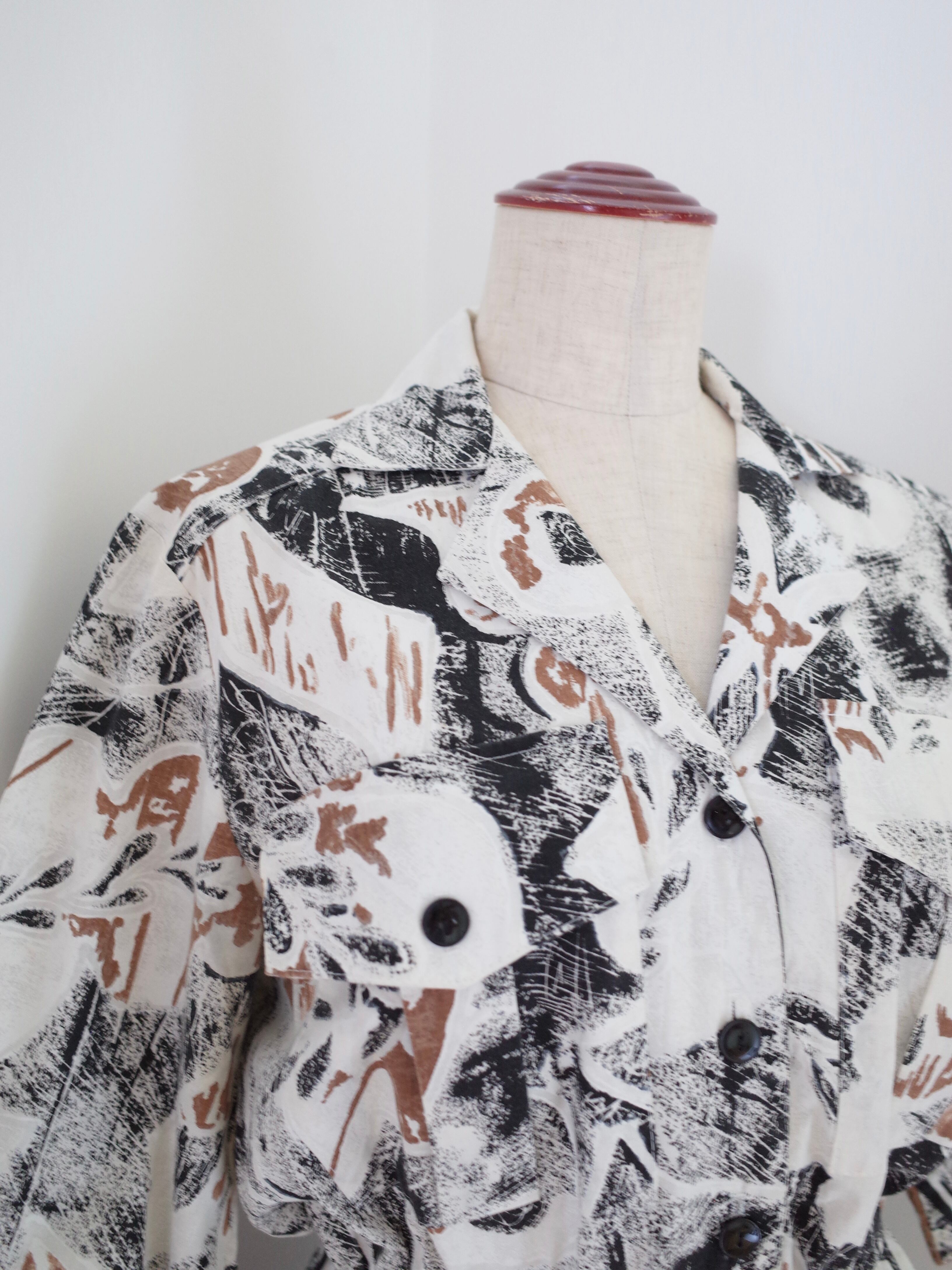シックな配色の上品な柄がかわいいワンピース。開襟で、袖は5部丈。大体膝下ぐらいの丈感になります。サラッとした生地感でウエストにゴムが入っているので着心地も◎ポケットも付いています。デニムなどボトムと合わせたり、前あきなので羽織ってスタイリングしてもGOOD!