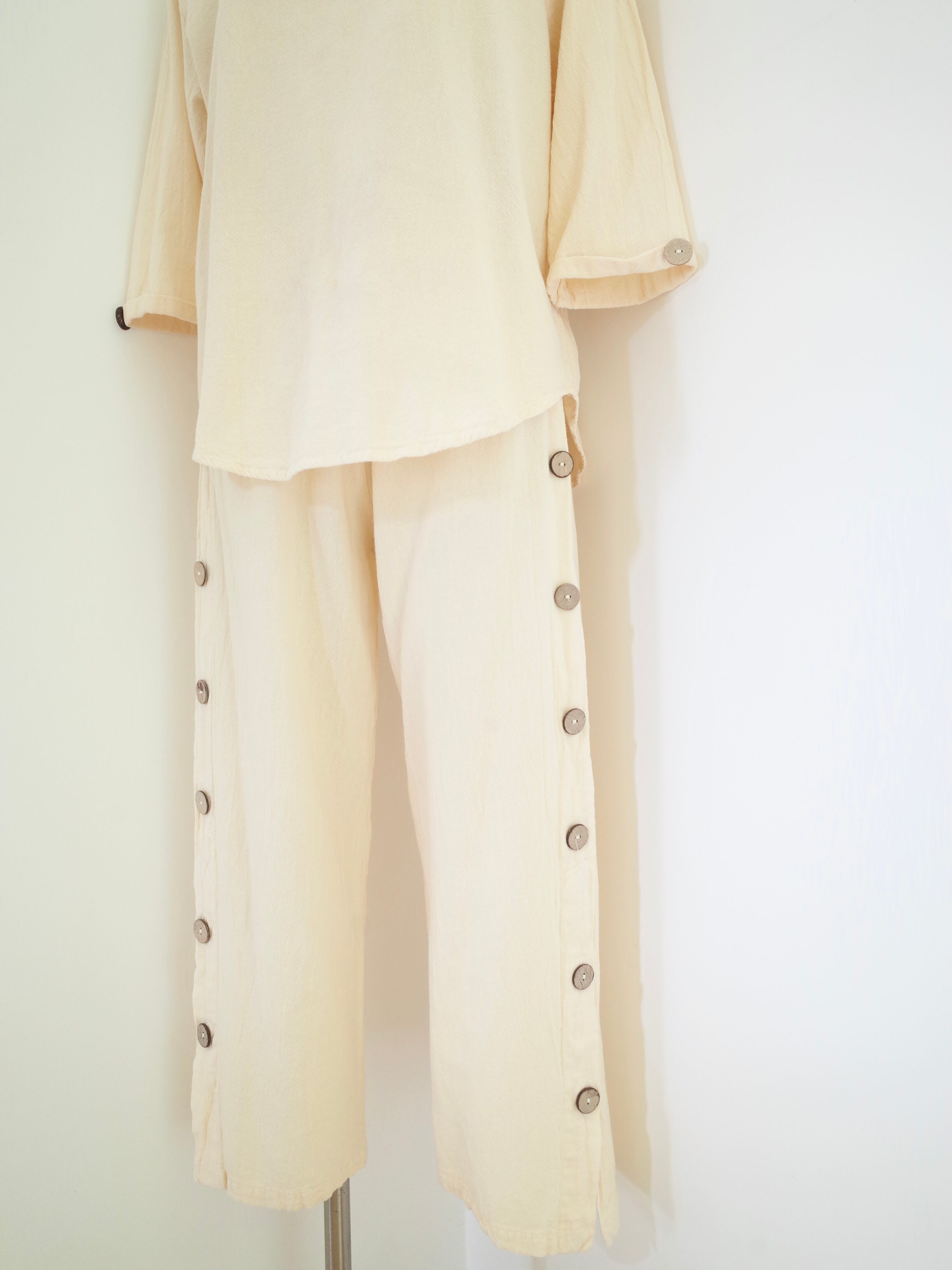 80年代アメリカ製、カリフォルニアのブランド"Sea Breeze"のコットンセットアップです。サラッとした肌触りで着心地抜群なイージーセットアップ。ラフな雰囲気で、ウッドボタンがポイントになっています。トップス、ボトムと別々にスタイリングしても◎使い勝手の良いセットアップです。