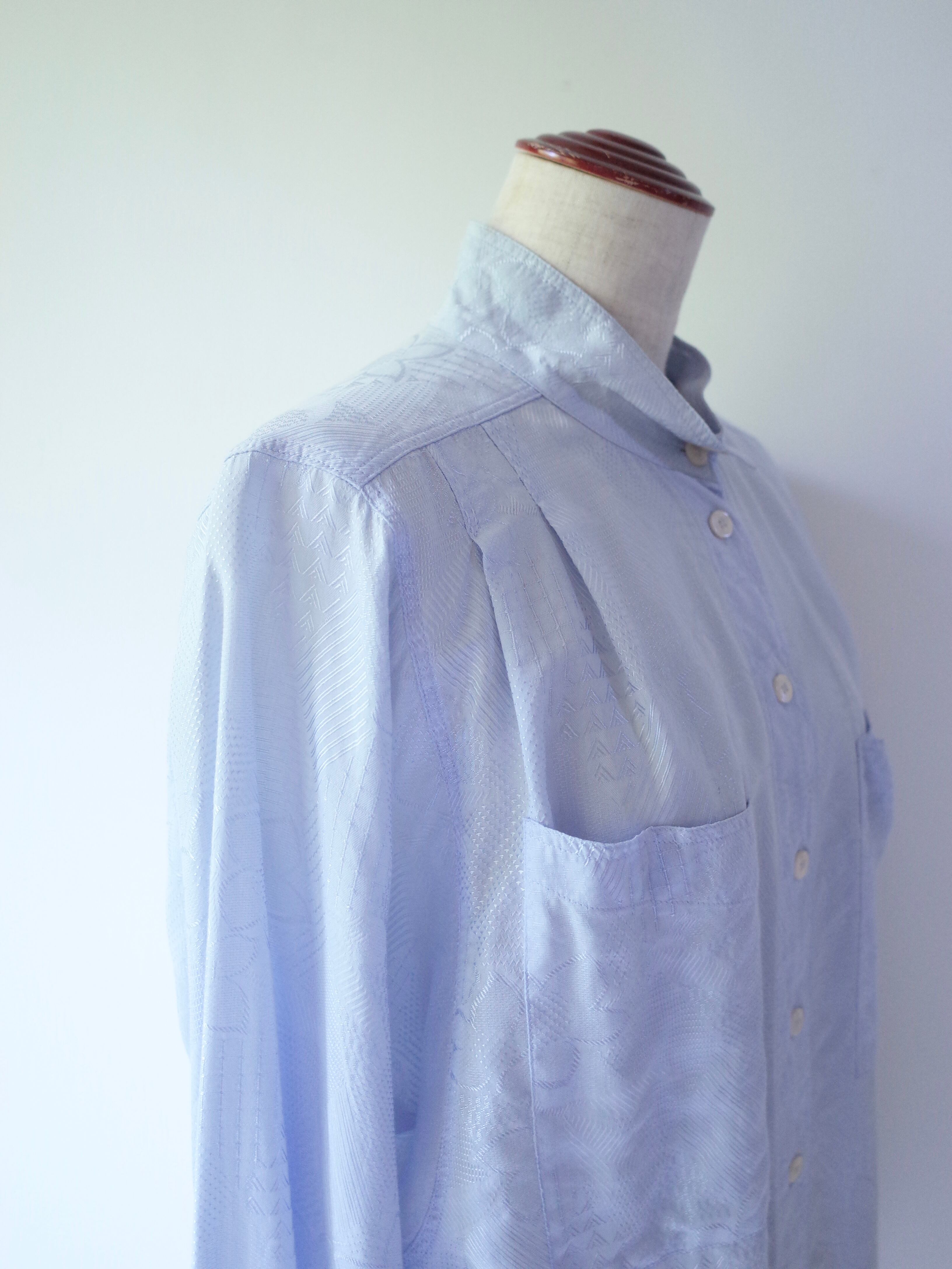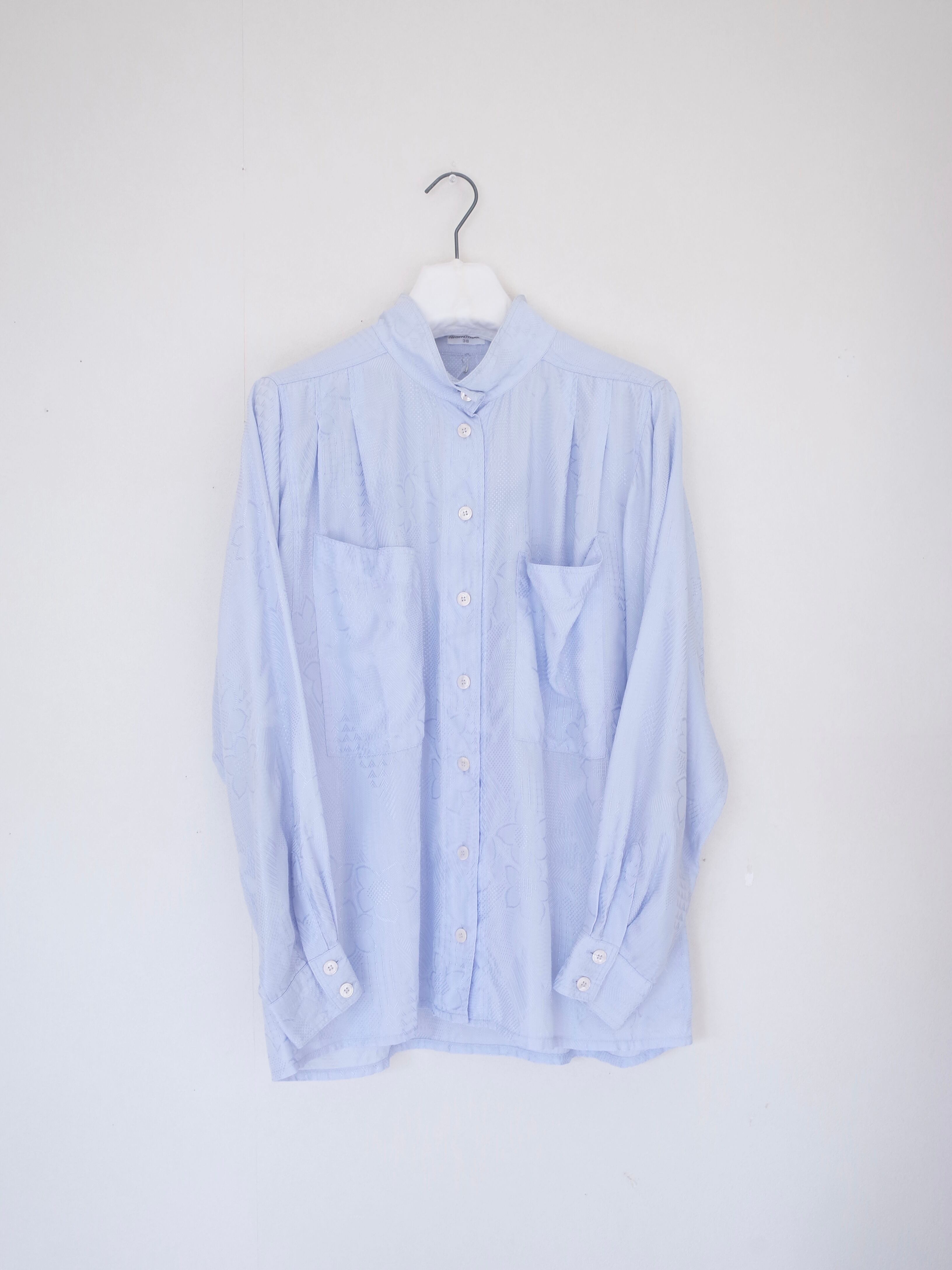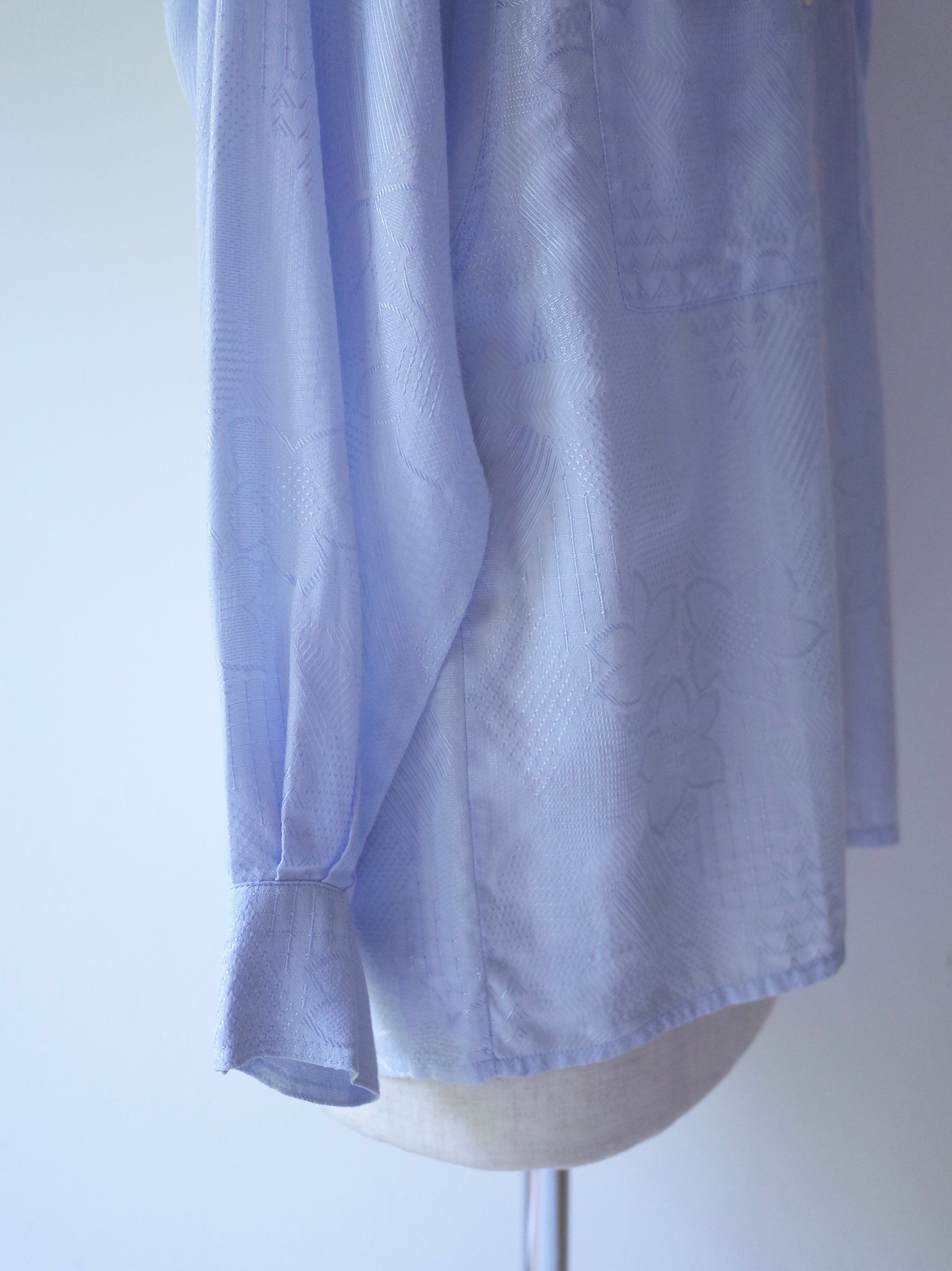 ドイツ製の花柄が織られた生地がかわいいシャツ。スタンドカラーですっきりとした首元に、優しいブルーのカラーもgoodです。広くとられた袖口が体のラインを華奢に見せてくれます。カジュアルにデニムで抜け感のあるコーディネートもおすすめです。