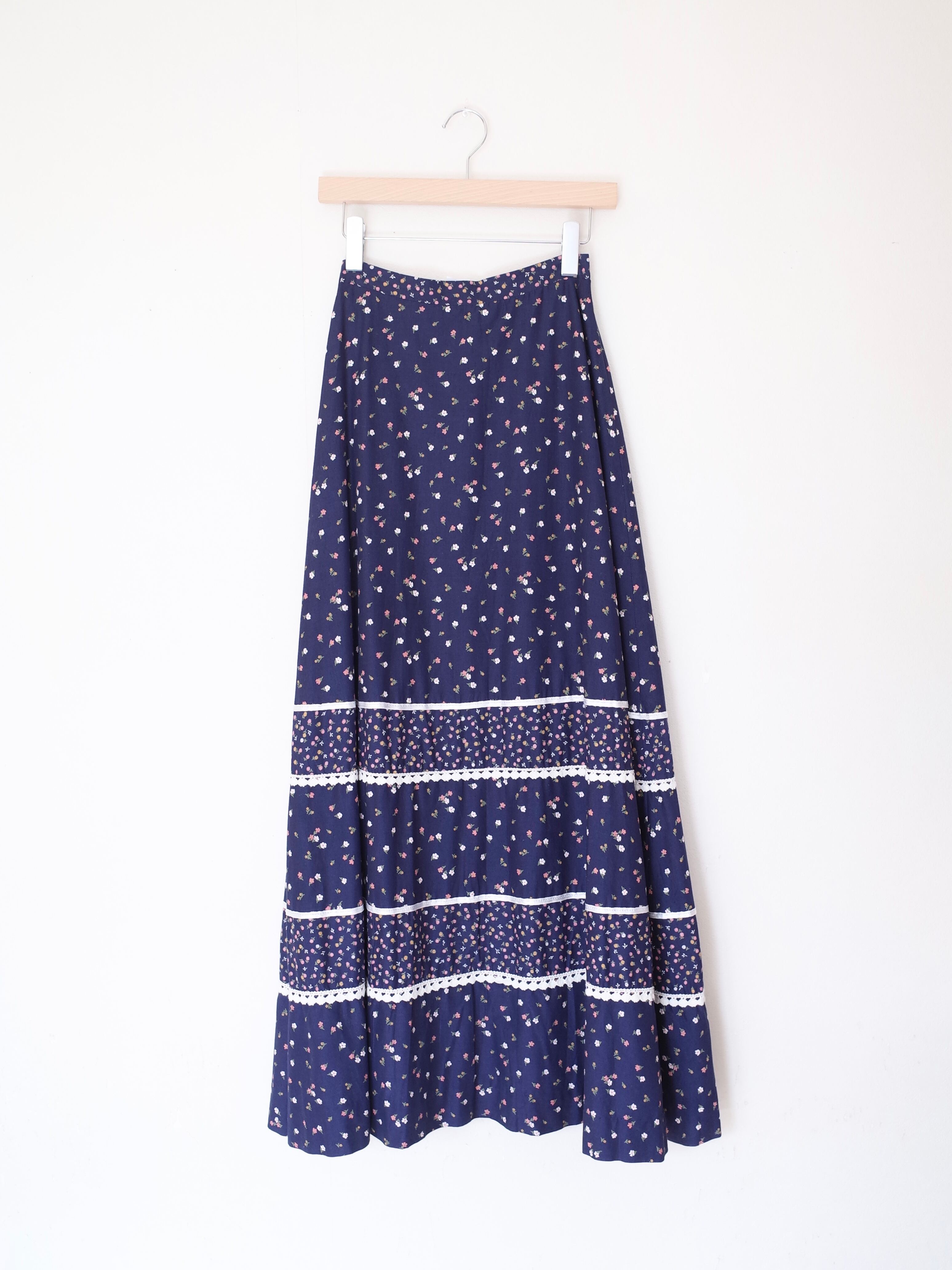 ユーロのロングスカート。花柄にリボンやレースがあしらわれた可愛らしい一枚。スウェットやニットで抜け感のあるスタイリングもおすすめです。