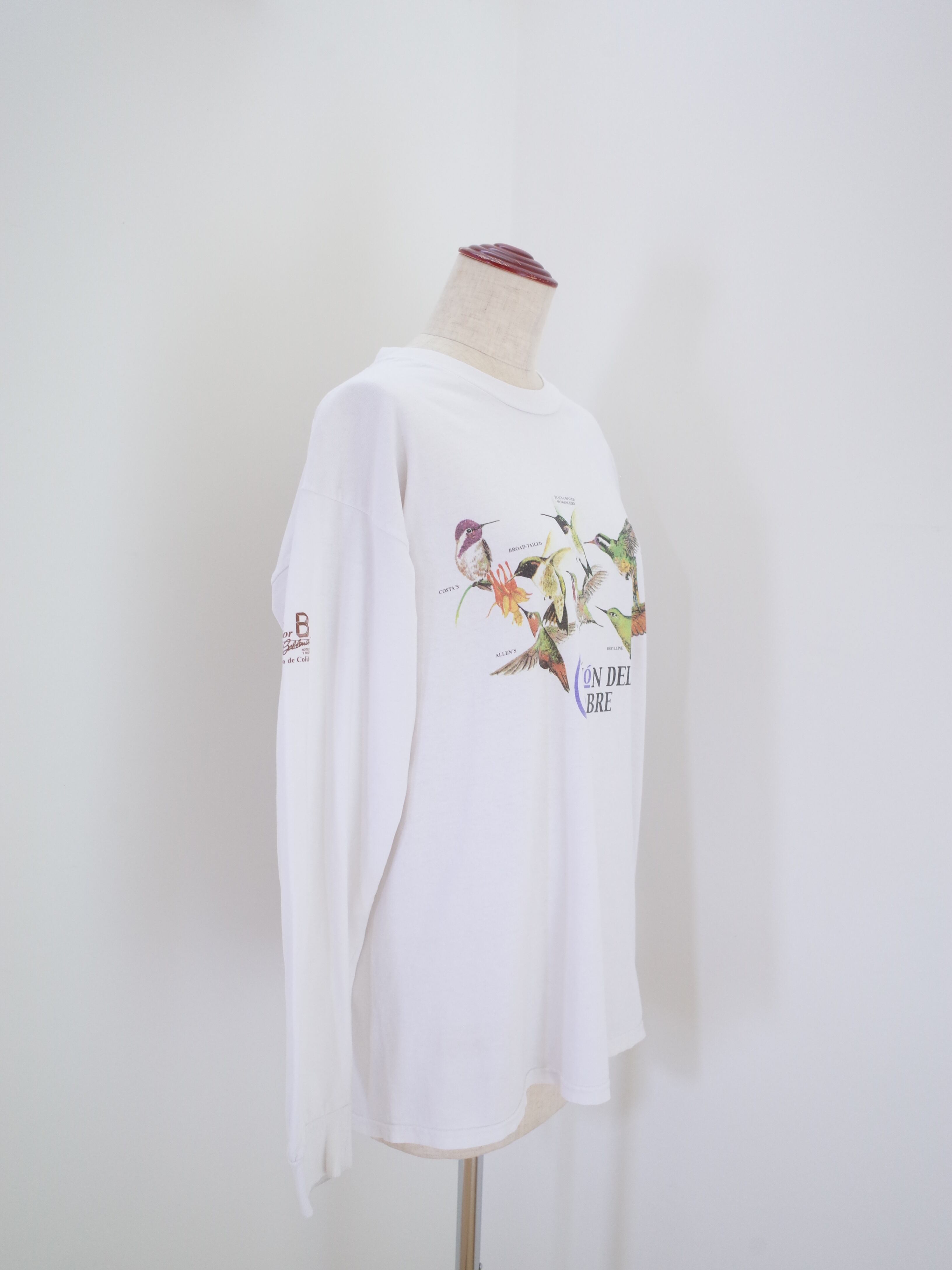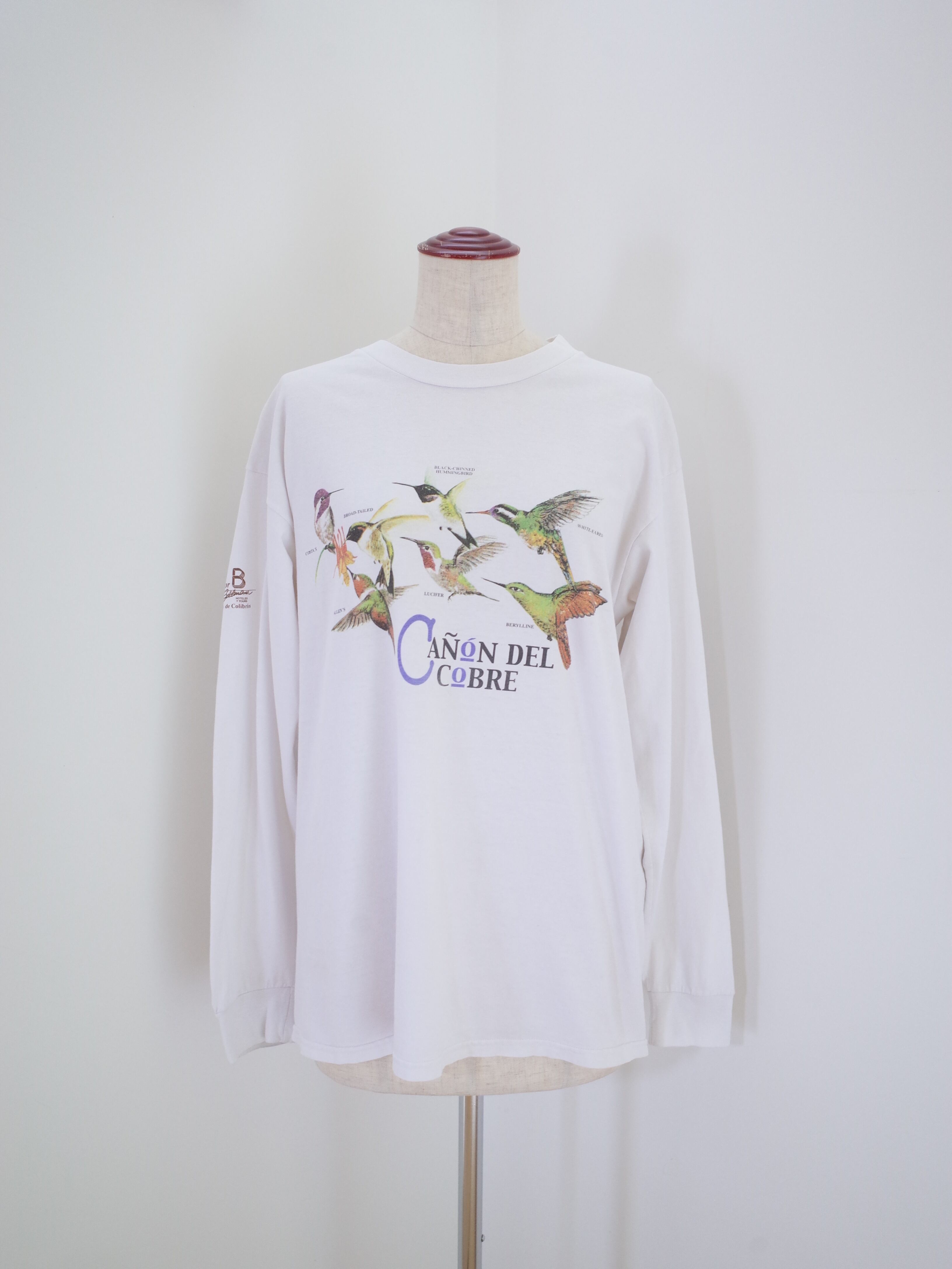 鳥図鑑のリアルプリントがかわいいロンT。ボディ両面+右袖にもプリントが施されています。最近、古着のロンTがなかなか見つけにくくなっている中で、こちらは貴重なgoodプリントの一枚です。