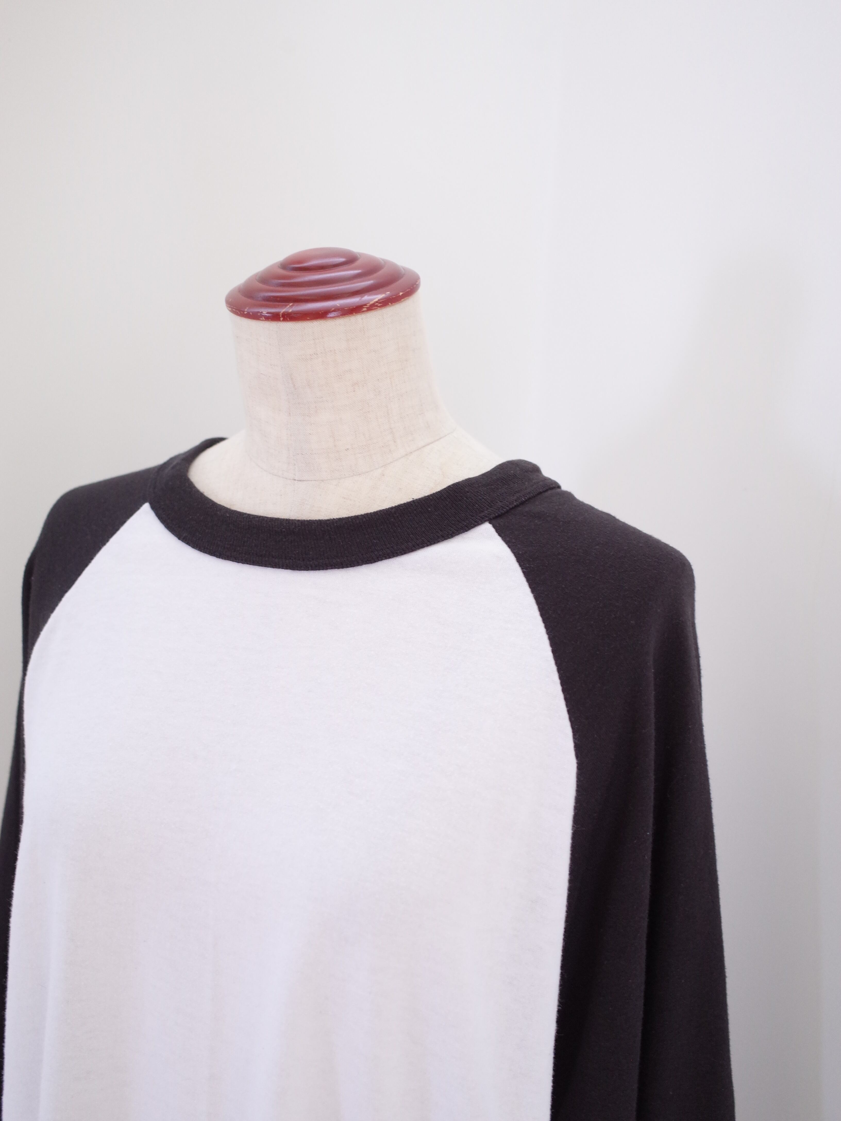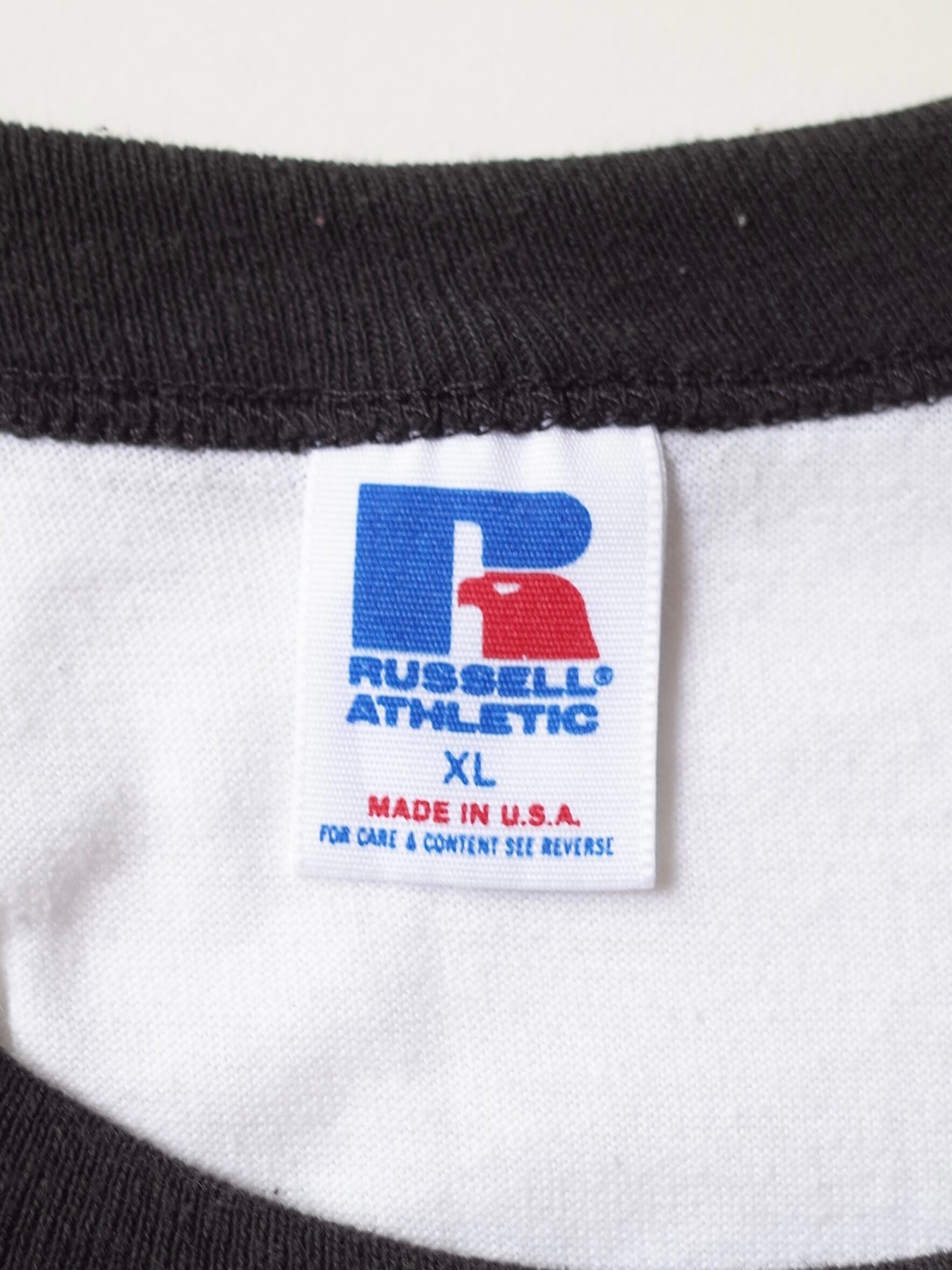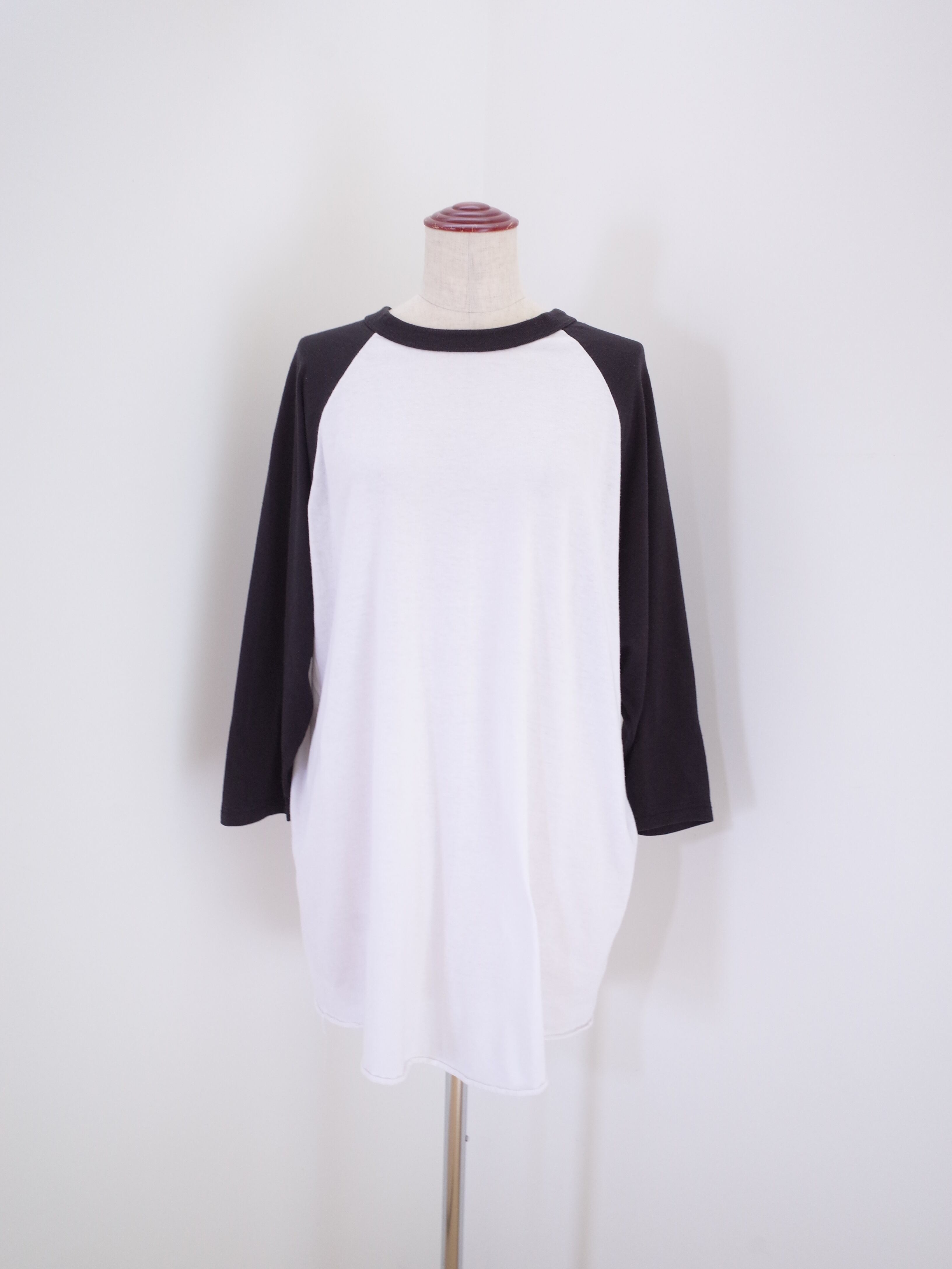 90年代アメリカ製RUSSELL ATHLETICのラグランスリーブの無地Tシャツ。ホワイト×ブラックの合わせやすいカラーリングです。大きめXLサイズで、丈も長め。アクセサリーでアップデートしたスタイリングも◎