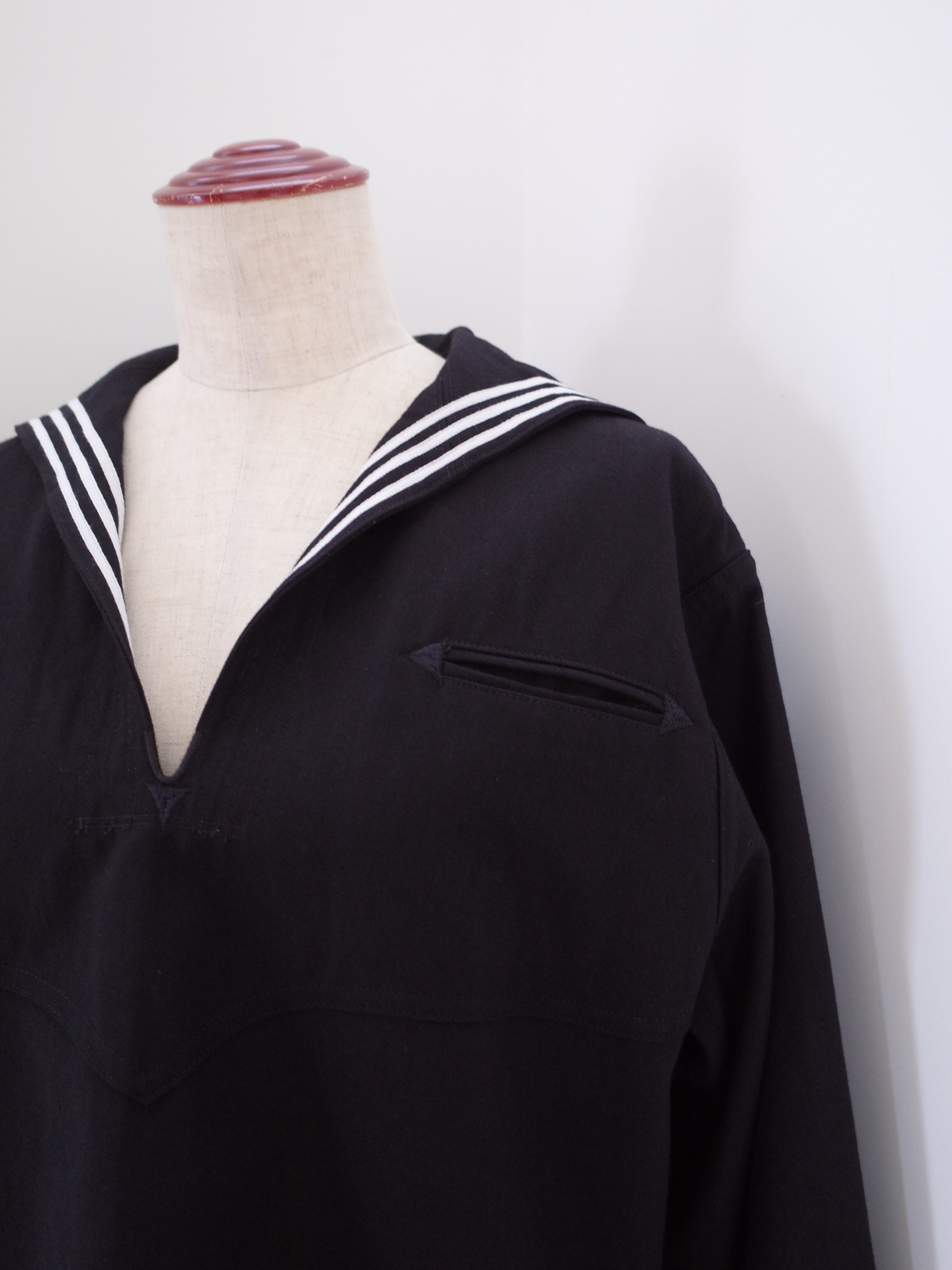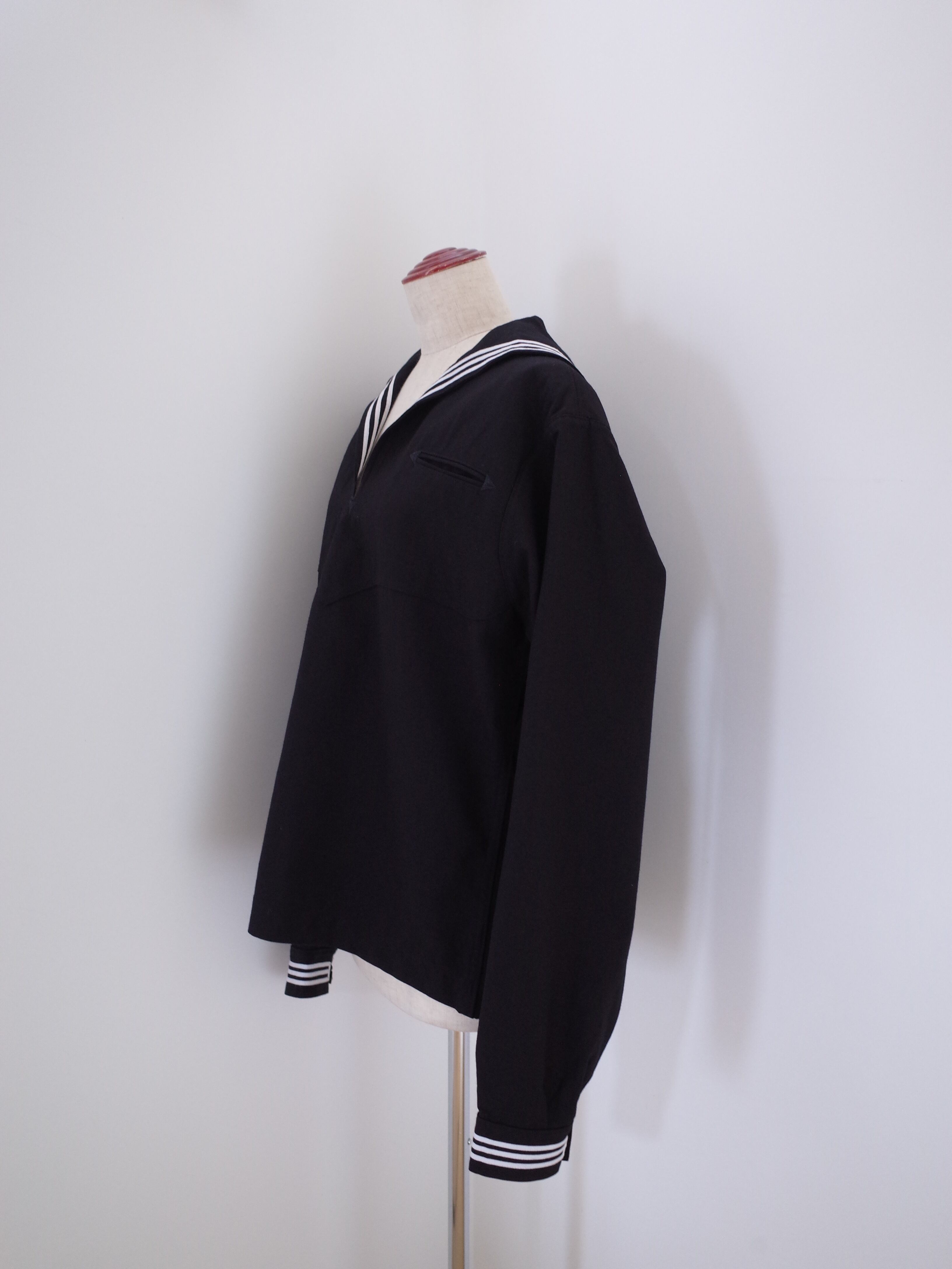 アメリカ軍のセーラーシャツ。しっかりと目の詰まった上質なウール素材です。ゆったりと着用可能な44Lサイズ。インナーにハーフジップのスウェットやタートルネックのカットソーを合わせたり、ボトムはロングスカートやスラックスパンツで綺麗目に。さらにアクセサリーでアップデートして。カラーがブラックなところもスタイリングしやすさのポイントです。