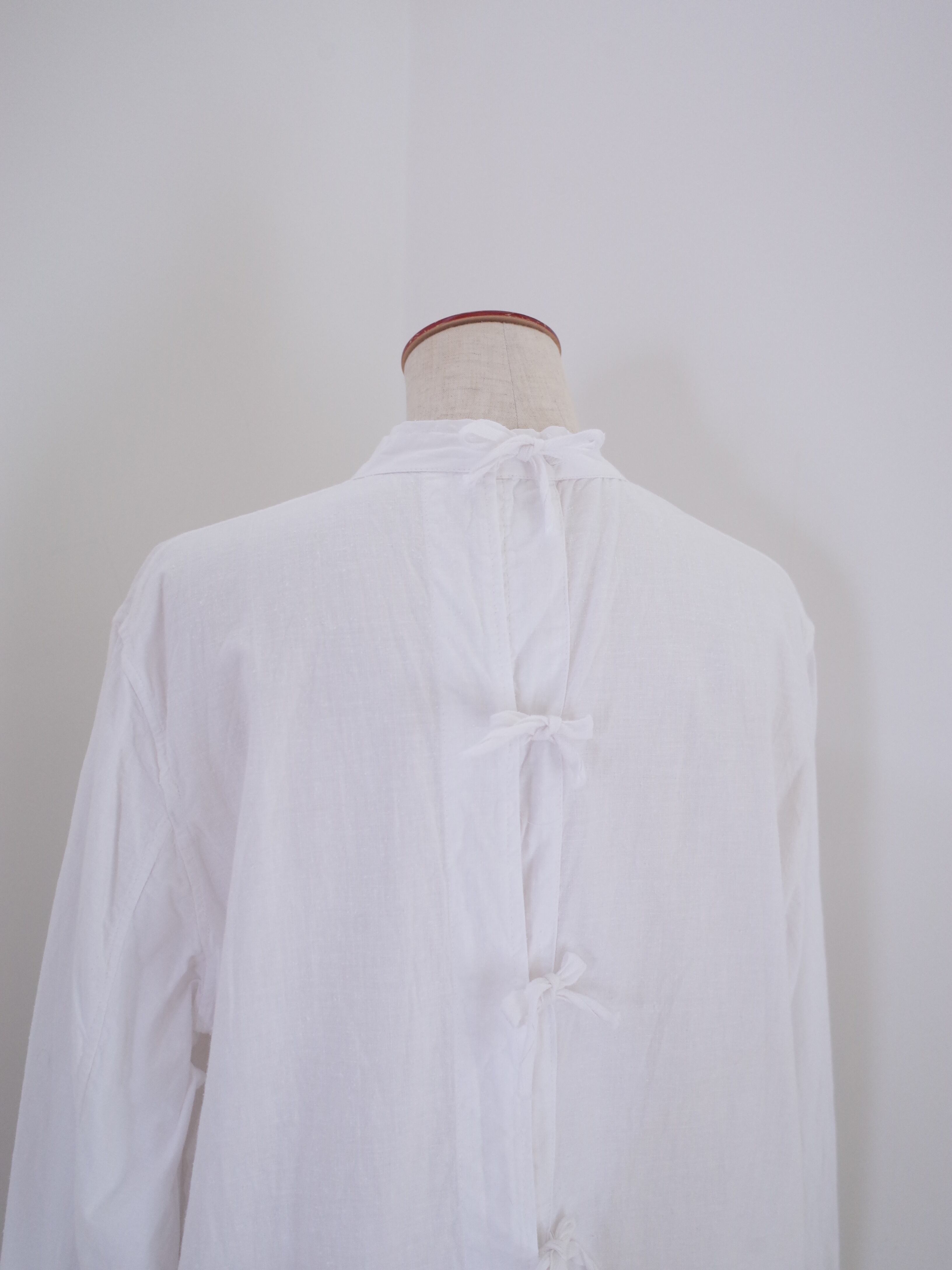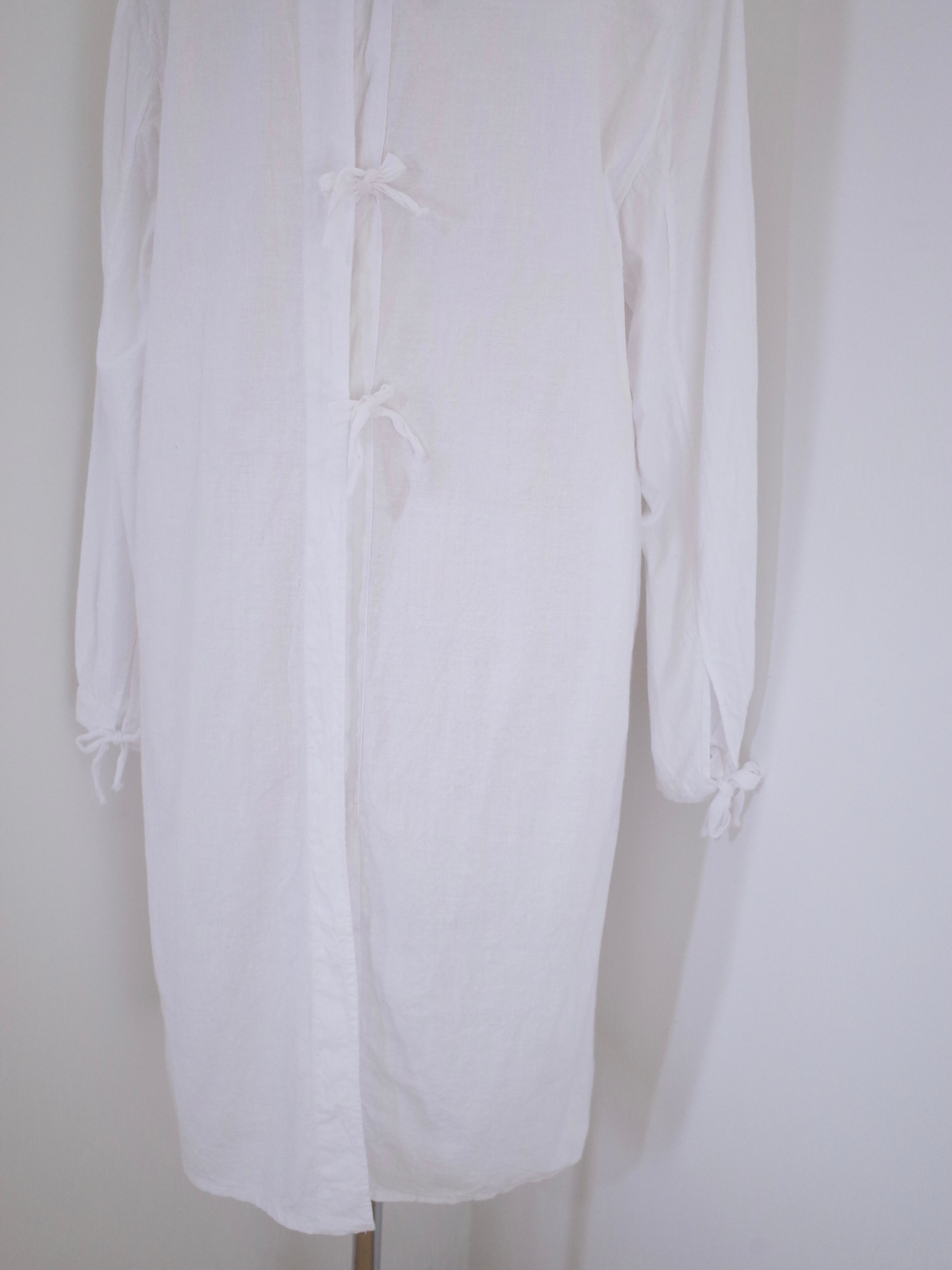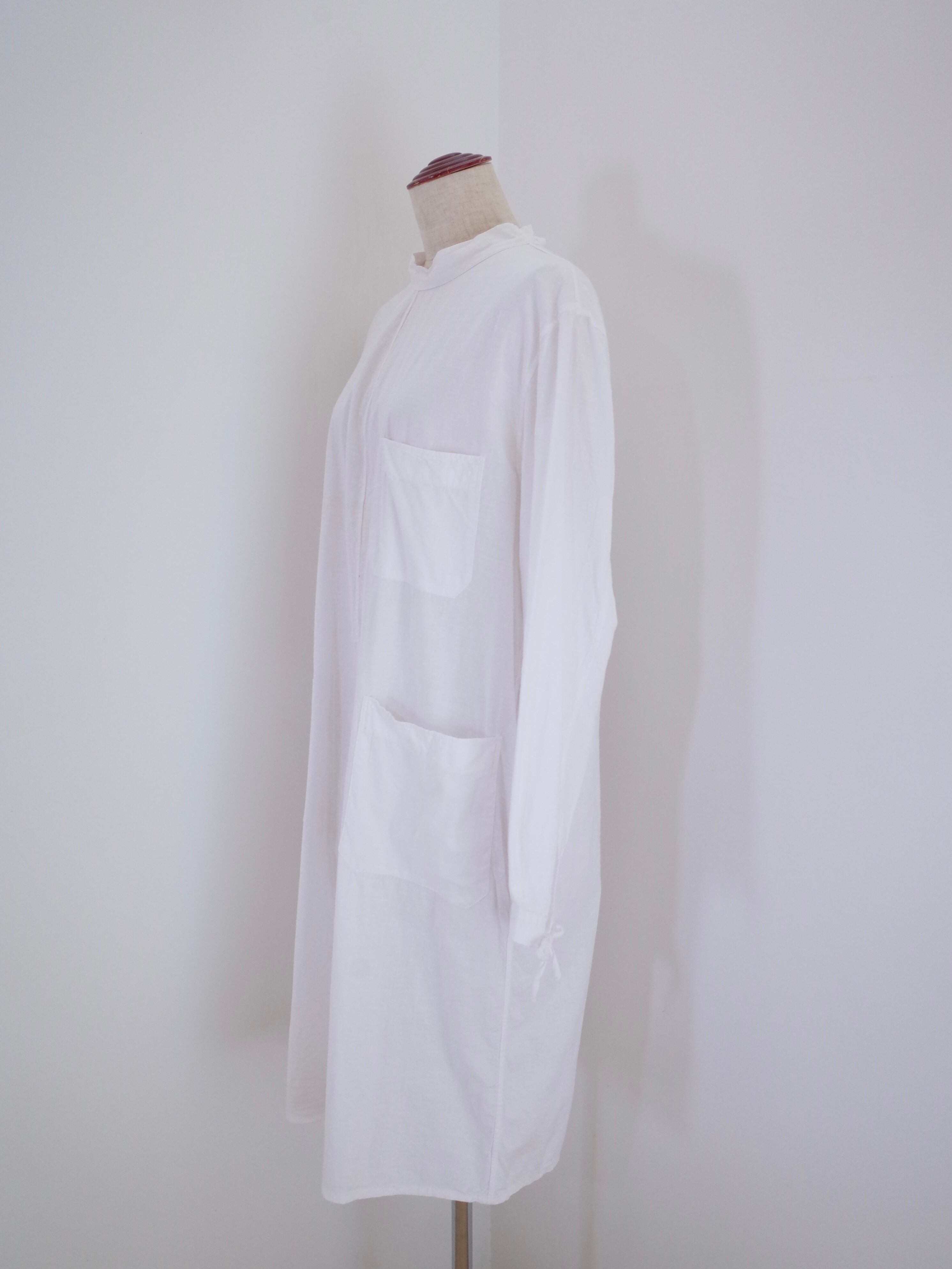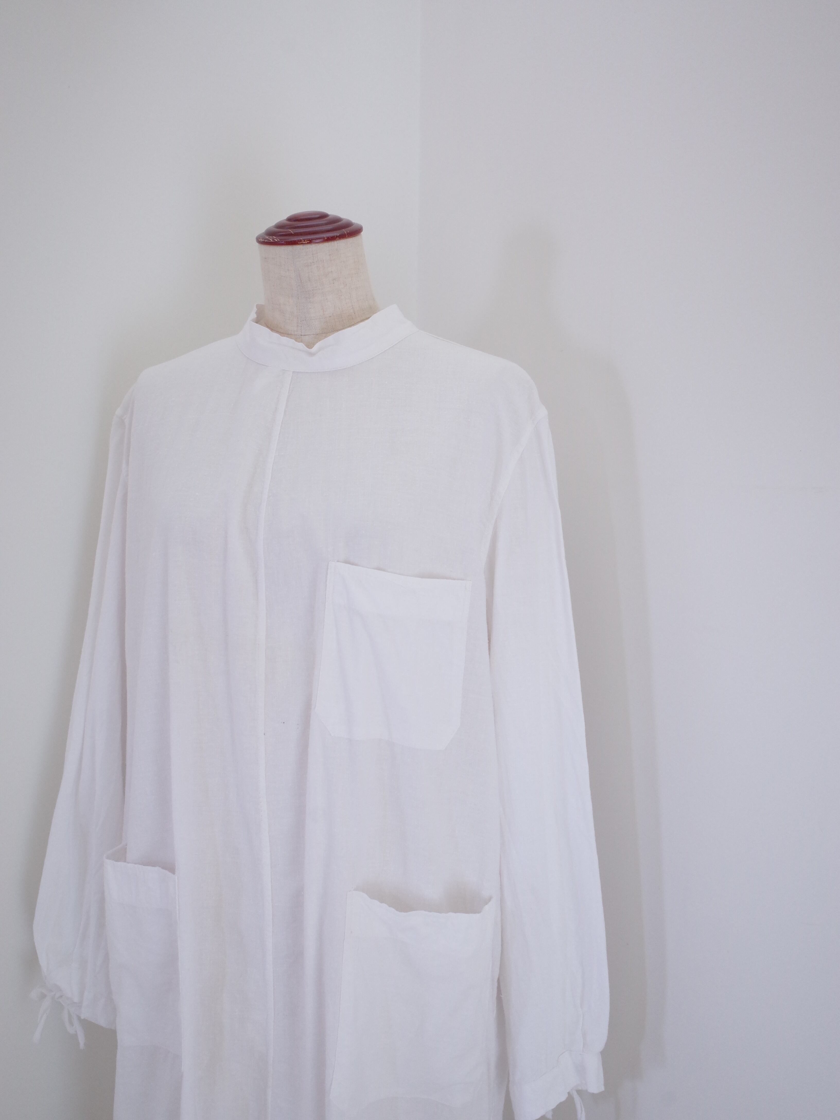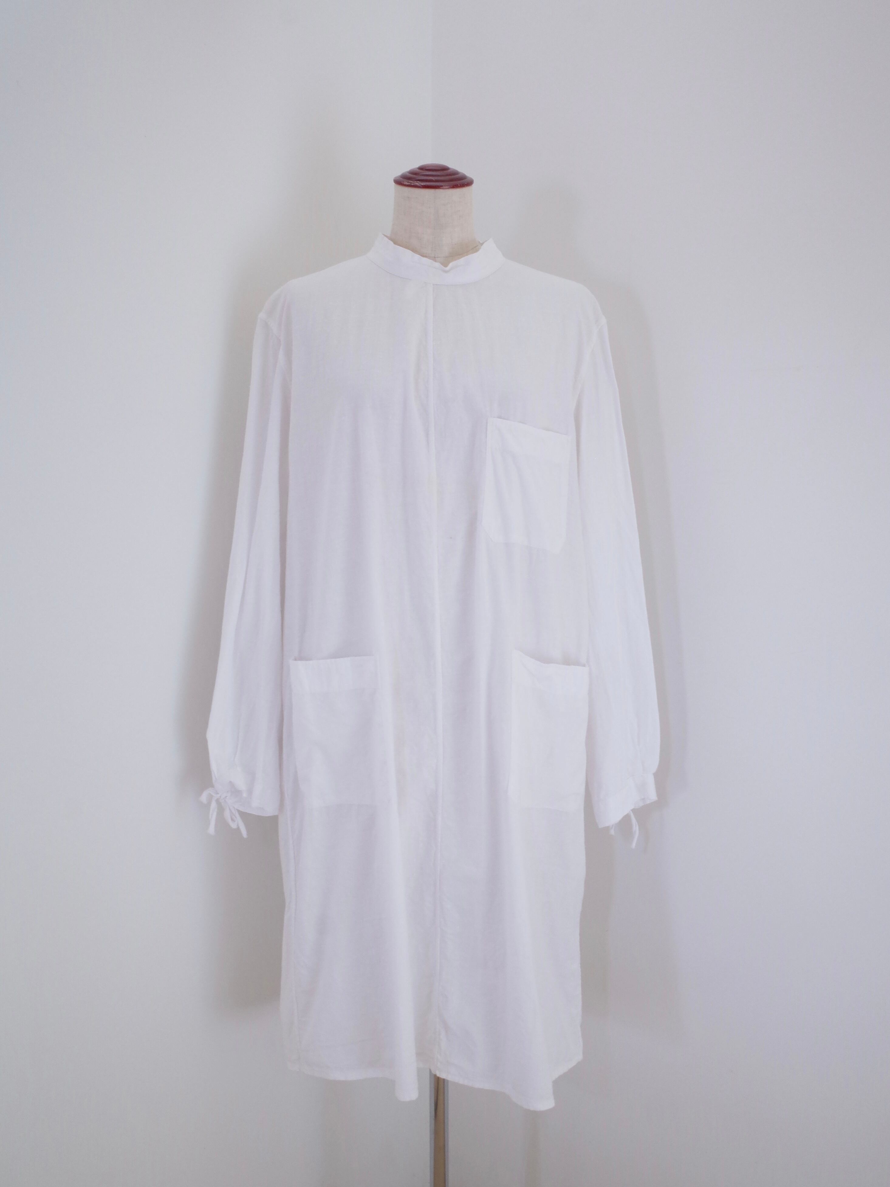 ミリタリーのサージカル(メディカル)ガウンドレス。軍で医療用として使われていたもので、本来はポケットが前にくるようにして背中で紐を結び着用しますが、前後ろ逆にして羽織のようにして着るのもおすすめ。背中や手首についた紐を結ばないで垂れ下がったまま着ても可愛いです。