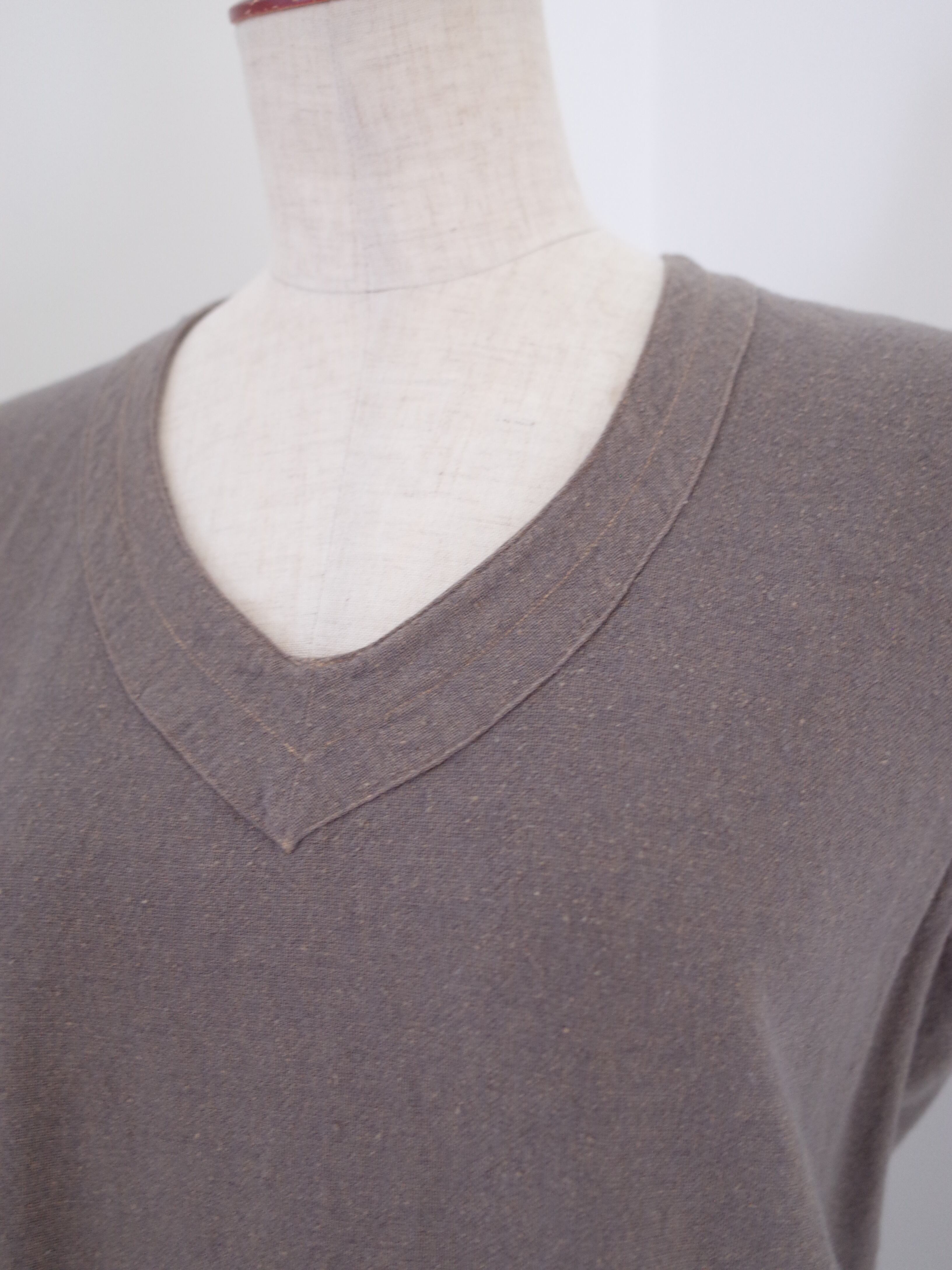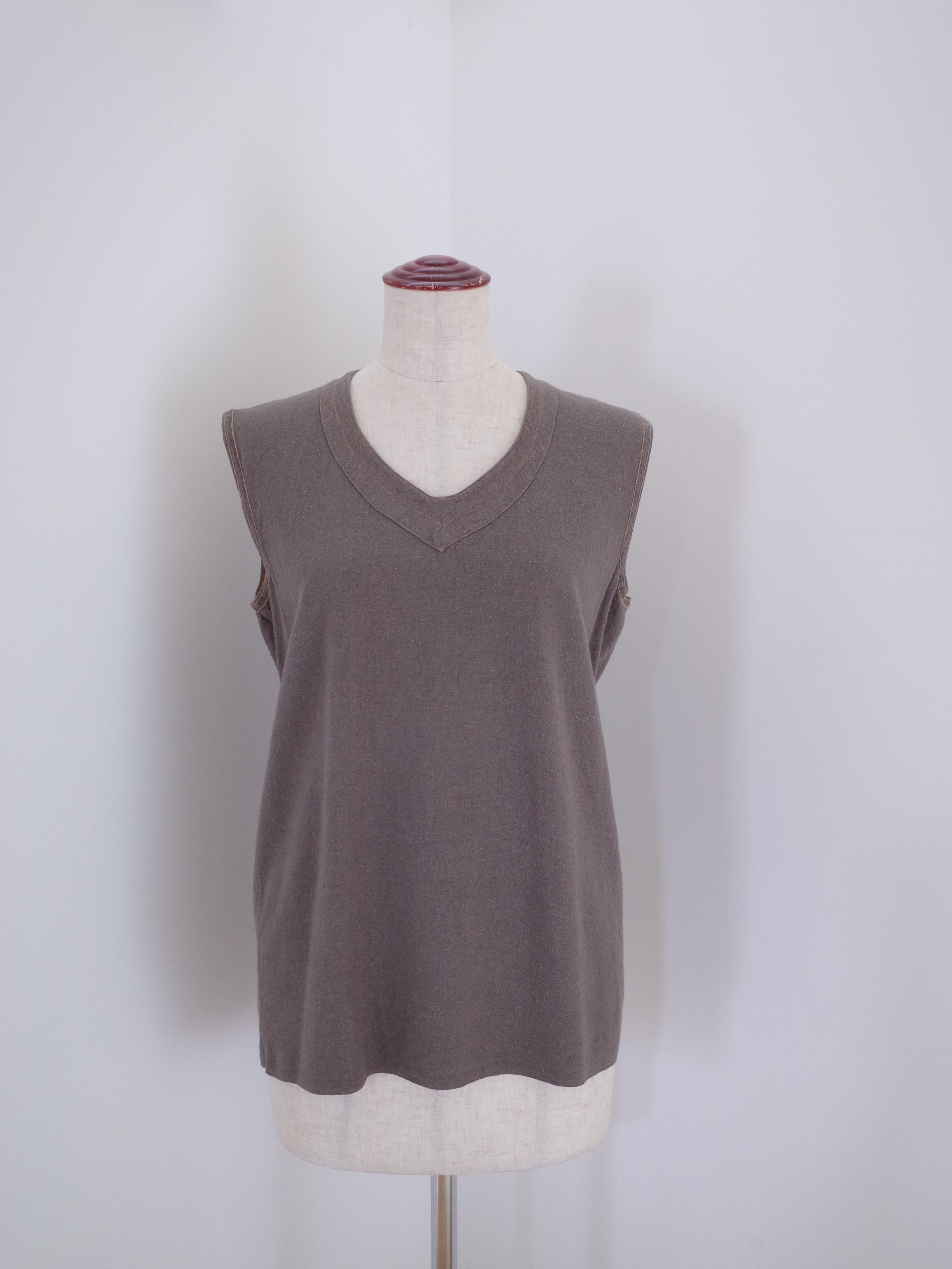 50年代のフランス軍サージカル(メディカル)ウールベスト。クリーム色だっだものをベージュがかったグレーのような塩梅の良い中間色に後染めされています。シルエットは、身幅がやや細いすっきりとしたライン。軍物ですが、染めを施したことで綺麗目アイテムとしても使える印象です。薄手のウールのような素材なので、シャツやカットソーとレイヤーしたり、タートルネックのニットなどと合わせるのもおすすめです。