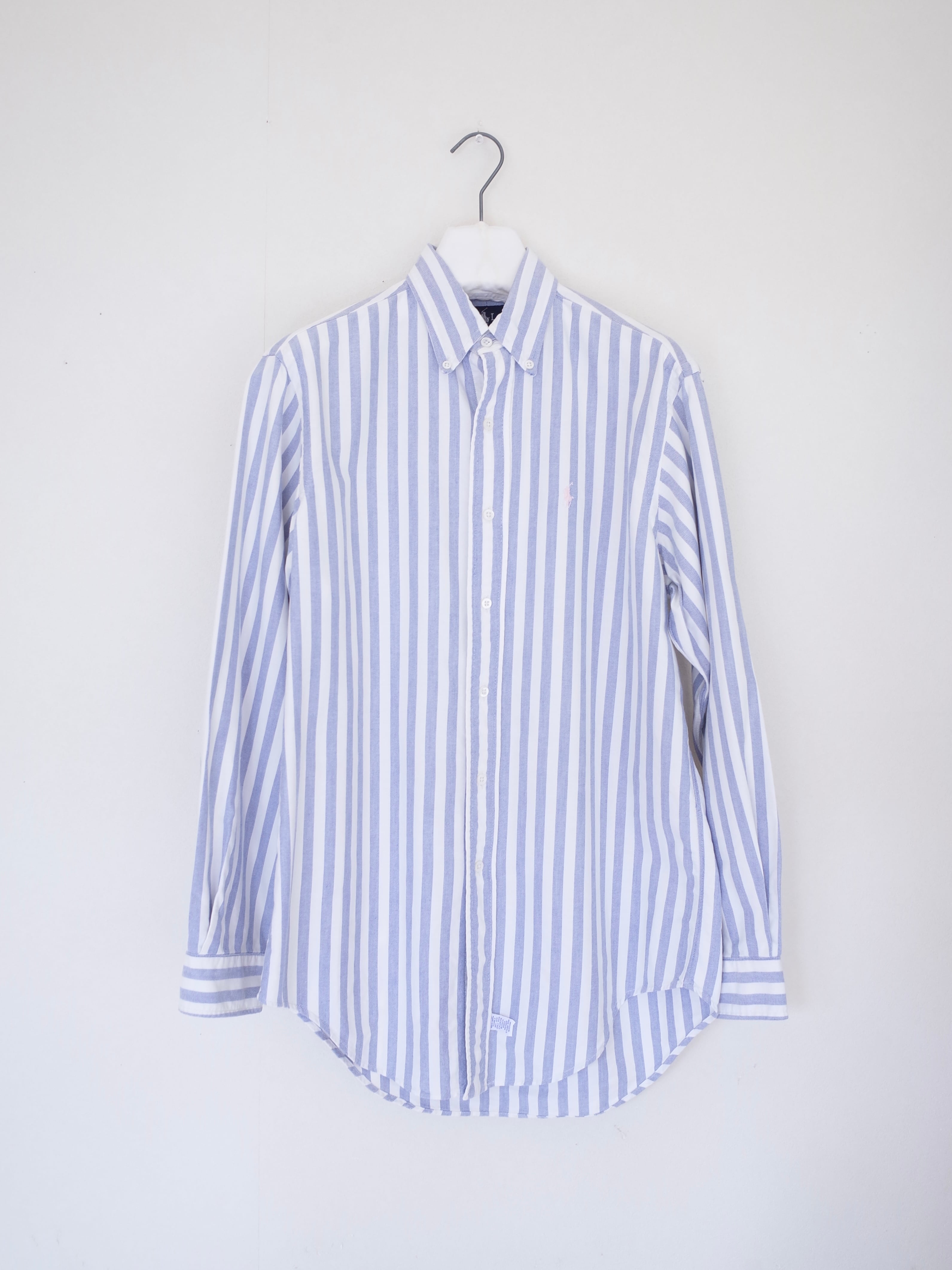 90年代製Ralph Laurenのストライプシャツ。メンズのゆったりとしたサイズ感。レイヤードスタイルにも映えるピッチが太めなブルーとホワイトカラーのストライプです。ジャケット、スウェット、ニットの下に。幅広いスタイルに活躍するスタンダードなアイテムです。