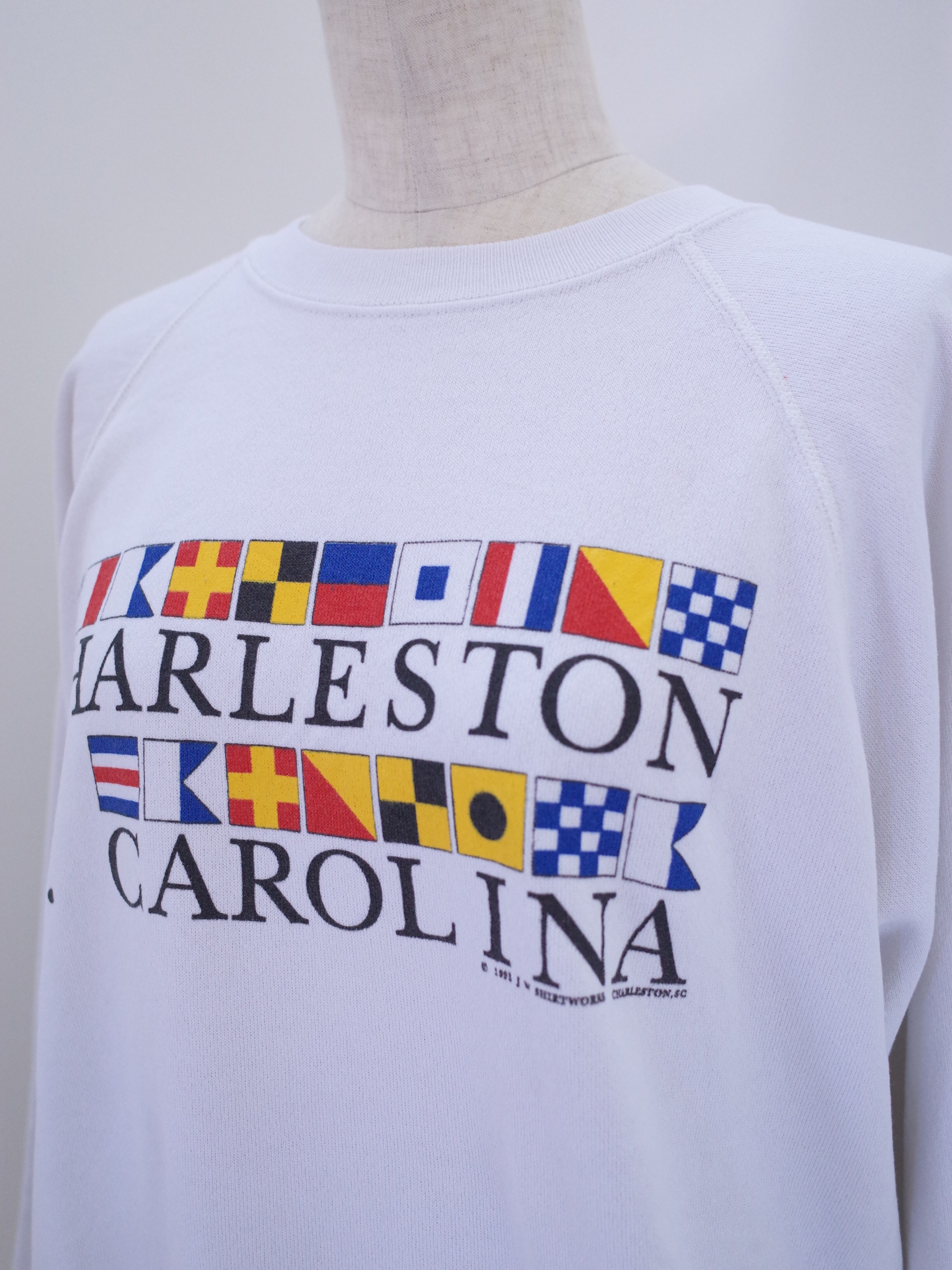 90年代アメリカ製Hanesボディのスウェット。チャールストンはサウス・カロライナ州にある都市。海において船舶間での通信に利用される世界共通の「国際信号旗」がプリントされた一枚です。