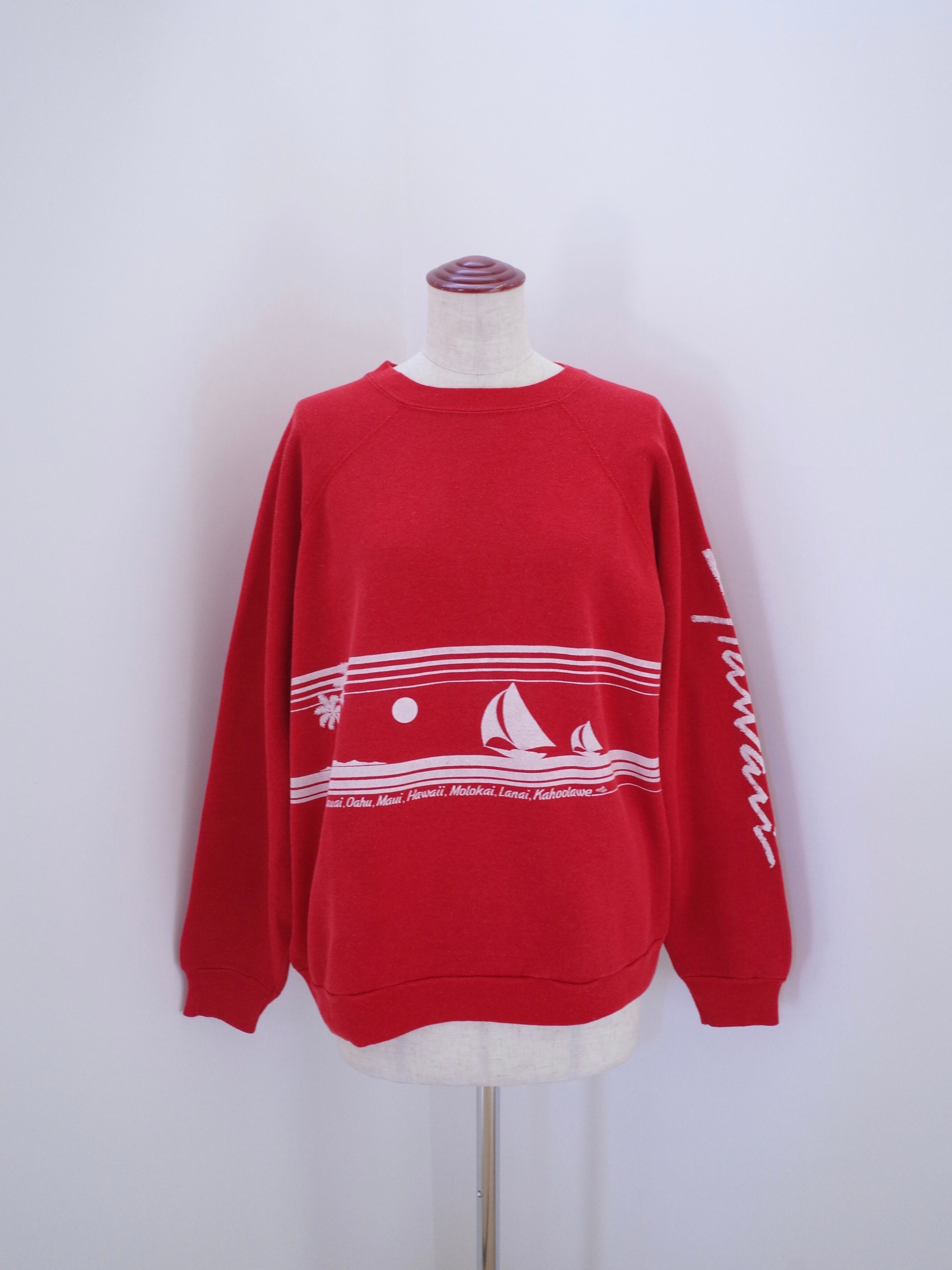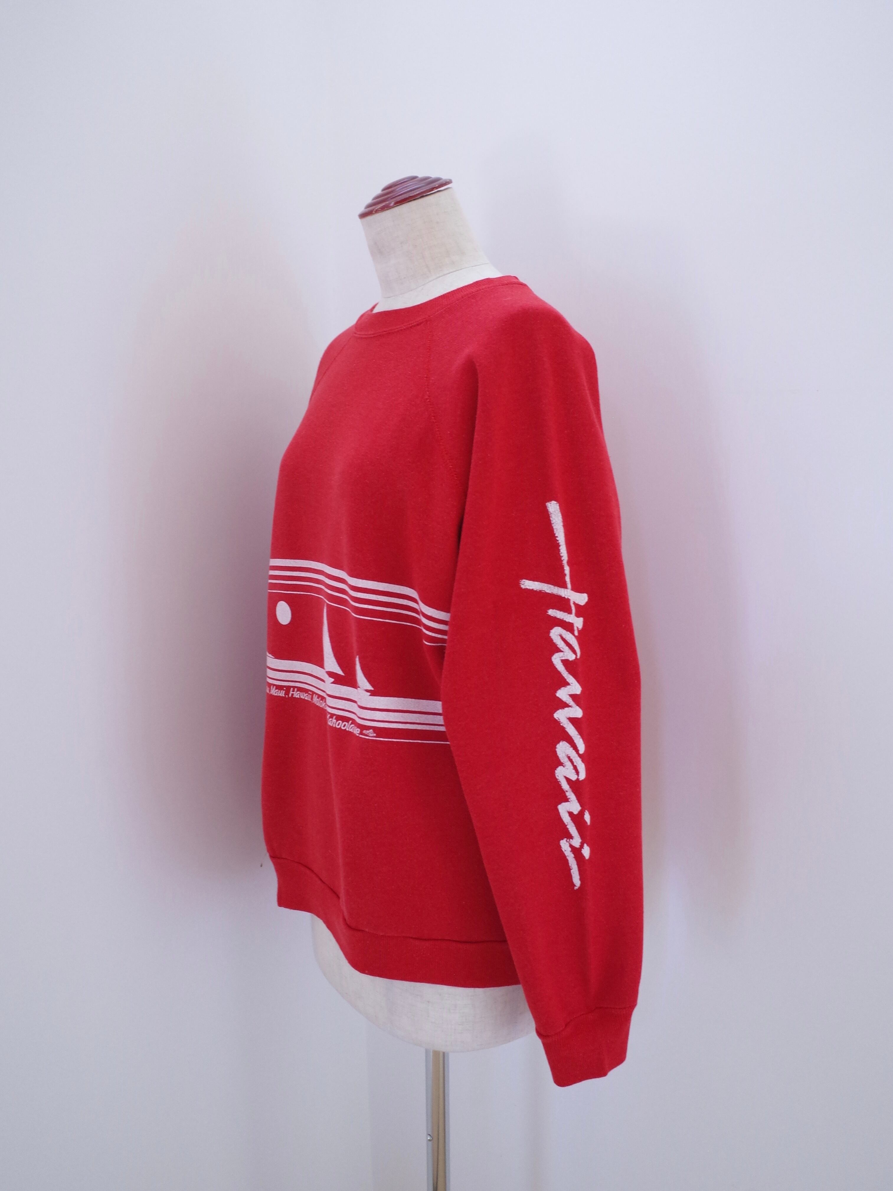 80年代製ハワイのスウェット。差し色になるレッドにホワイトのプリント。左袖にはHawaiiの文字。ブラックデニムと合わせたスタイリングも◎80年代らしい雰囲気の一枚です。