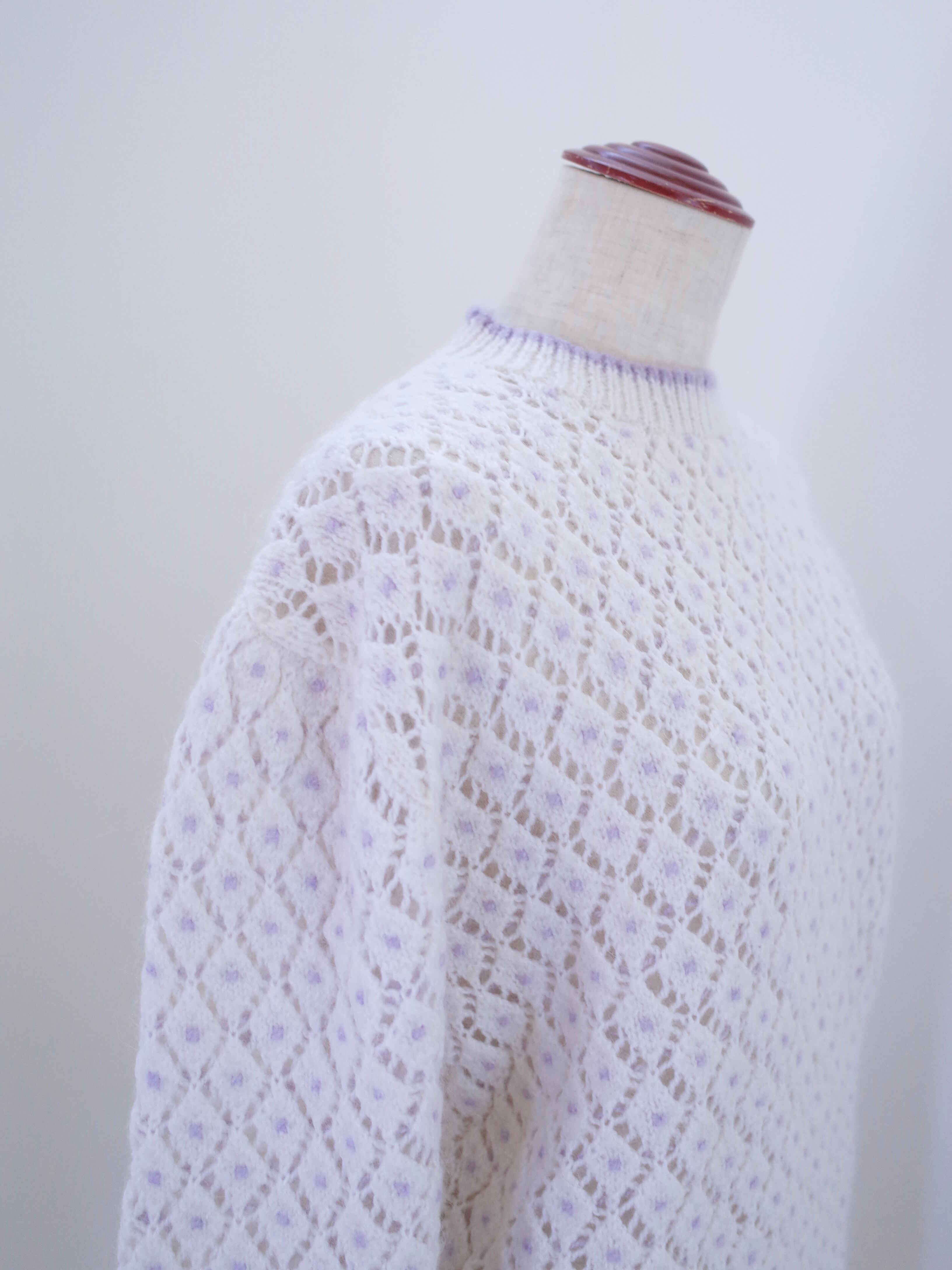 透け感のある編み方がかわいいニット。ホワイトに優しいパープルのカラーもgoodポイントです。毛足の長いモヘアのふわふわとした質感のニット。手首が綺麗に見える長めの袖のディテールも◎デニムはもちろん、綺麗目なスラックスやロングスカートとのスタイリングもおすすめです。
