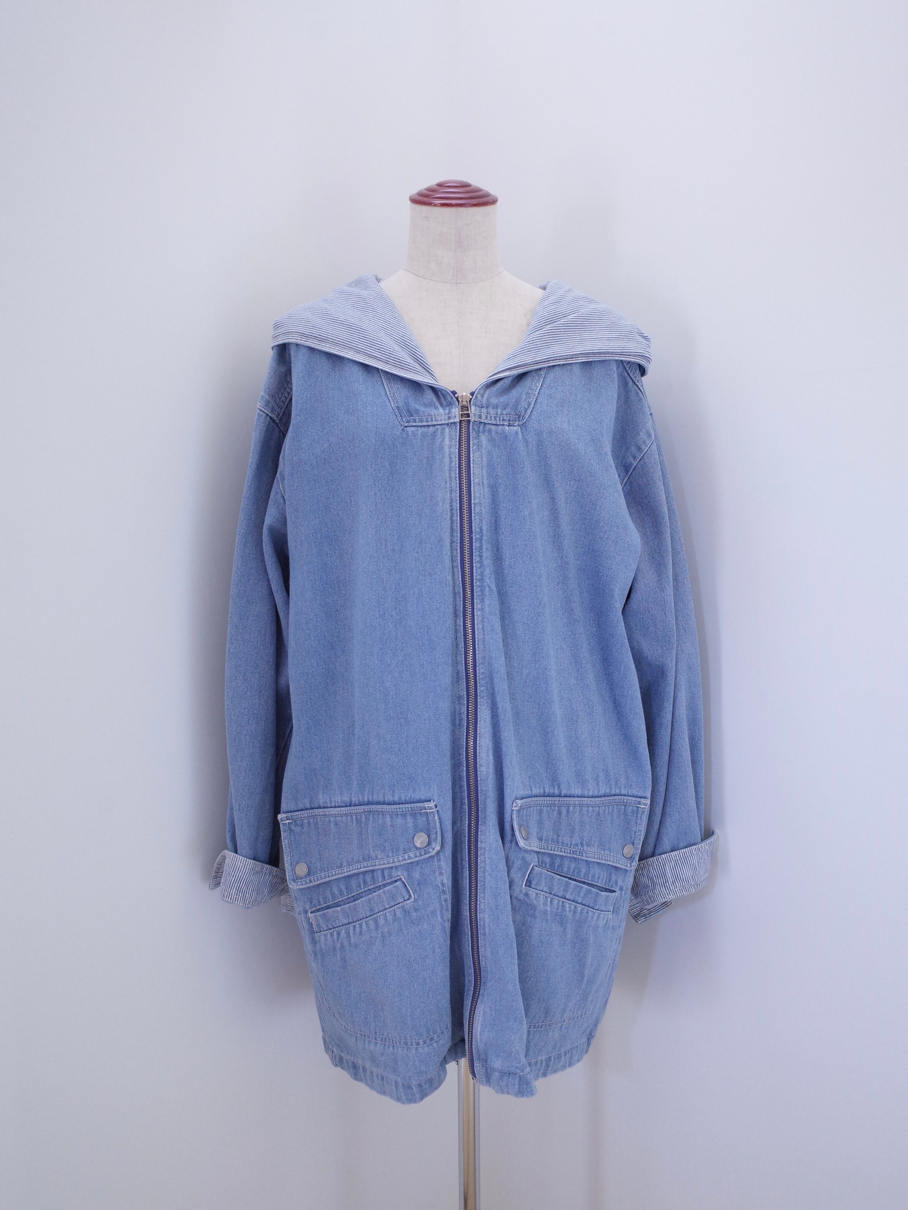フードの付いたデニムジャケットです。フードの中や、袖をロールアップした時にチラッと見えるストライプ柄もGOODな一枚。今の時期は、スウェットやカットソーの上から。もう少し寒くなって来たらニットの上からも羽織れるゆったりとしたサイズ感です。