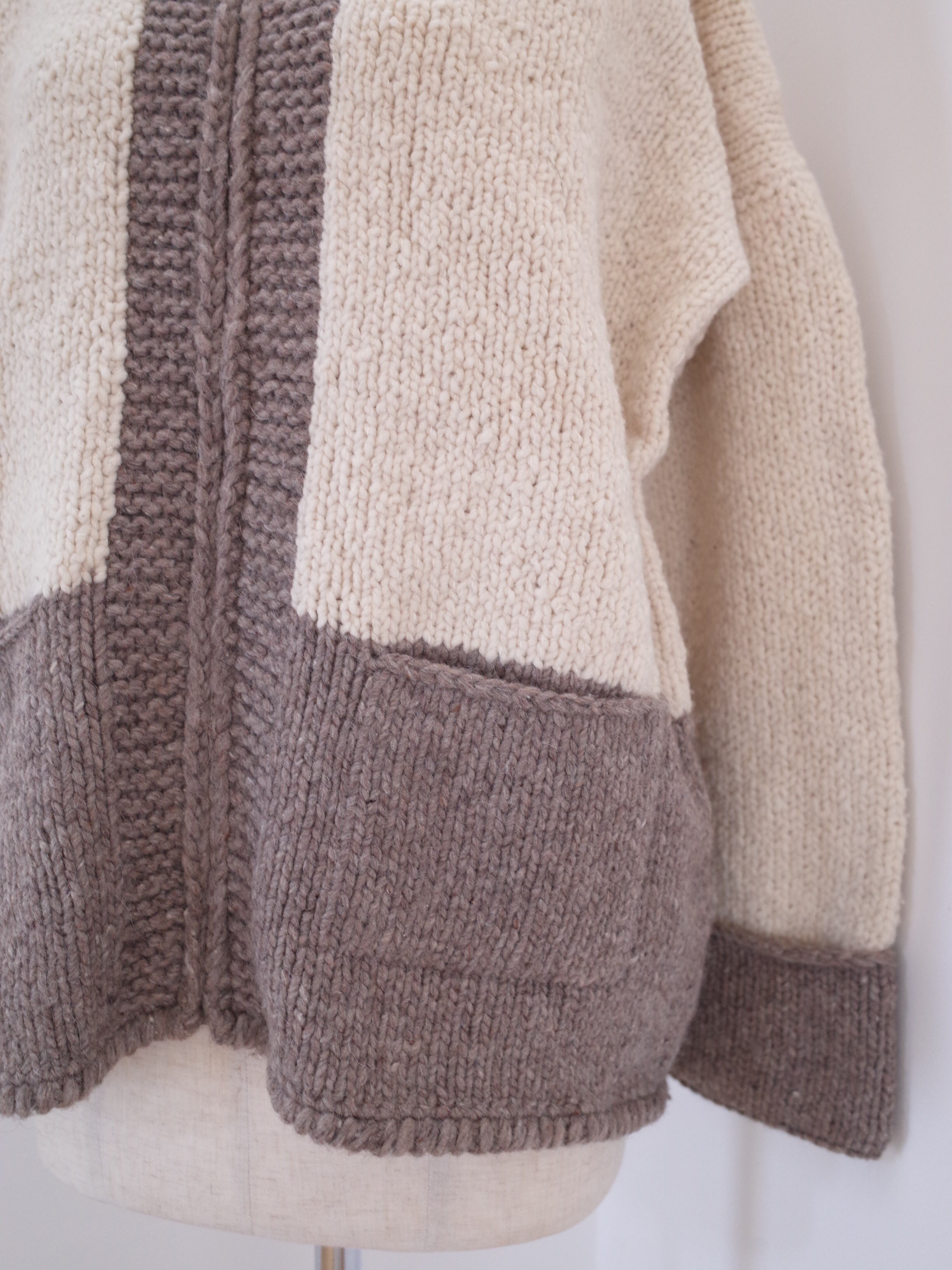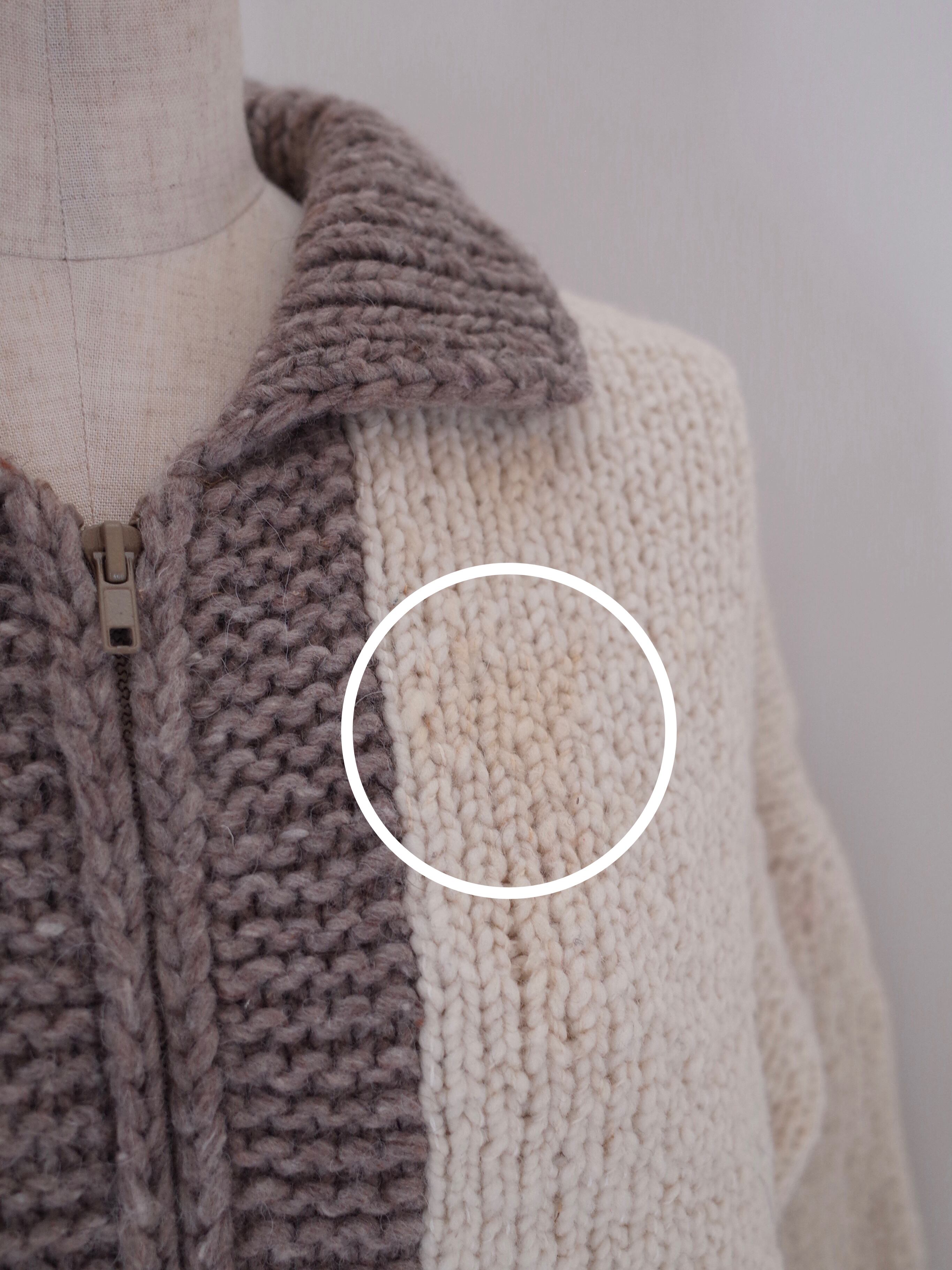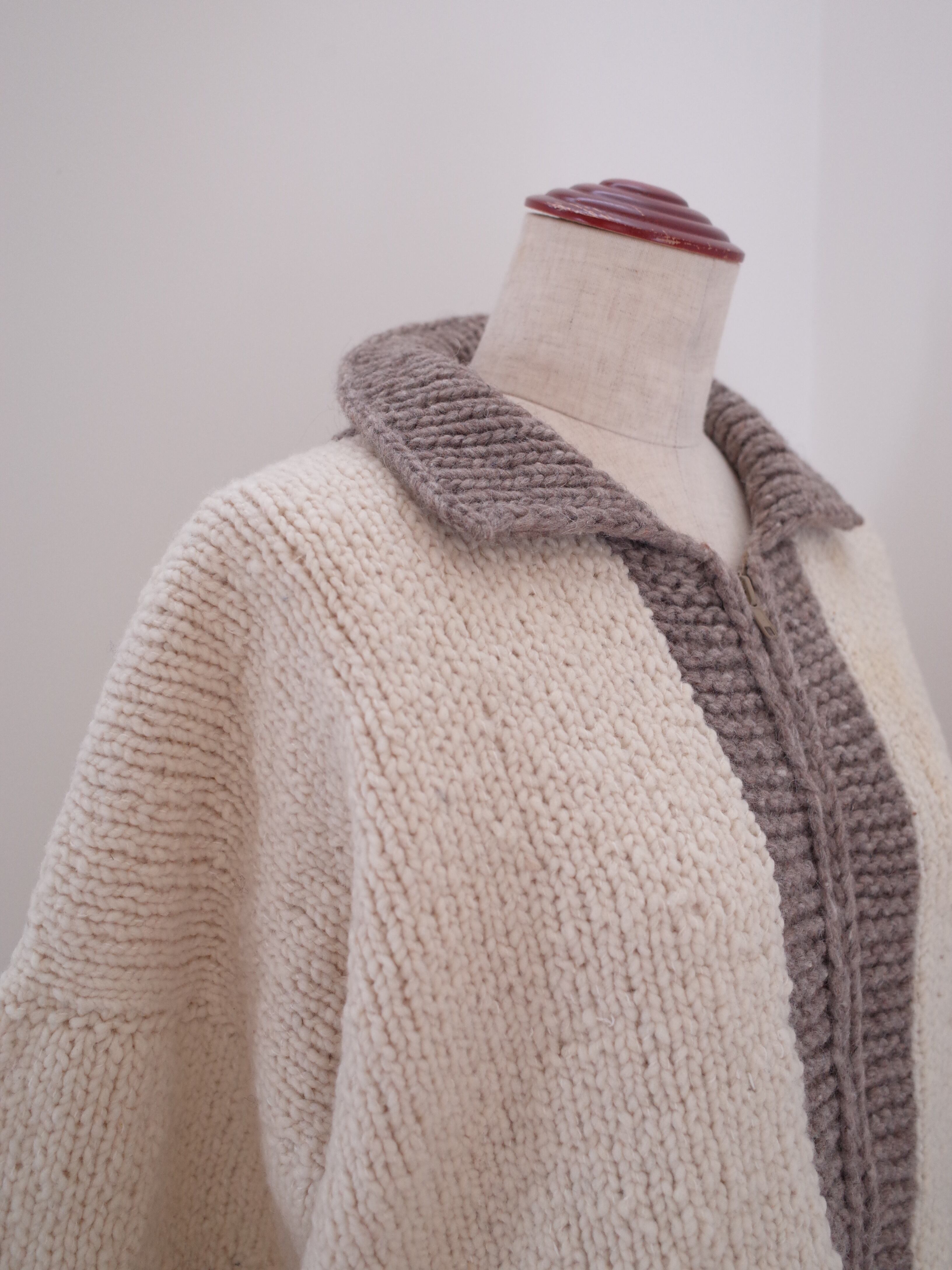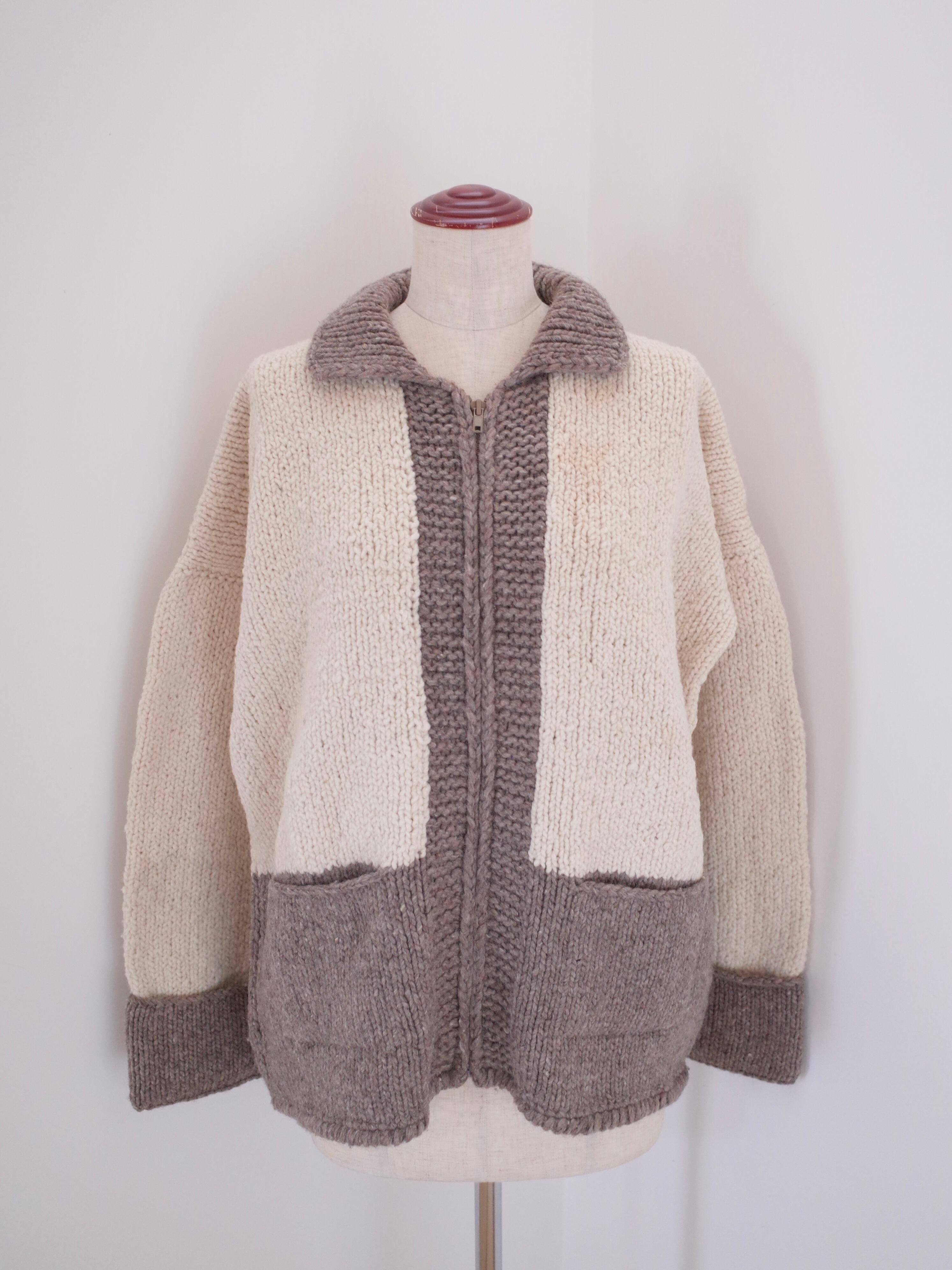 エクアドル製のニットカーディガン。太い毛糸でざっくり編まれたローゲージの一着。袖の折り返しが可愛いデザインです。ゆったりとしたサイズ感で、アウターのように着用出来るカーディガン。どんなボトムにも合わせやすいニットです。