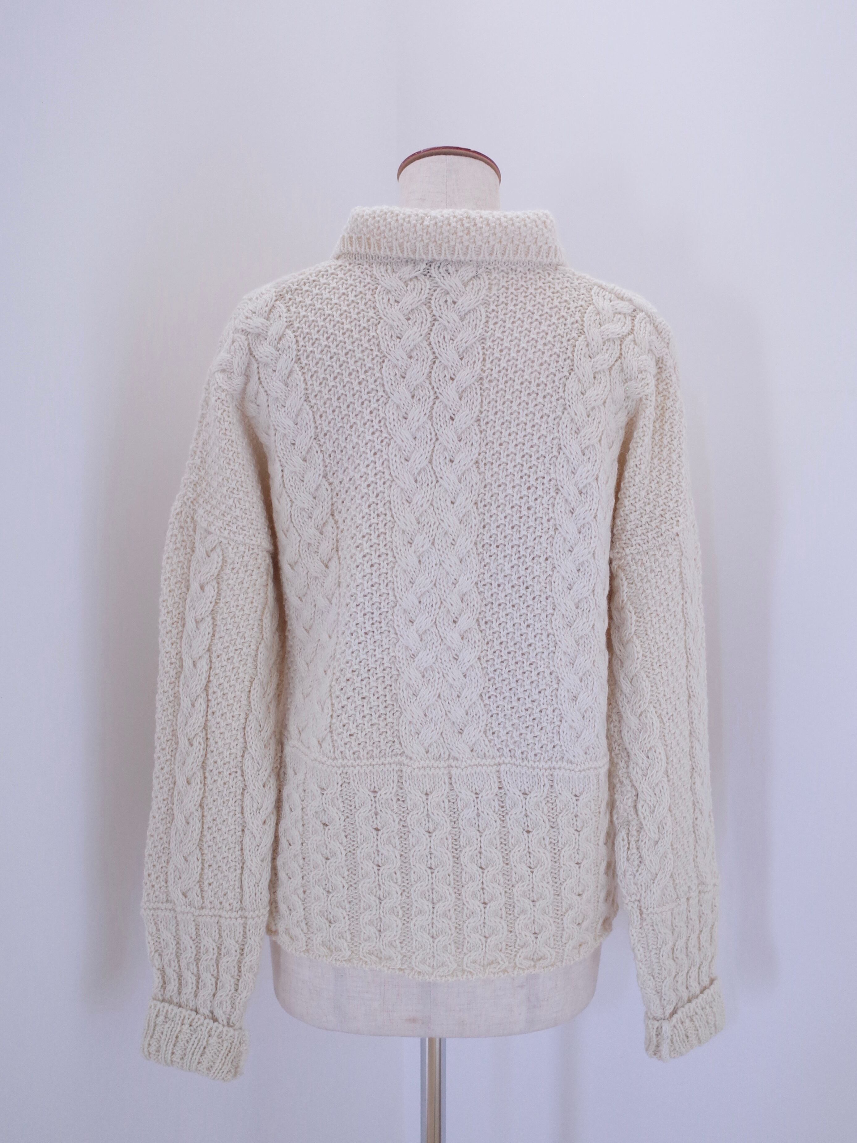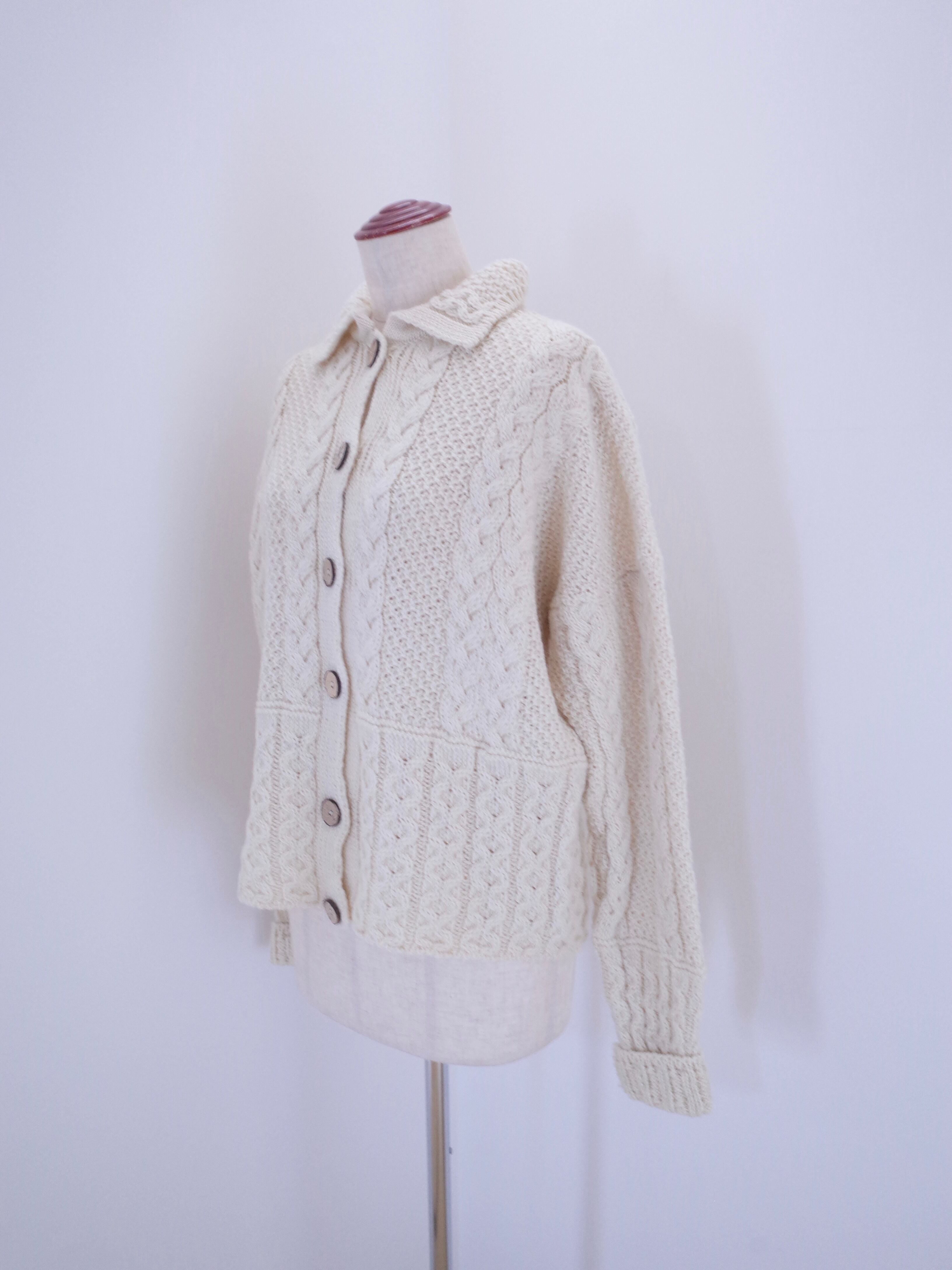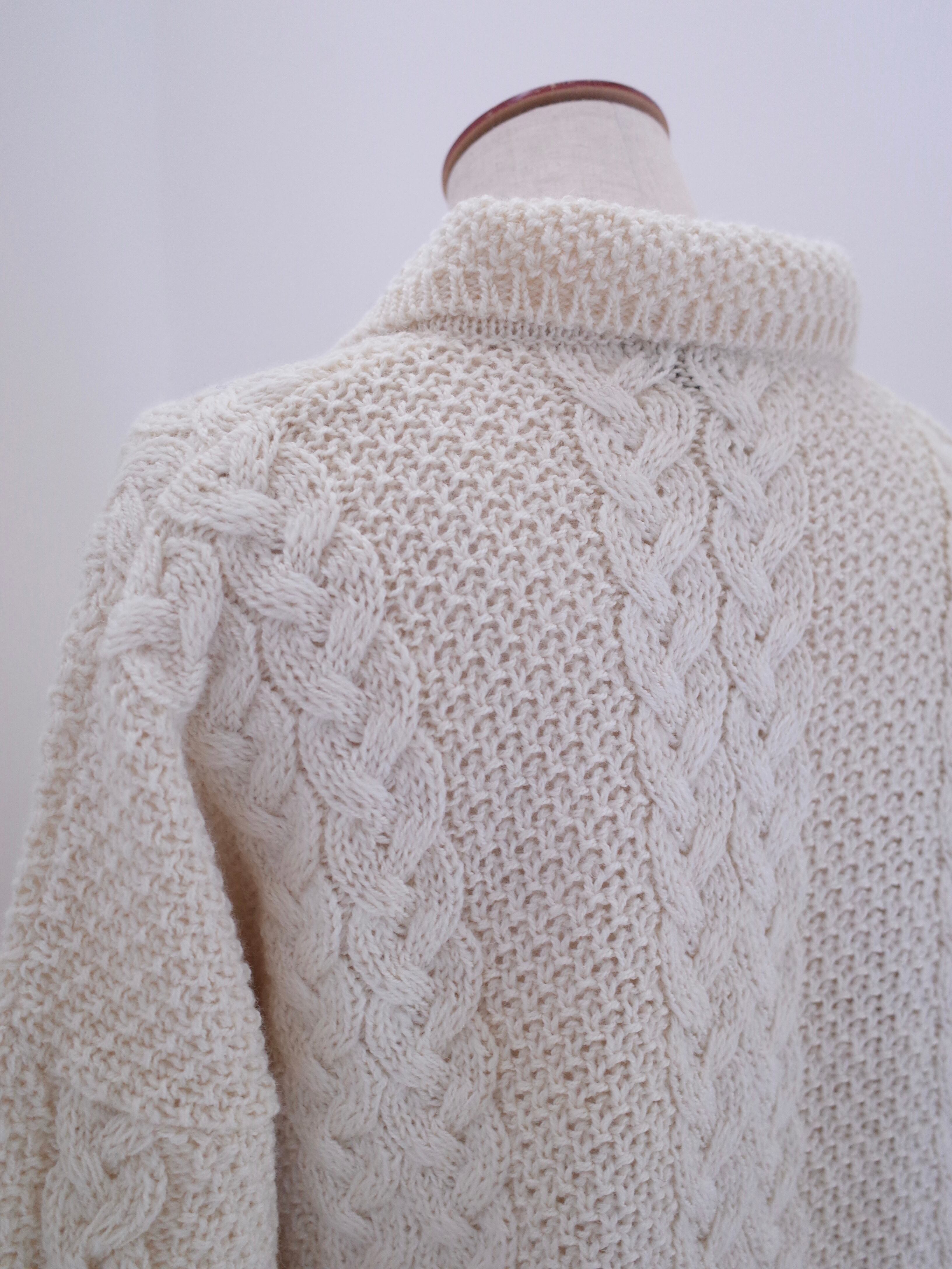 イギリス製のフィッシャーマンニットカーディガン。ケーブル編みのデザインが良い一枚です。チクチクしない上質なウール素材が使われていて、これからの季節コートの中にも着用可能な薄さのグッドサイズなニットです。