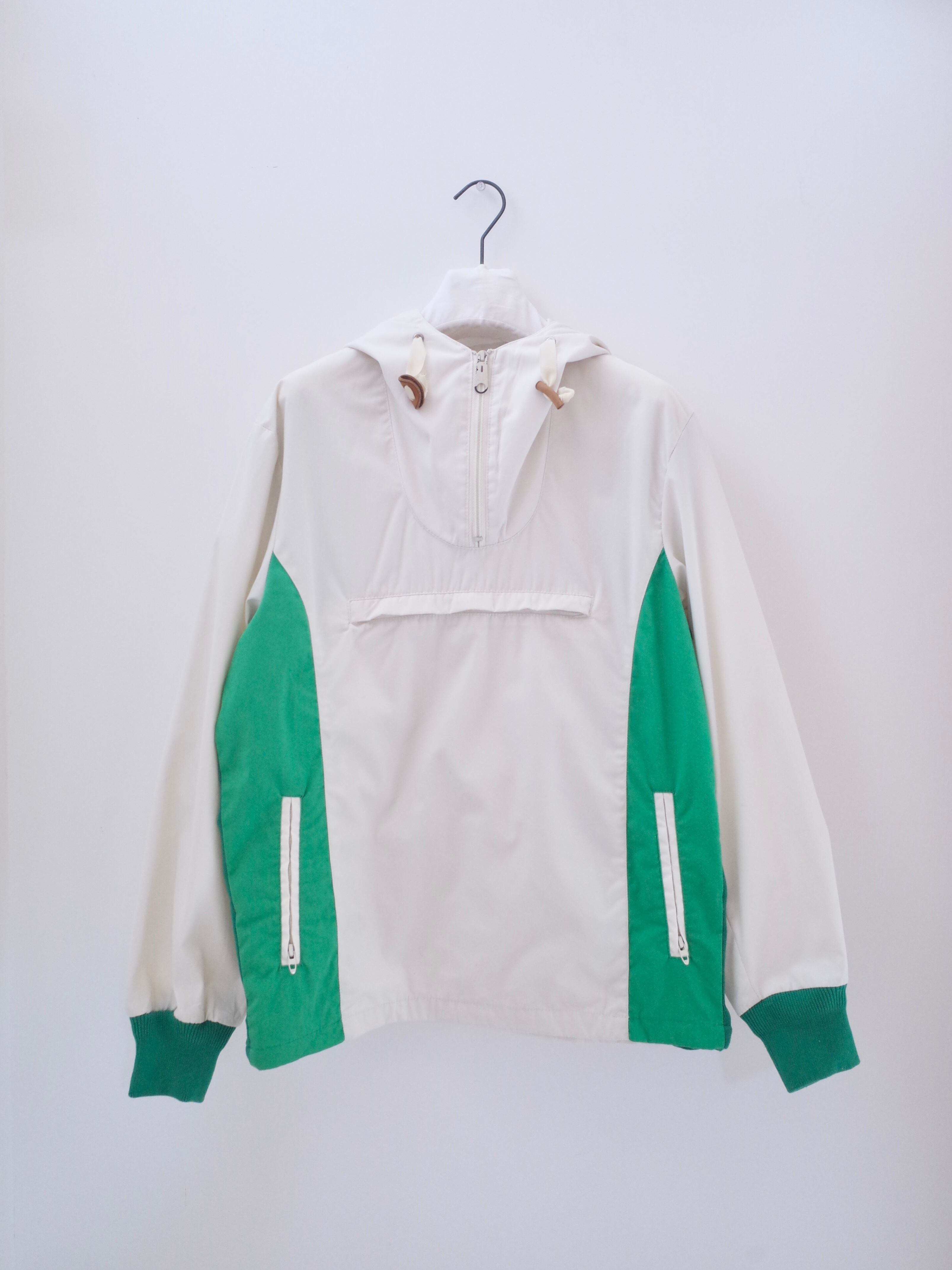 70年代製Woolrich WOMANのアナラックパーカー。裏地のないプルオーバータイプのアノラックパーカーは気軽に被れるので重宝するアイテムです。ウールリッチだと個性も出せます。両脇のラインと袖口のリブがアメリカらしい鮮やかなグリーンカラーで配色の良い一枚です。