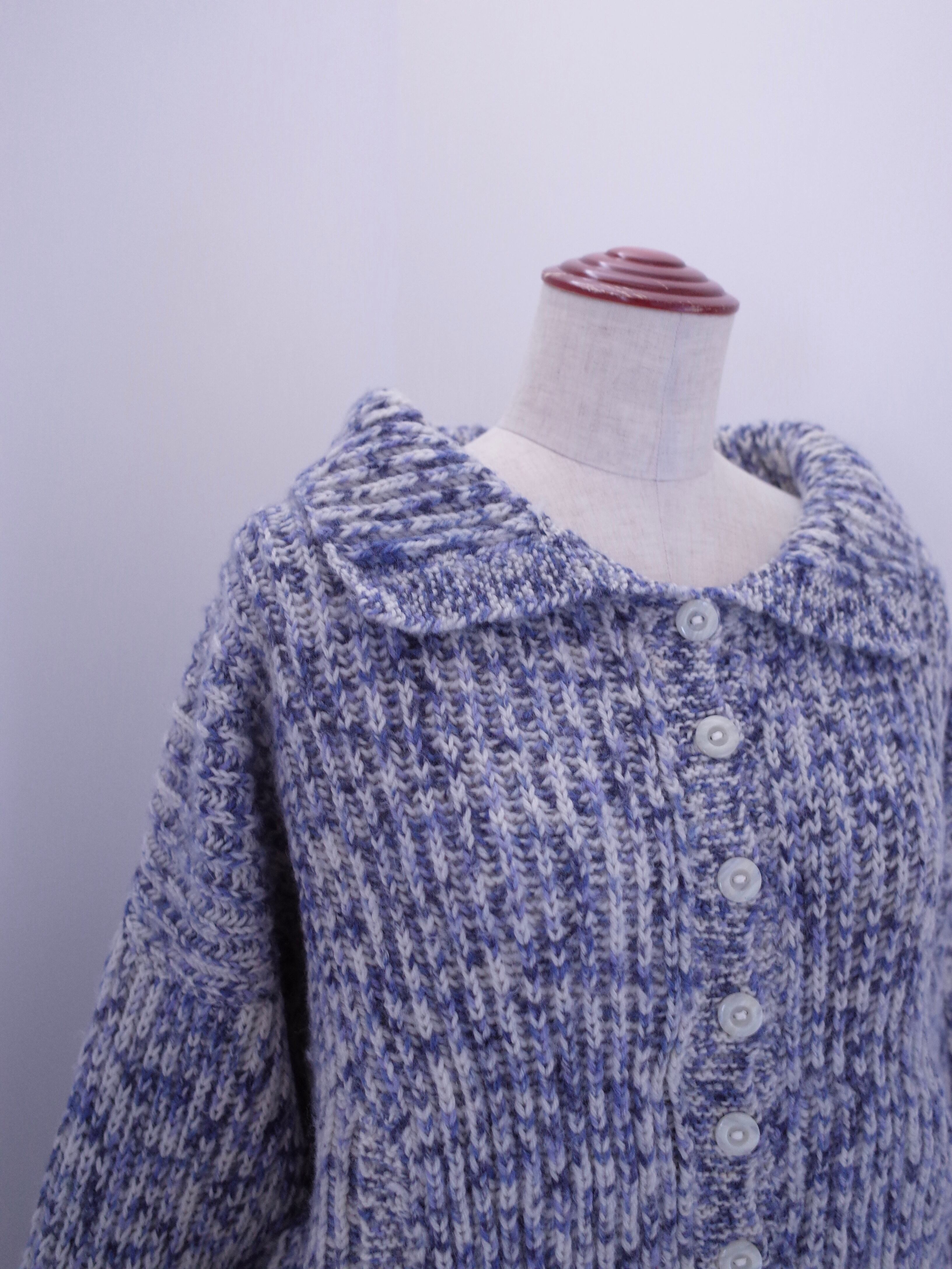 全体のシルエット、襟元や袖のデザインの良い手編みのニットカーディガン。ポケットが付いているのも嬉しいポイントです。カジュアルにスウェットの上に羽織ったり、ボトムはパンツでもスカートでも◎どんなスタイルにも気軽に羽織って、雰囲気の出せる一枚です。