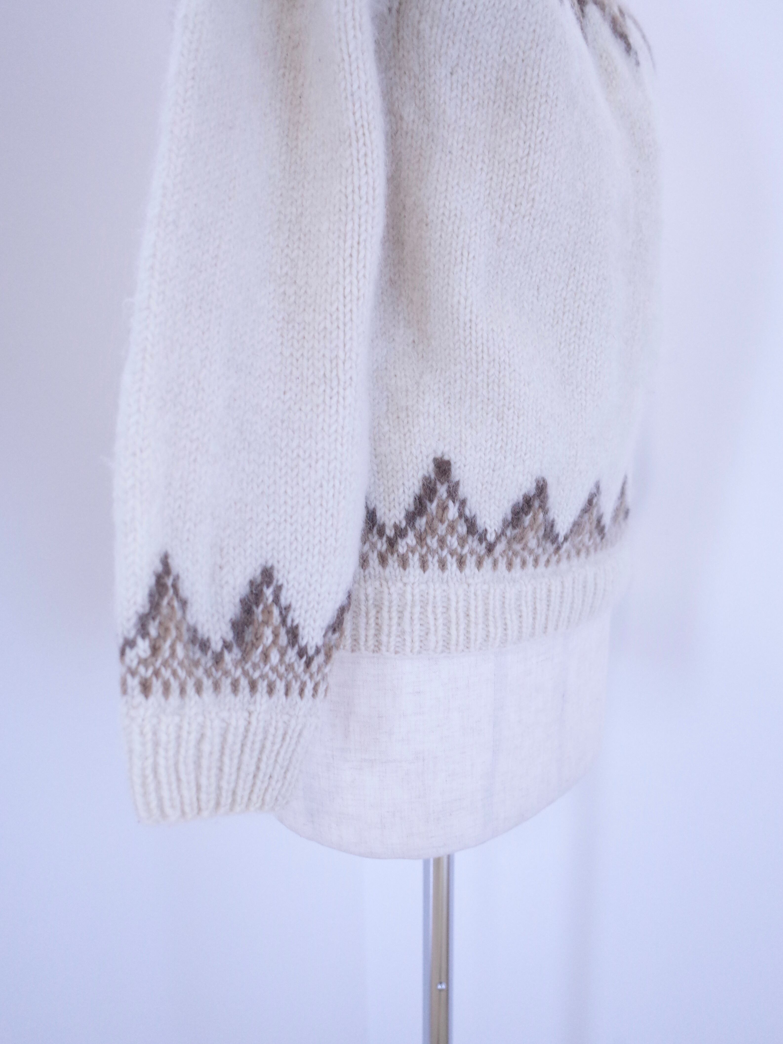 ハンドニットのフェアアイル柄セーター。ホワイトベースにベージュやブラウンの雰囲気の良い配色です。数々のブランドからも出されている伝統的な柄ですが、スコットランド北東にあるシェットランド諸島のフェア島が発祥。北欧の伝統とぬくもりを感じる一枚です。