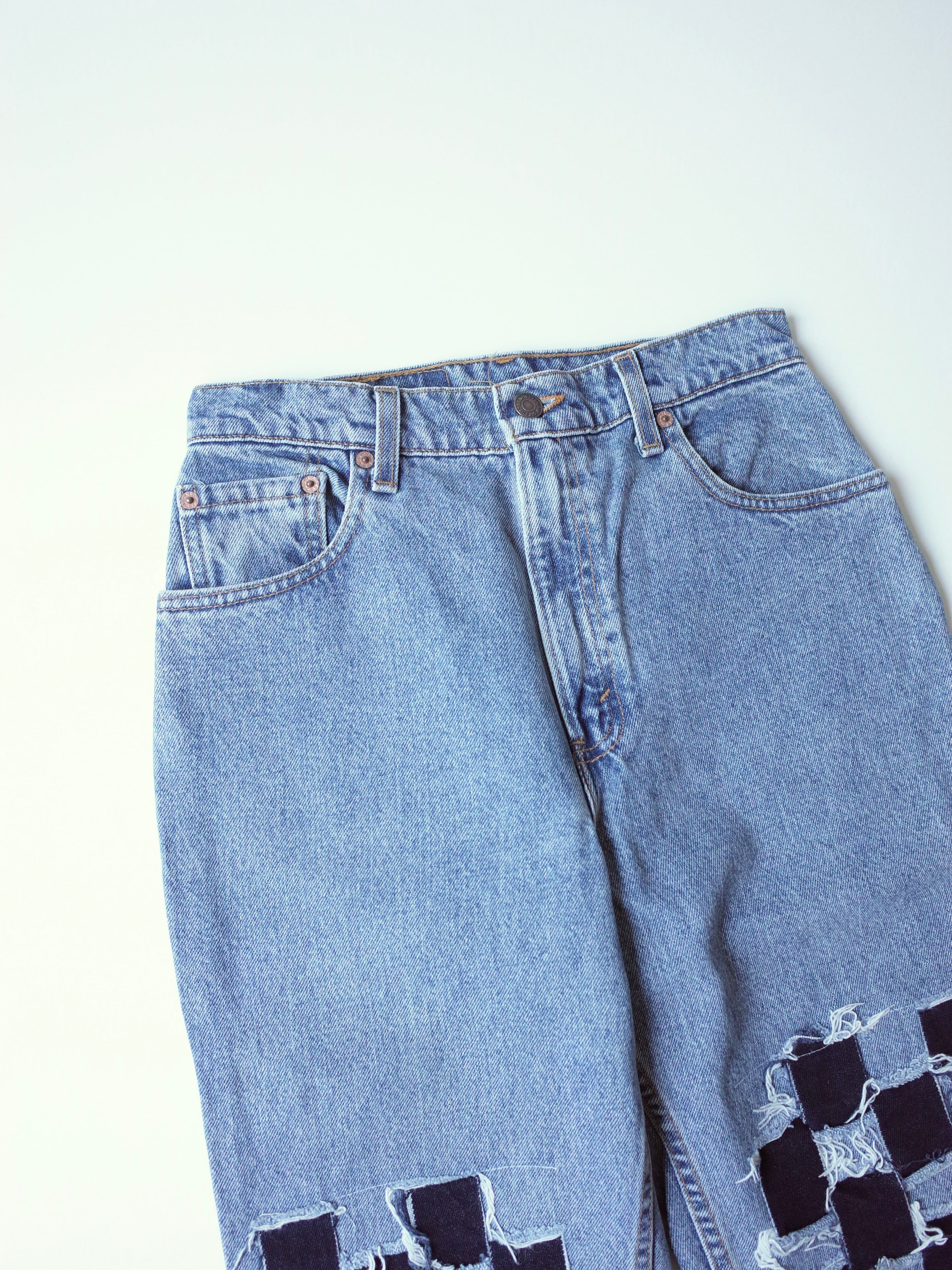 90年代USA製Levi's550。腿の部分に濃いデニムを織り込んだリメイクが施されています。シルエットは股上深めのハイウエストで、テーパードしているレングス。すっきりと履けるので、オーバーサイズのニットなどボリュームのあるトップスを着たいときにもおすすめなジーンズです。