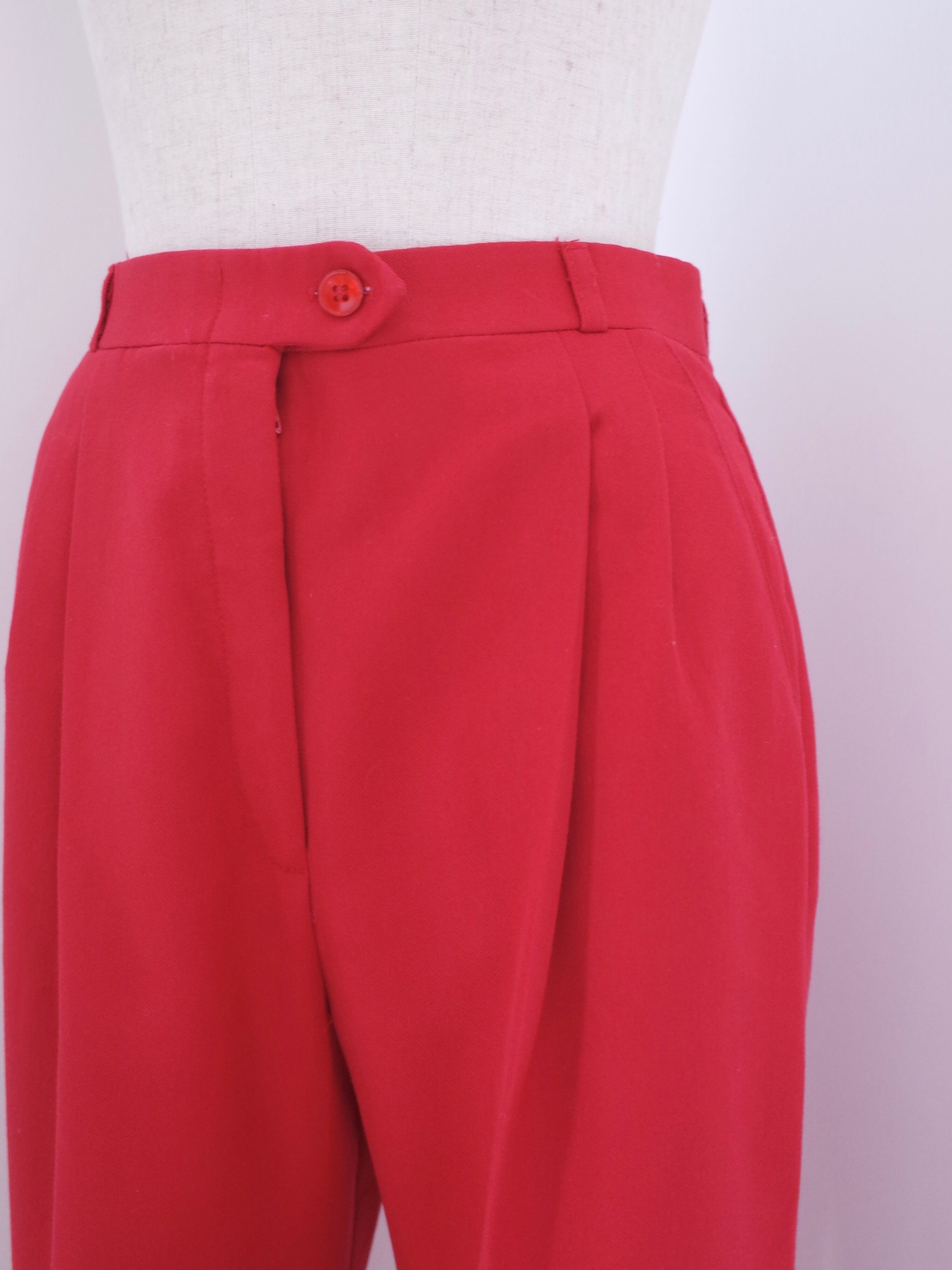 80年代アメリカ製のタックパンツ。発色の良いレッドカラーがGOODなパンツです。テーパードレングスに、2タック。とにかくシルエットが綺麗な一本。ざっくりとしたニットや、ラフにスウェットとの合わせもおすすめです。スタイリングの差し色に◎