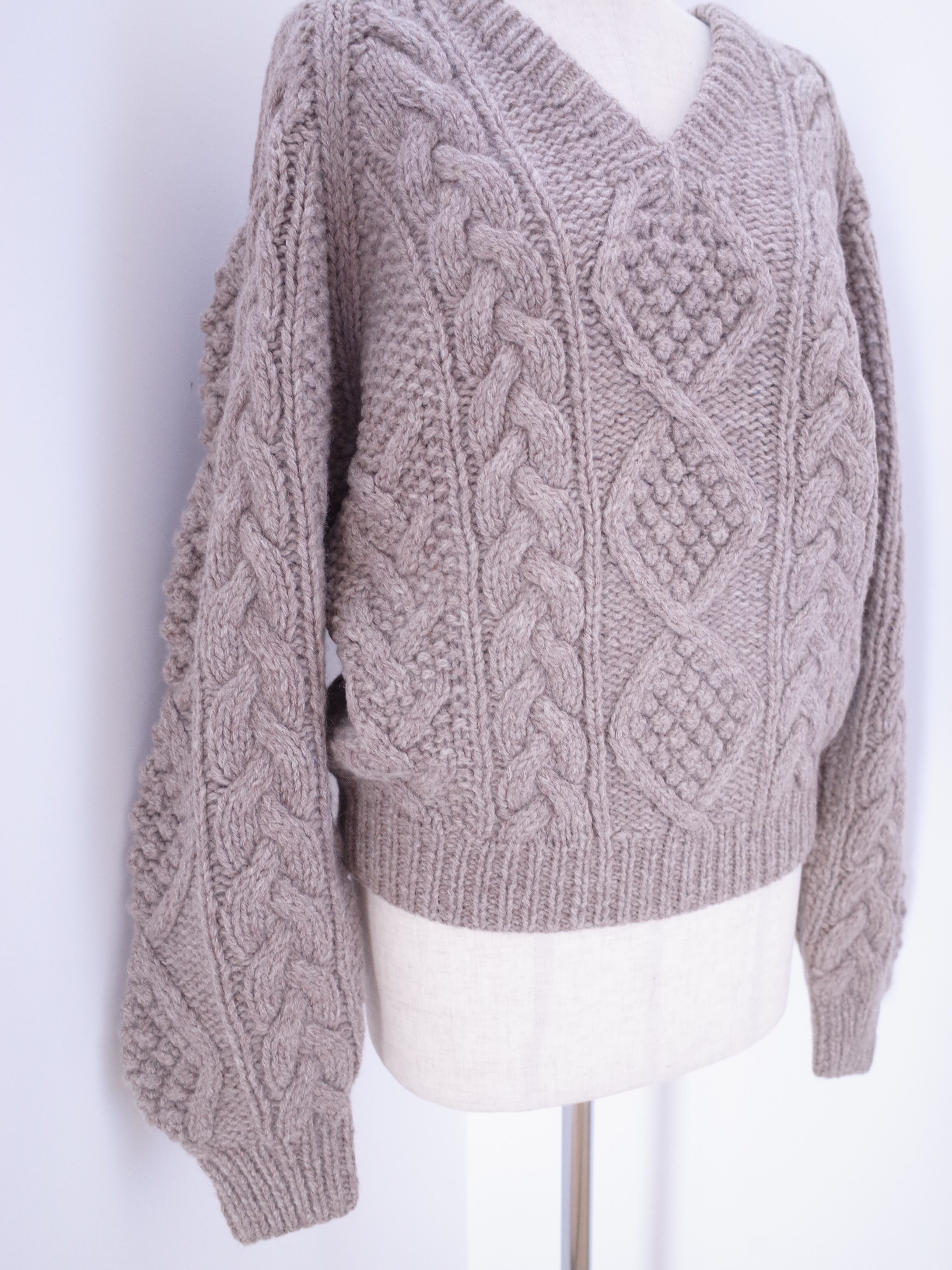 Vネックの胸元のあきが綺麗なケーブルセーター。ざくざくとしたローゲージで、ケーブル編みのバランスが良い一枚です。アームにボリュームがあって、身幅はすっきりとしています。タートルネックをインしたり、ダウンやムートンベストにレイヤーしてかわいいニットです。