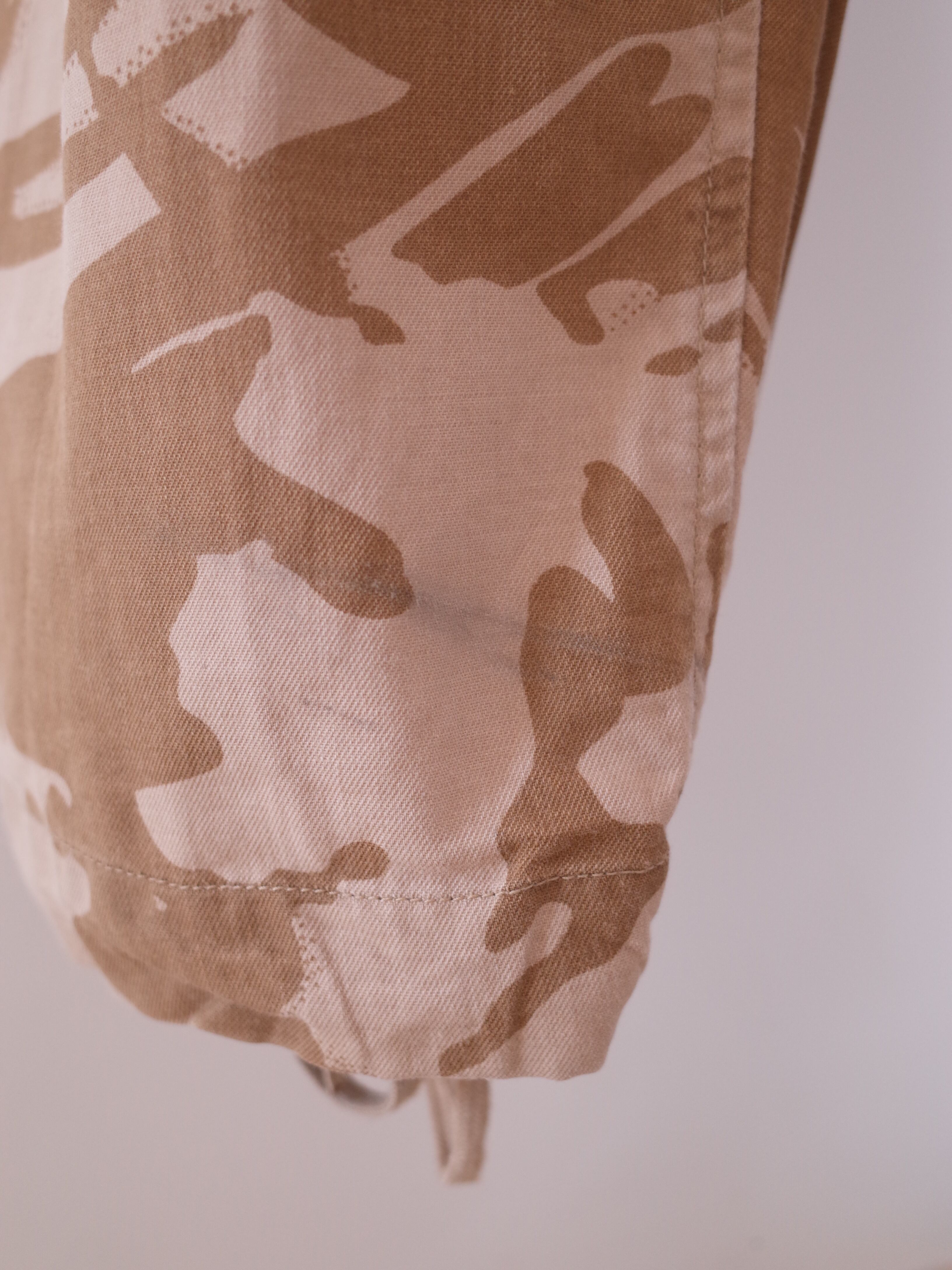 イギリス軍のカーゴパンツ。トロピカルデザートという、ネーミングがかわいいカモフラ柄。適度な太さと緩さがあり裾をドローコードで絞れる、ちょうど今の気分にあったシルエットです。一年通して履ける薄手の生地感。ウエストもボタンと紐で調整出来るので、気持ち大きめに履くとGOODなパンツです。