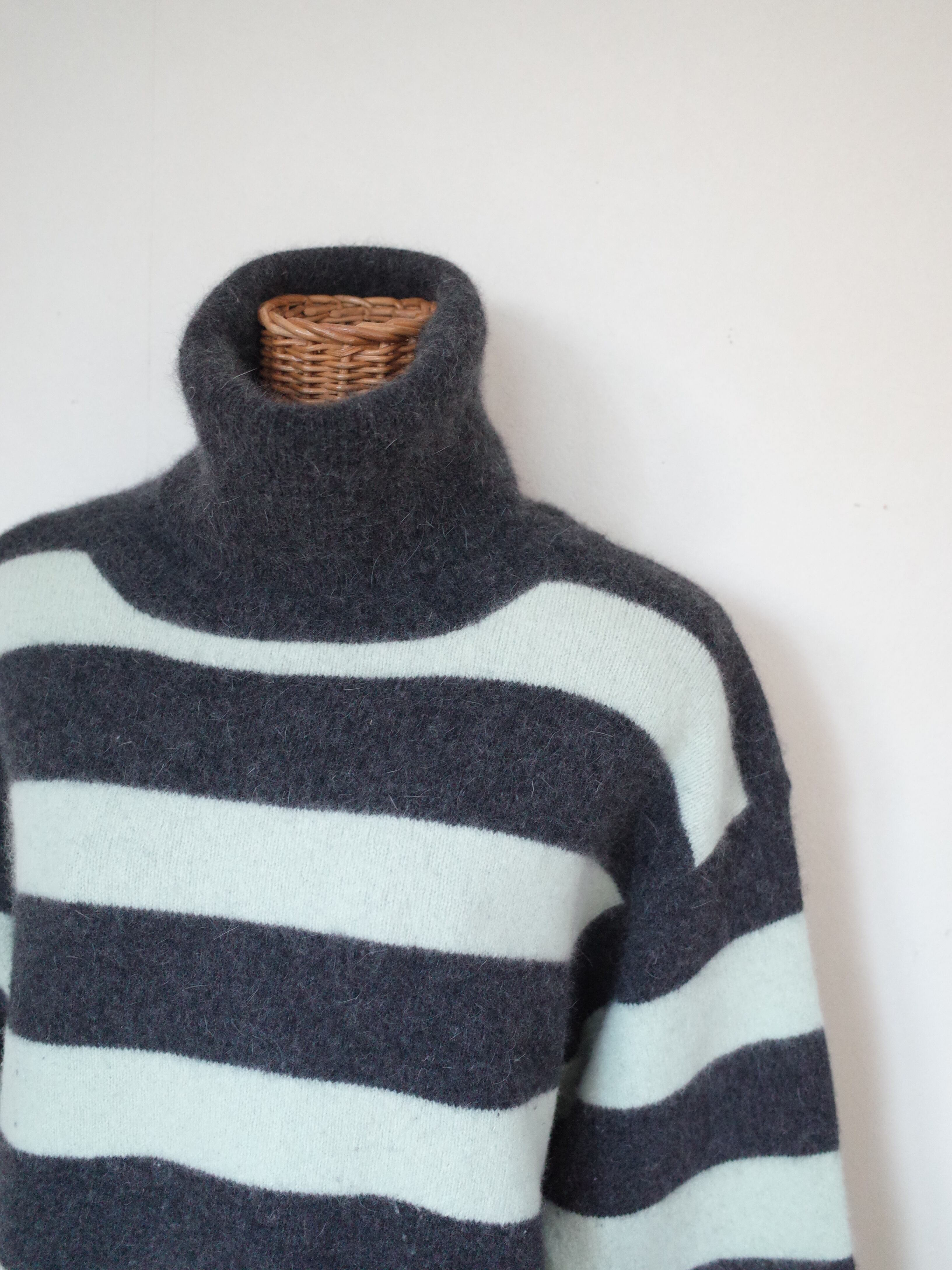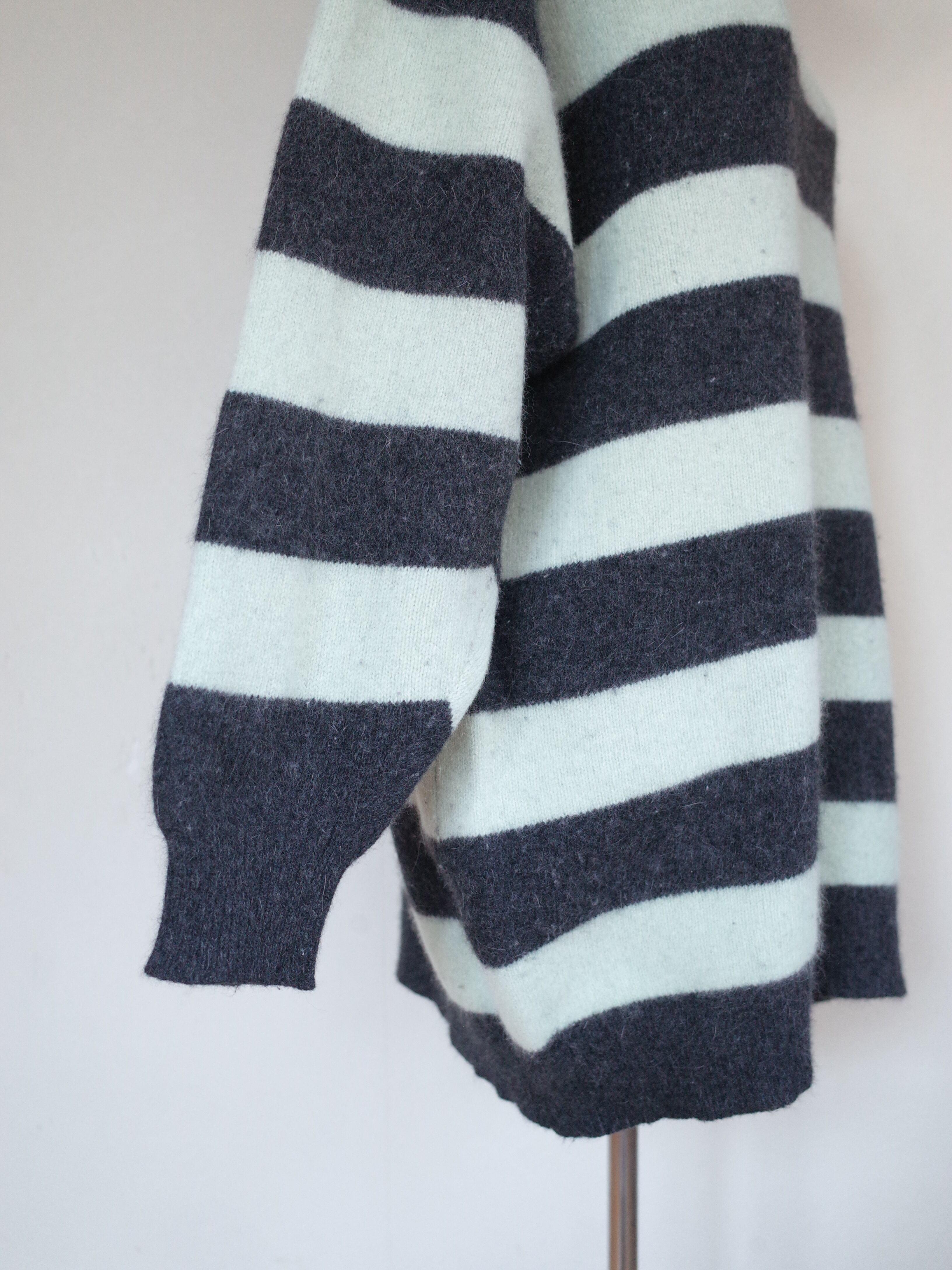 毛足の長いアンゴラ混のニットが柔らかくて優しい肌触り。長めのタートルネックで首元も温かく過ごせます。太めのピッチのボーダーは、チャコールグレーと少しブルーがかった中間色のホワイト。お尻まで隠れる長めの丈感もgoodな一枚です。