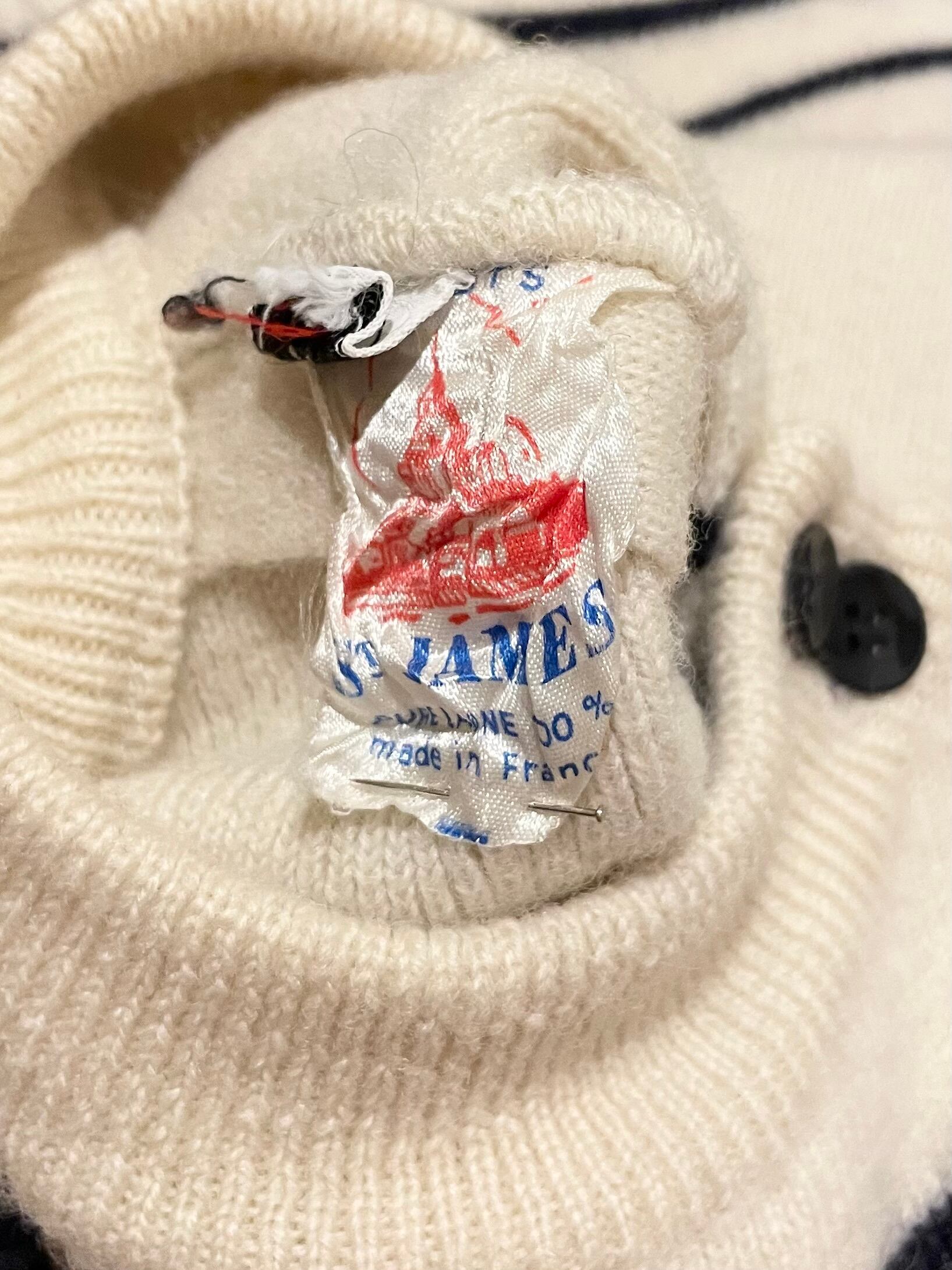 60年代フランス製Saint Jamesのマリンセーター。ボーダーのバスクシャツでお馴染みのセントジェームスですが、1889年〜地元の漁師や船乗りたちが着るためのウールセーターを作り出したのが始まりと言われています。ミドルゲージの厚手ニットなので、一枚でも保温性が感じられ、上から着るアウターを選ばないシルエットはマルチにご活用いただけるアイテムです。ミリタリーパンツやチノパン、ダッフルやピーコートにも相性抜群です。