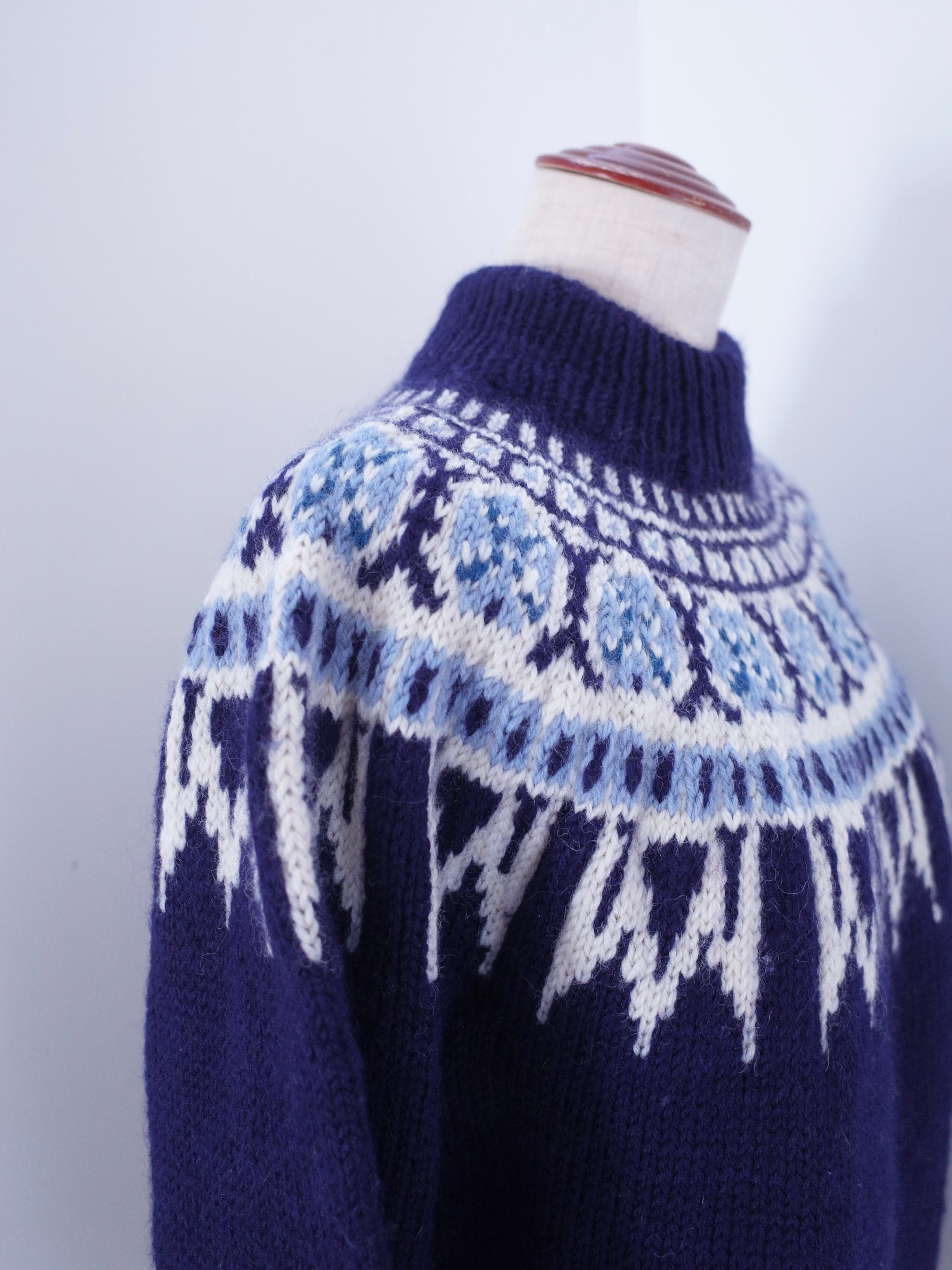 ハンドニットのフェアアイル柄セーター。ネイビーベースにホワイトやライトブルーの雰囲気の良い配色です。数々のブランドからも出されている伝統的な柄ですが、スコットランド北東にあるシェットランド諸島のフェア島が発祥。北欧の伝統とぬくもりを感じる一枚です。