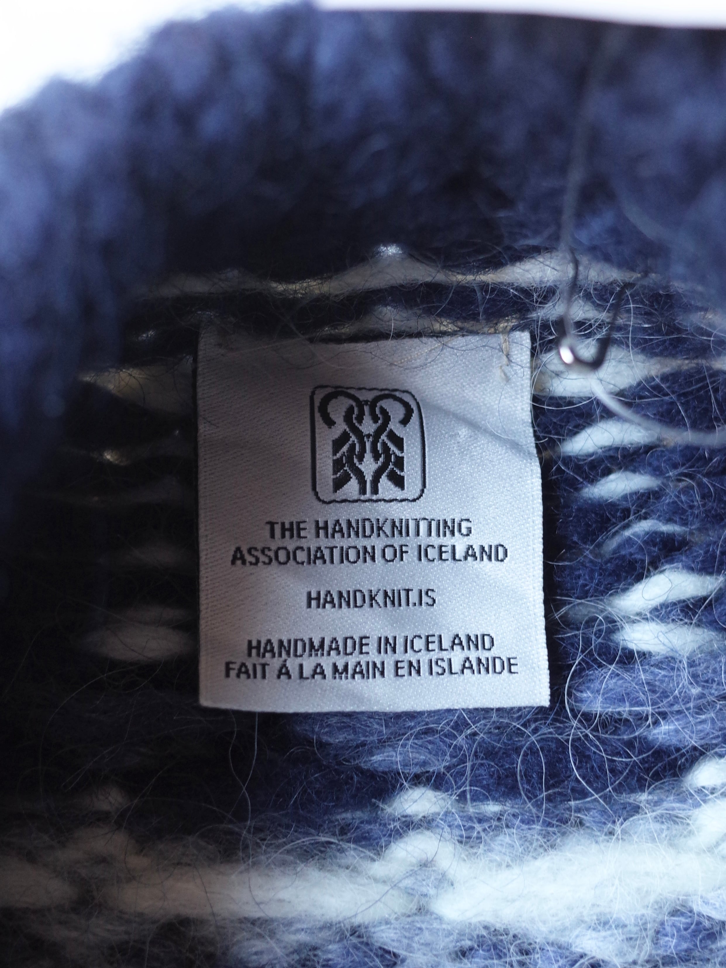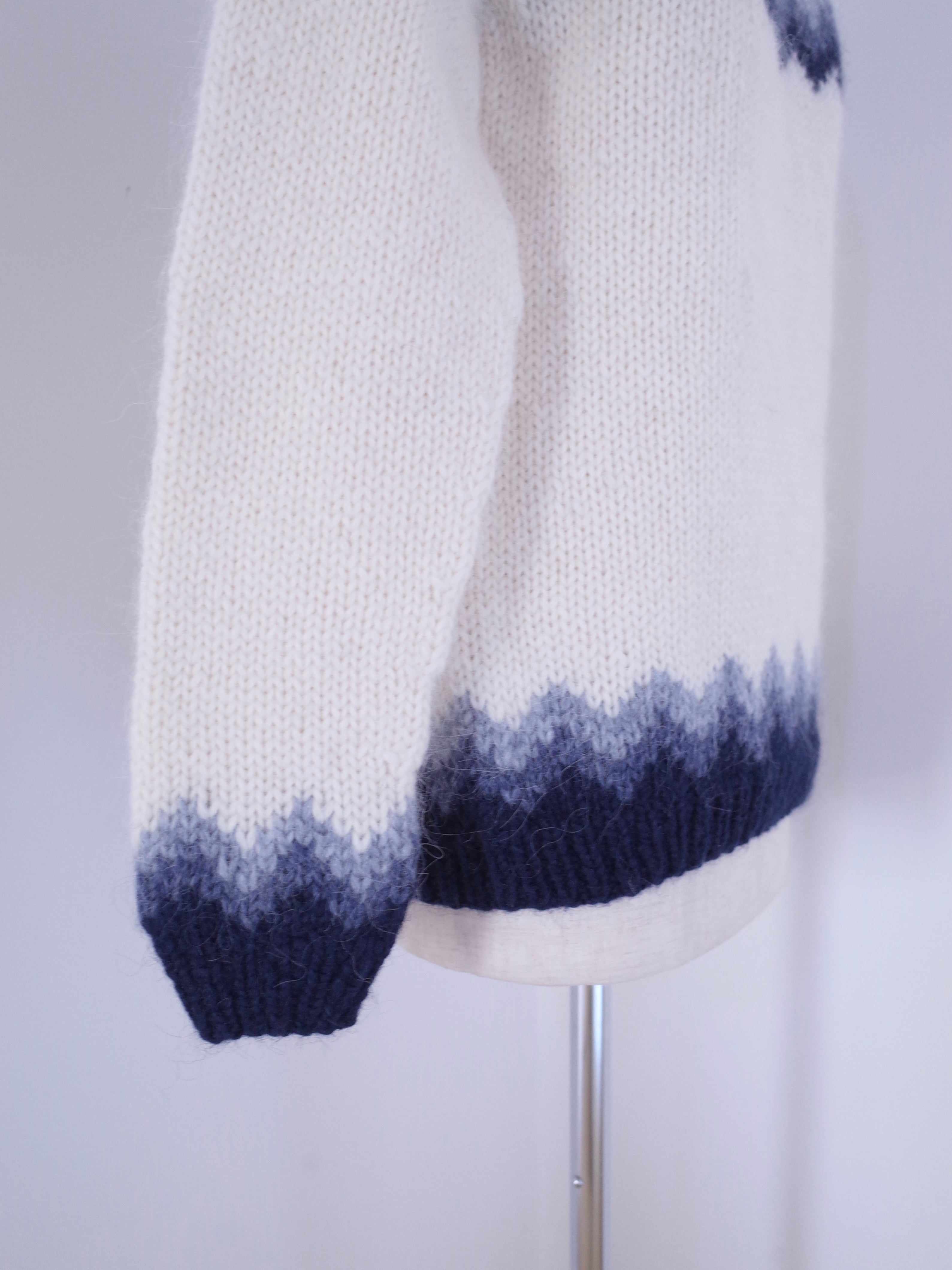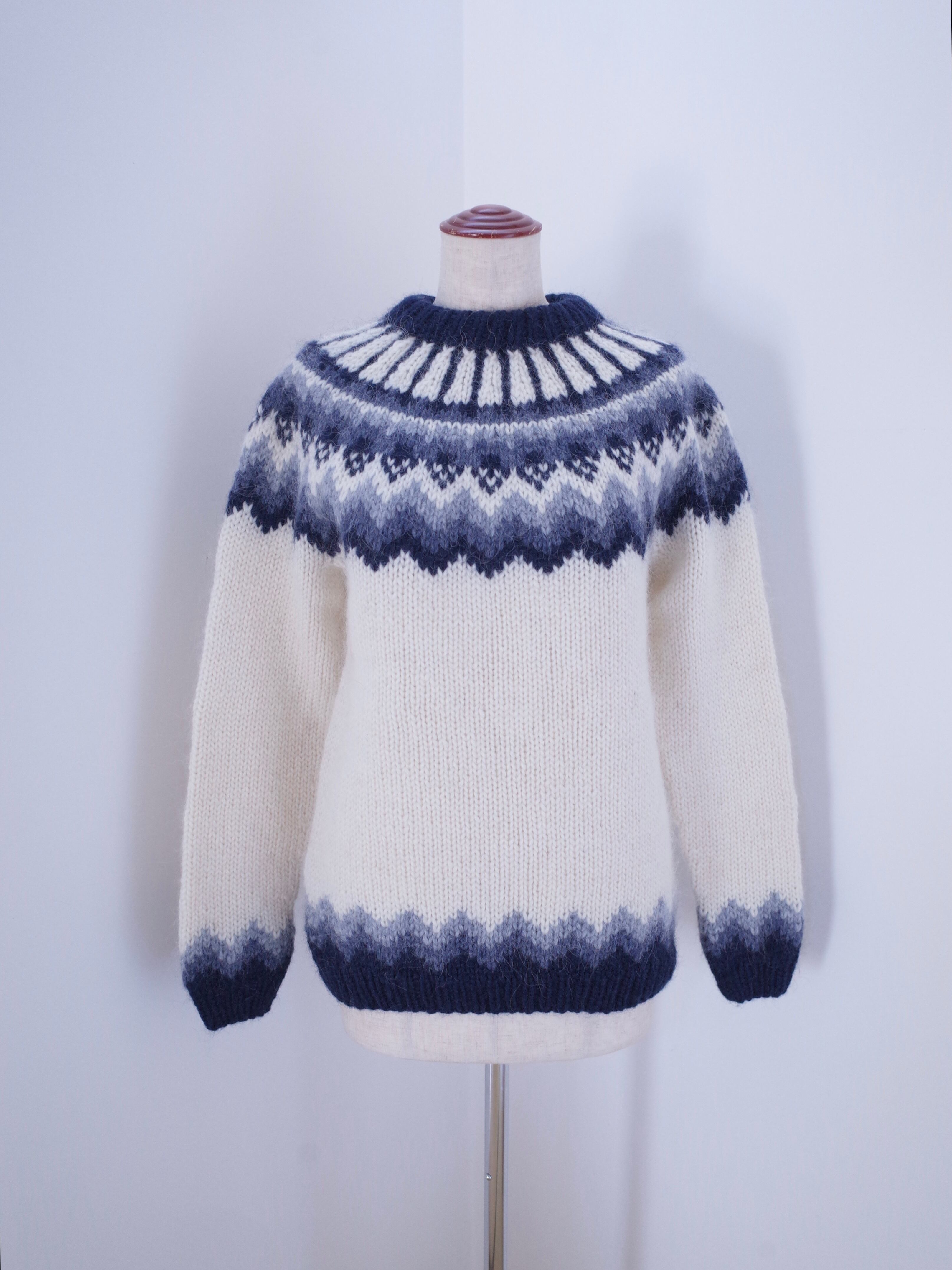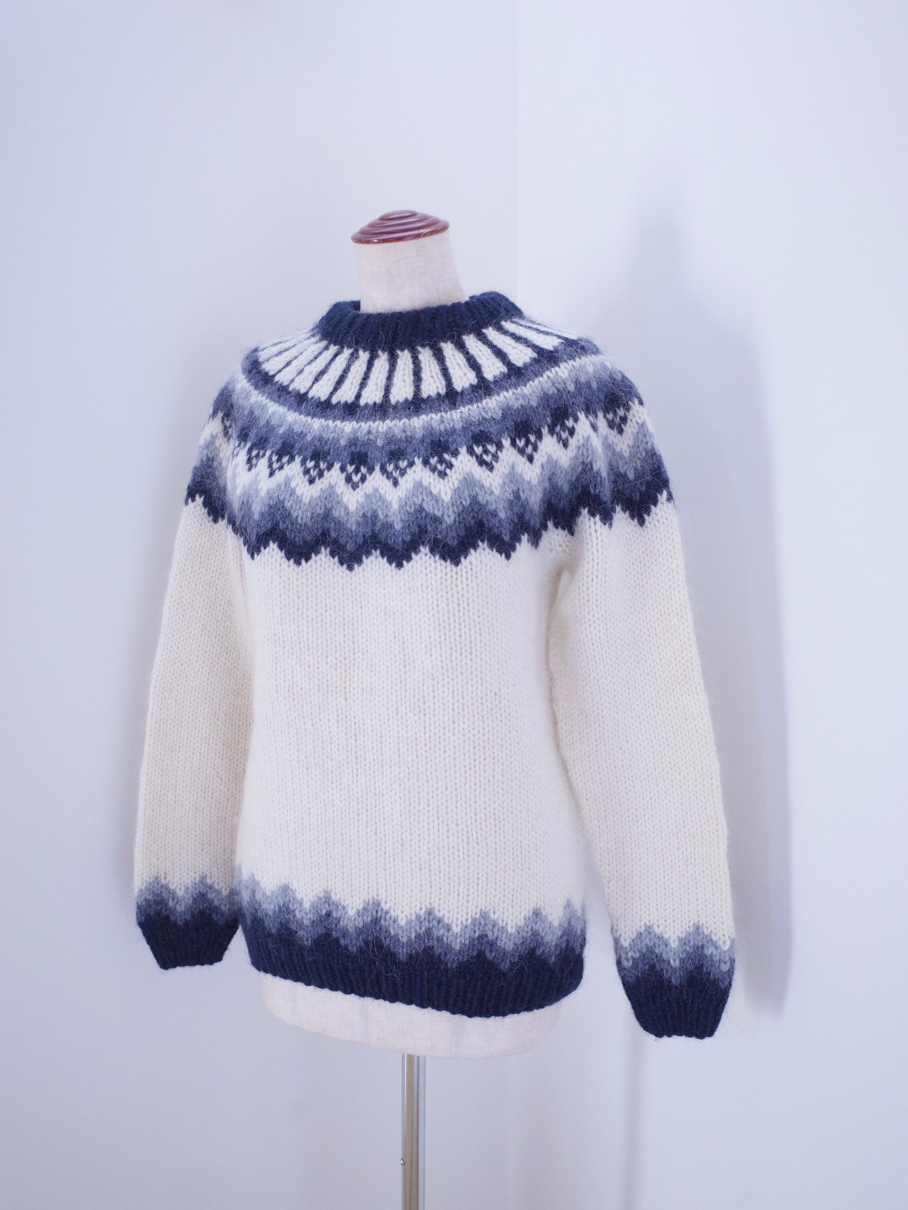 アイスランド製ハンドニットのフェアアイル柄セーター。ホワイトベースにネイビーやライトブルーの好配色な一枚です。数々のブランドからも出されている伝統的な柄ですが、スコットランド北東にあるシェットランド諸島のフェア島が発祥。北欧の伝統とぬくもりを感じる一枚です。
