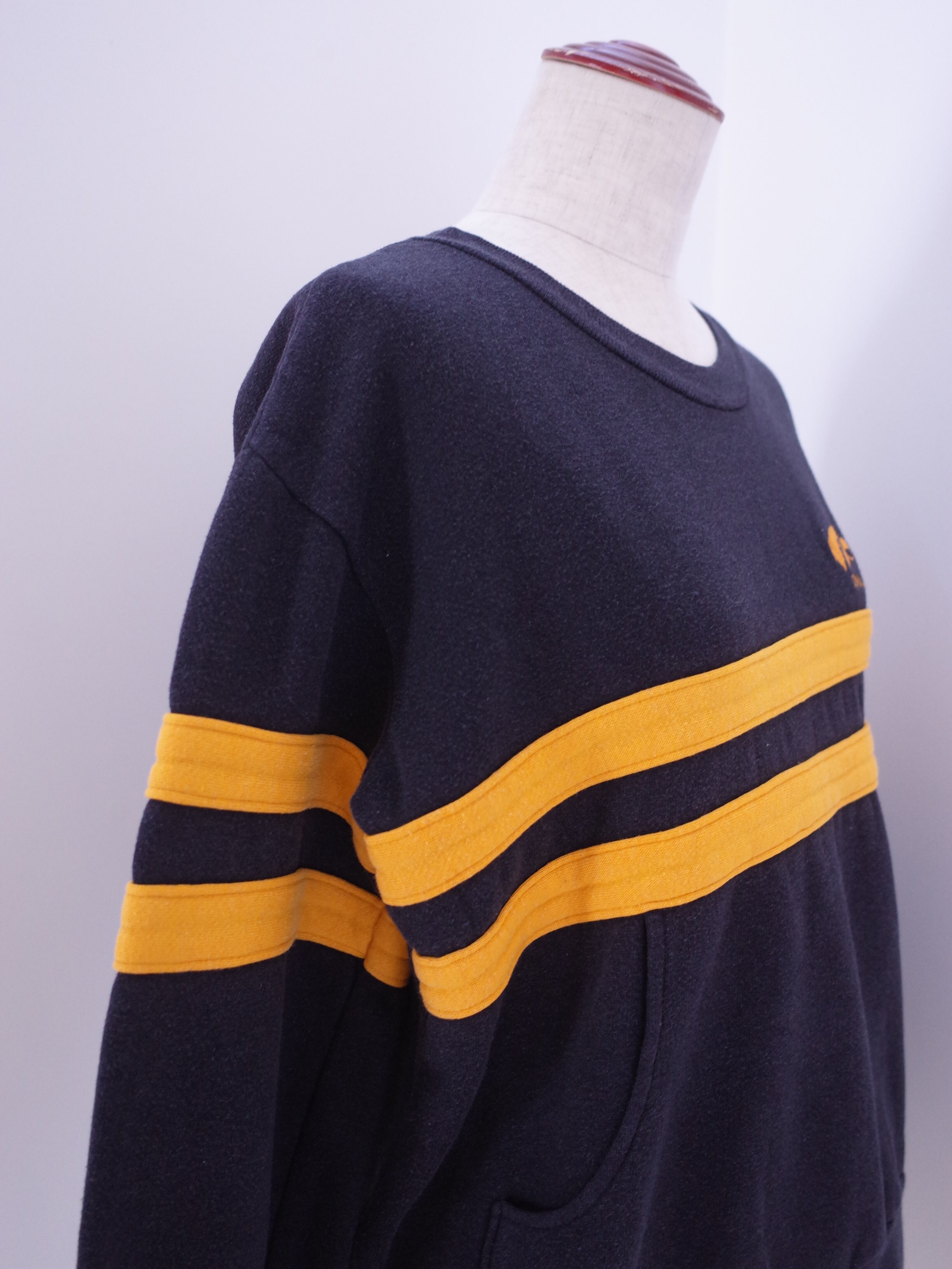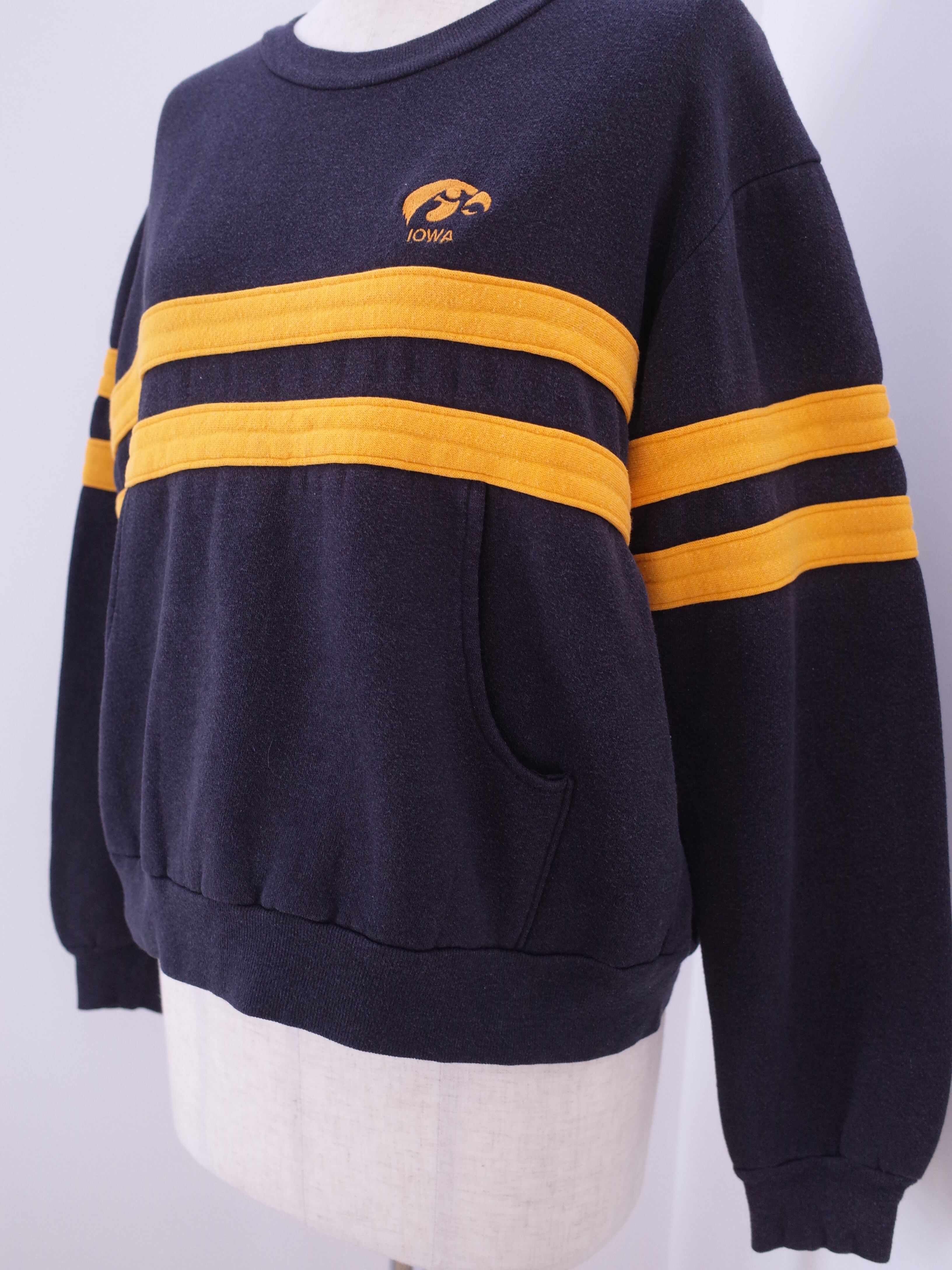 1990年代アメリカ製IOWAのカレッジスウェットです。ボディはNutmeg Mills。カンガルーポケットの付いた珍しいディテールで、ブラックにイエローのラインもNICEな一枚です。幅広で、短めの丈が今の気分にぴったりなシルエットです。