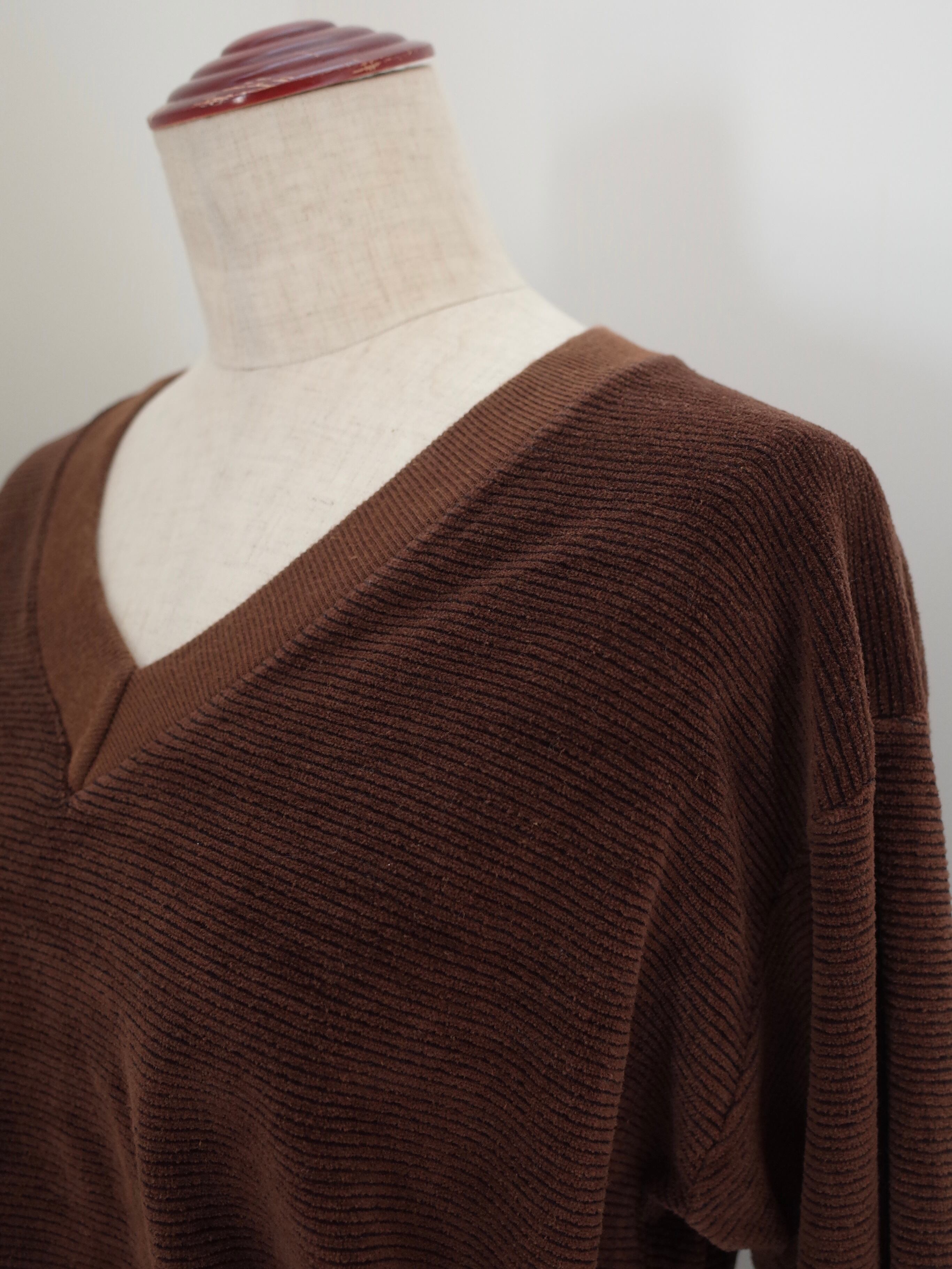 1980〜90年代製ベロア素材のトップス。肌触りの良い柔らかい生地感が着心地抜群の一枚。ベロア特有の光沢の上品さと、細いピッチのボーダーデザインのカジュアルさのバランスがGOOD◎洗濯機で洗えるので、スウェットを着る感覚で気軽にコーディネートに取り入れて頂きたいトップスです。
