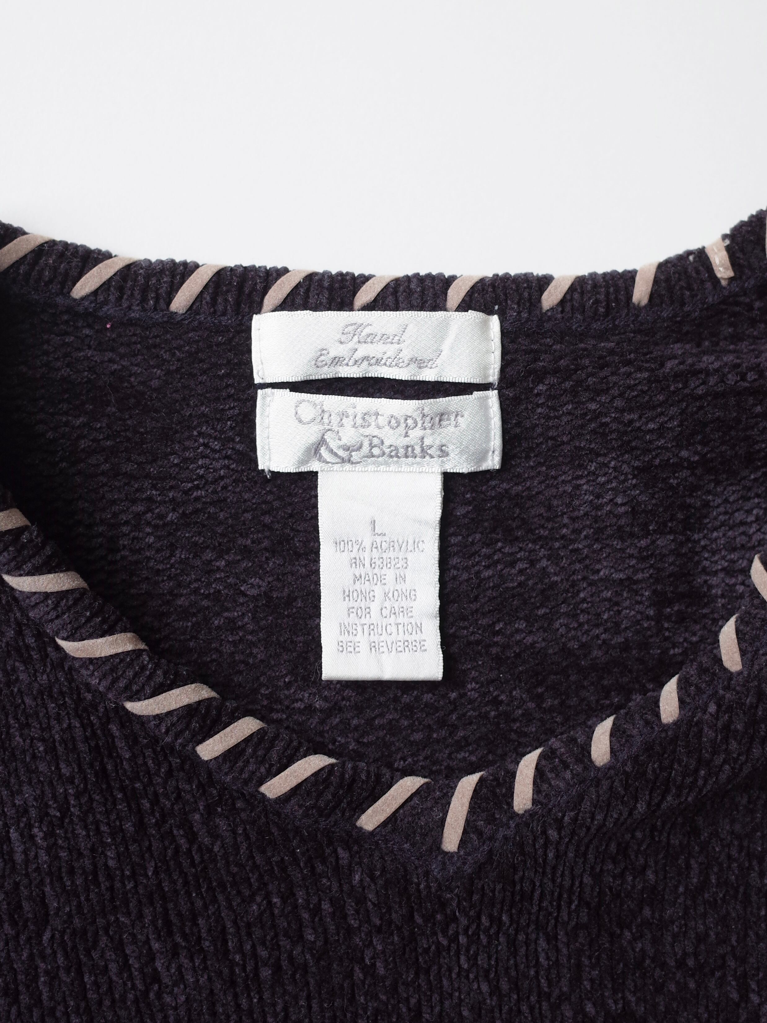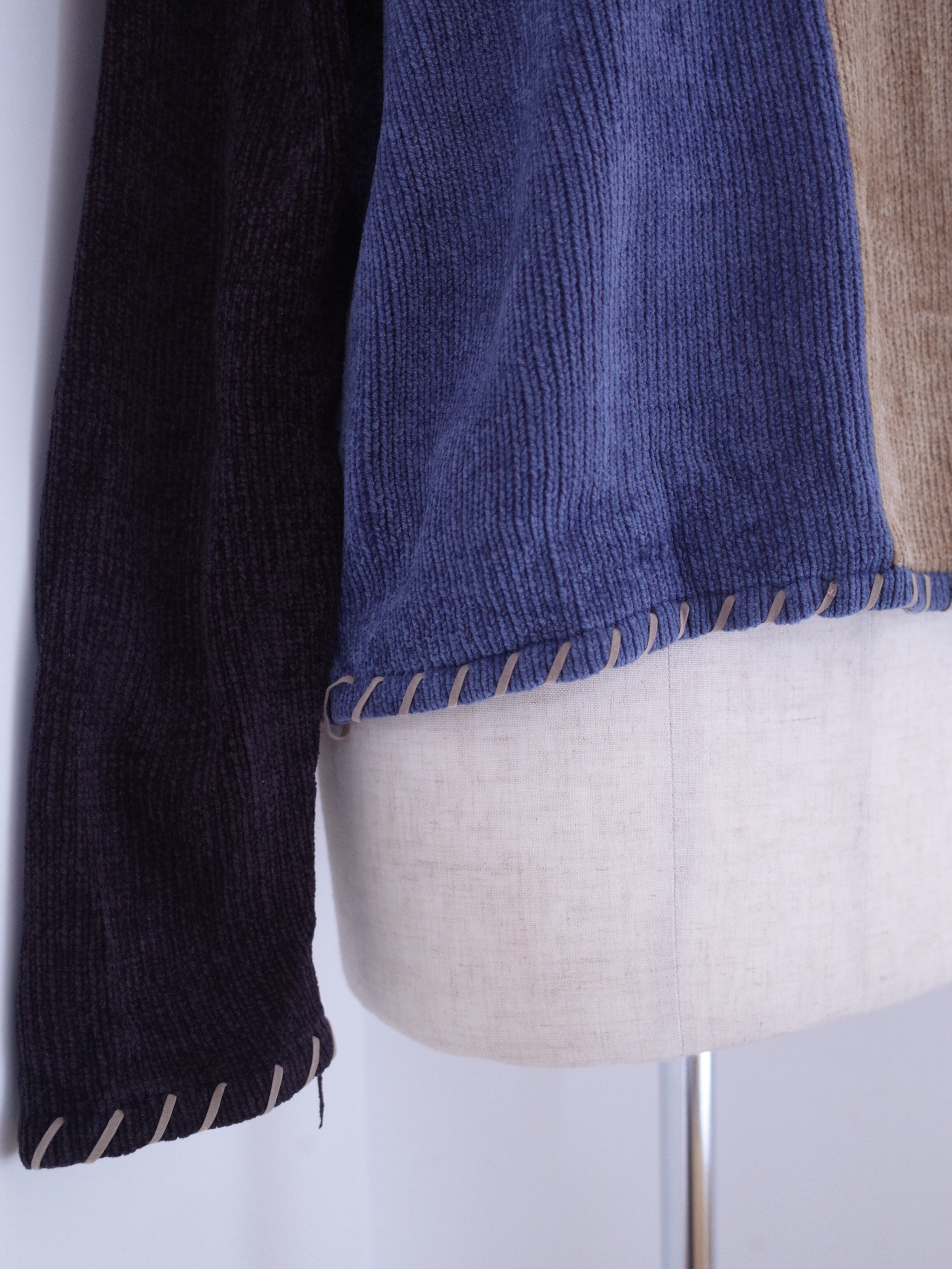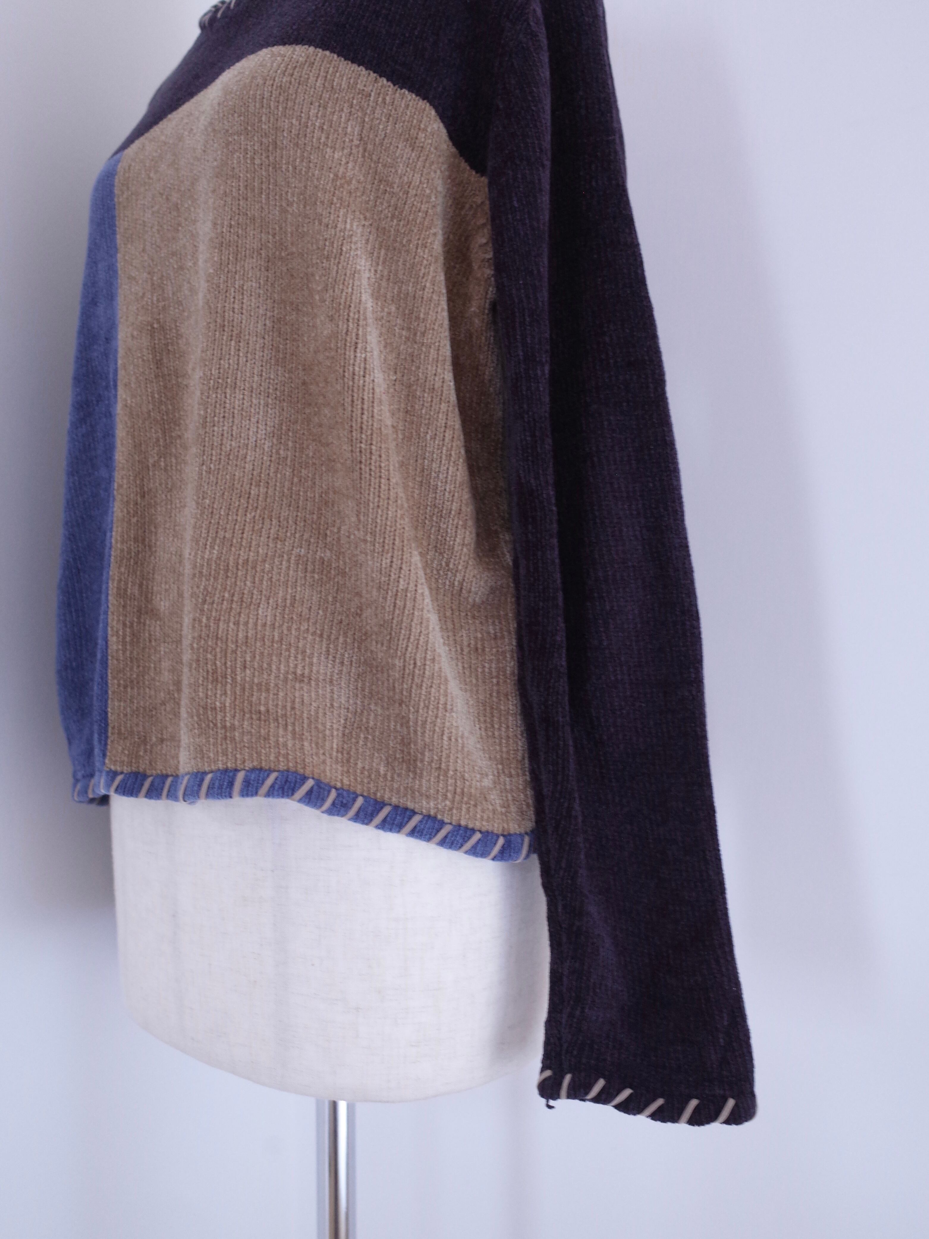 これからの季節にぴったりのサラッとした着心地のアクリル素材のニット。ベロアのような光沢感があり、首まわりや裾、袖口のレザーの風合いのステッチが可愛い一枚。ネイビー×ベージュ×ブルーのパターンが組み合わさったデザインもGOOD◎