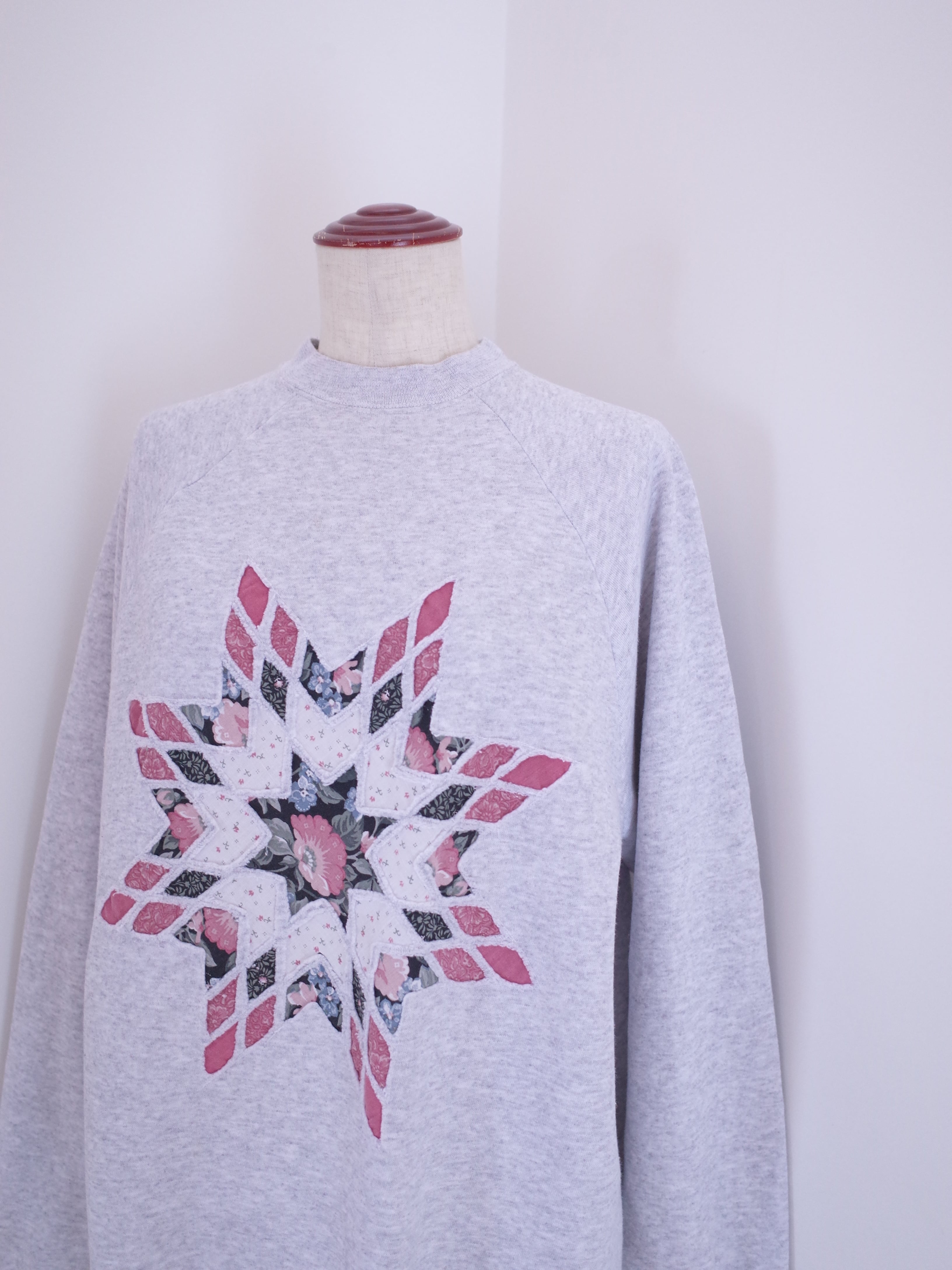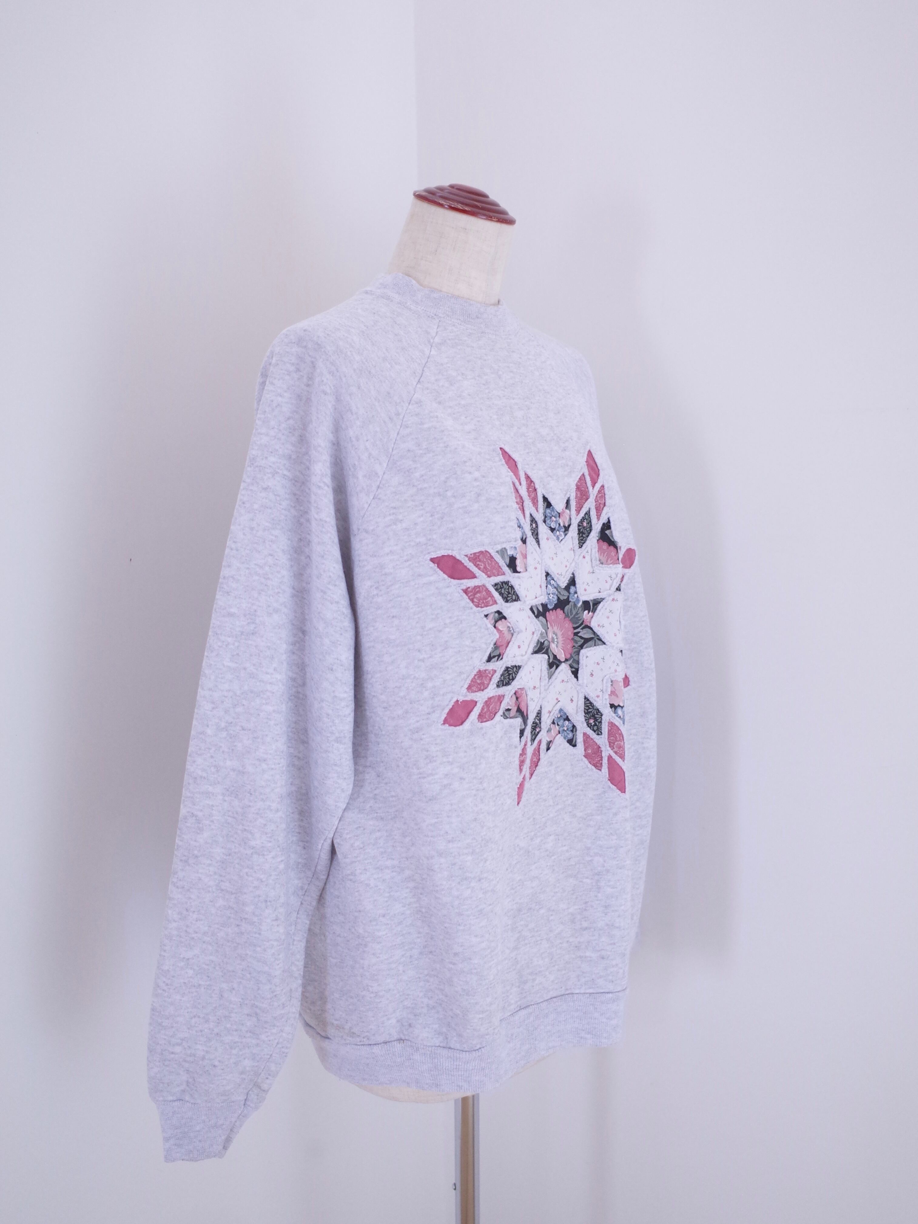雪の結晶のようなパッチワークのデザインが施されたスウェット。ボディはHanesです。ゆったりとしたサイズ感で、首の詰まったシルエット。アッシュグレーのボディに、ピンクとブラックの花柄の生地が春らしさをぐっと高めてくれる一枚です。