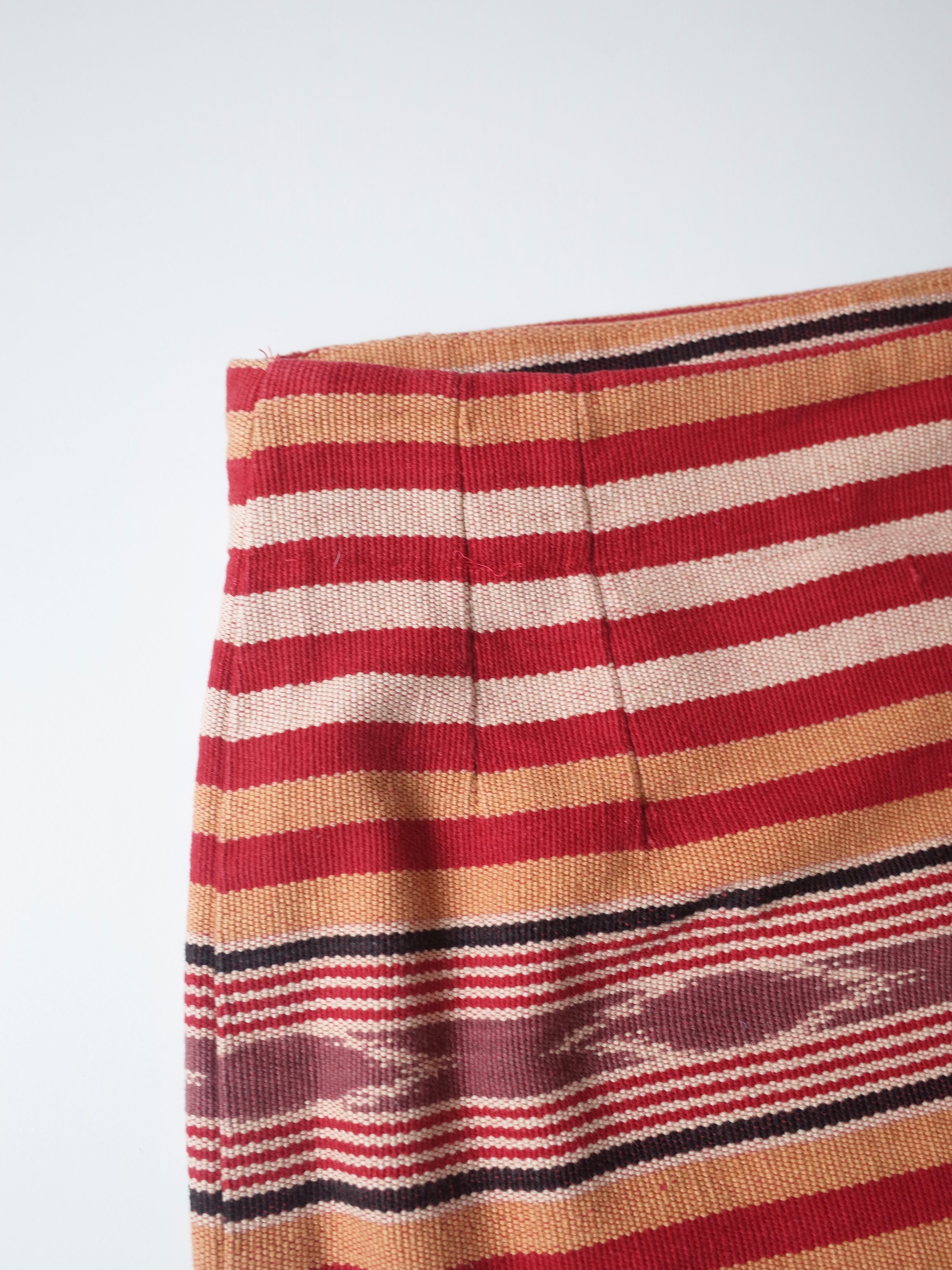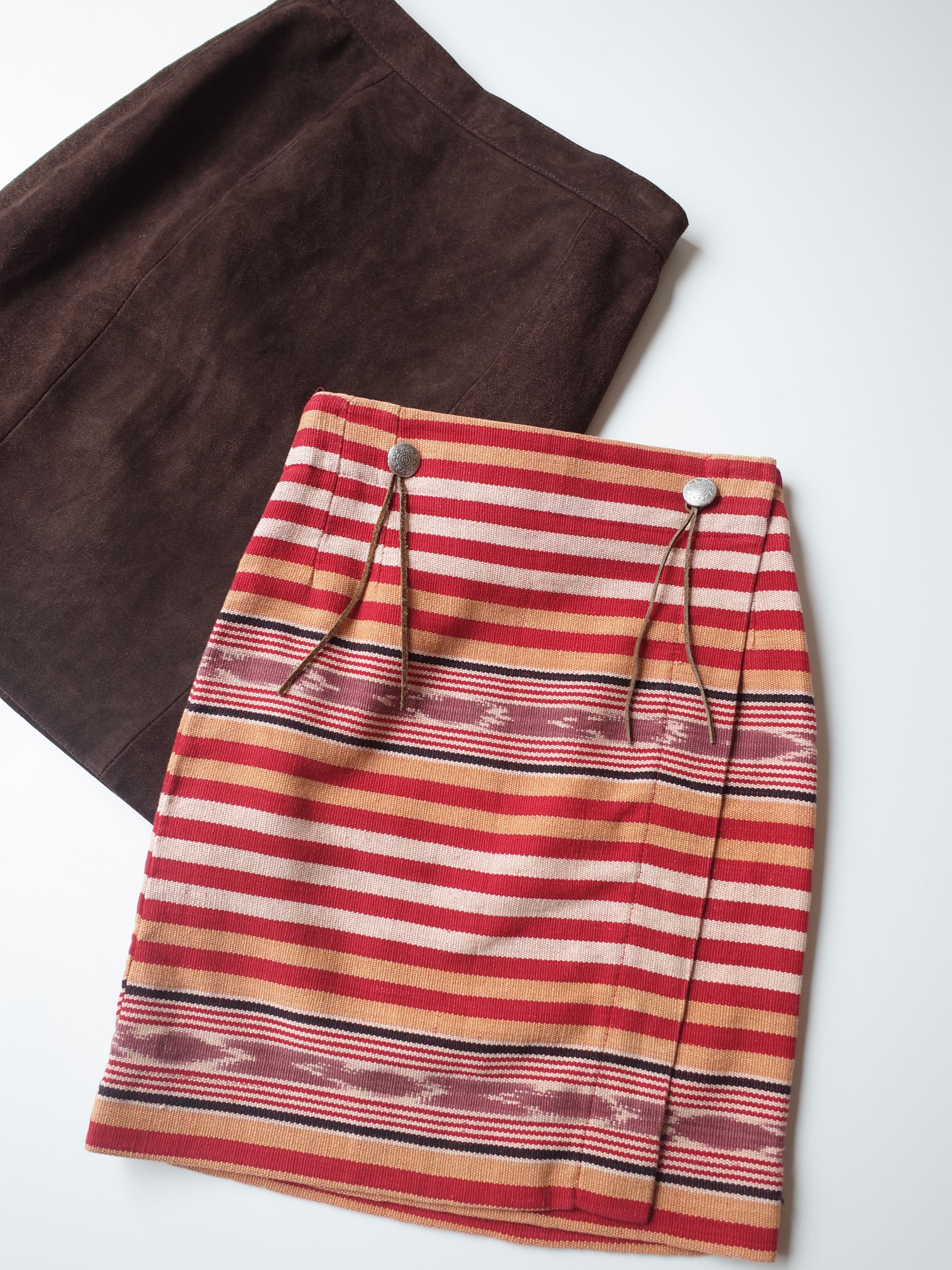1980〜90年代アメリカ製ネイティブ柄がかわいいラップスカート。コンチョボタンとレザーの紐がアクセントになって、スウェットやカットソーと合わせるだけでも雰囲気が出ます。タイトめなシルエットなので、ゆったりとしたサイズ感のジャケットやシャツなどとのバランスもGOOD◎パンツとのレイヤードスタイルもおすすめです。