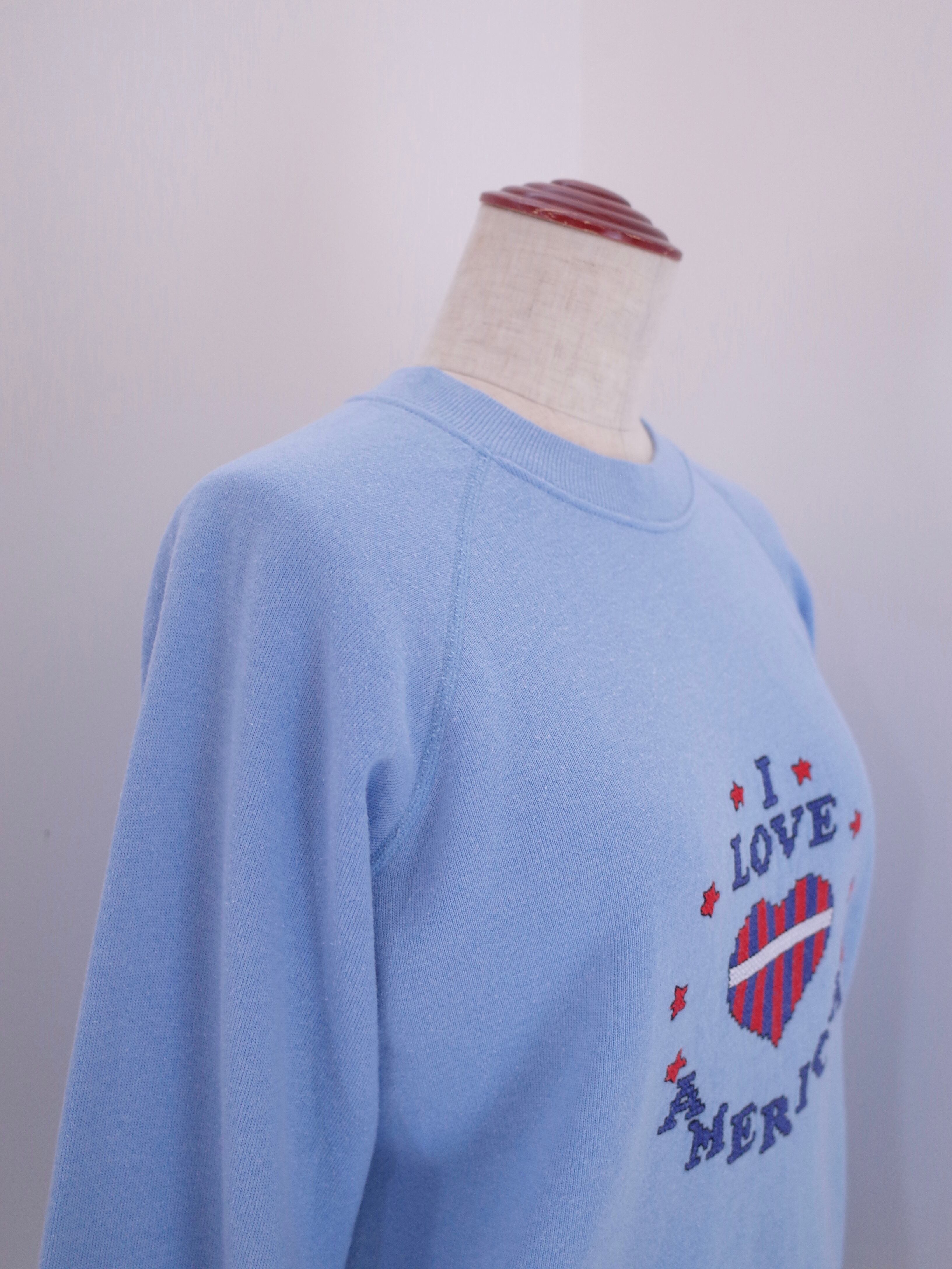 1980〜90年代アメリカ製Hanesボディの刺繍スウェット。ライトブルーのボディに星条旗カラーで"I LOVE AMERICA"の刺繍がNICEな一枚です。