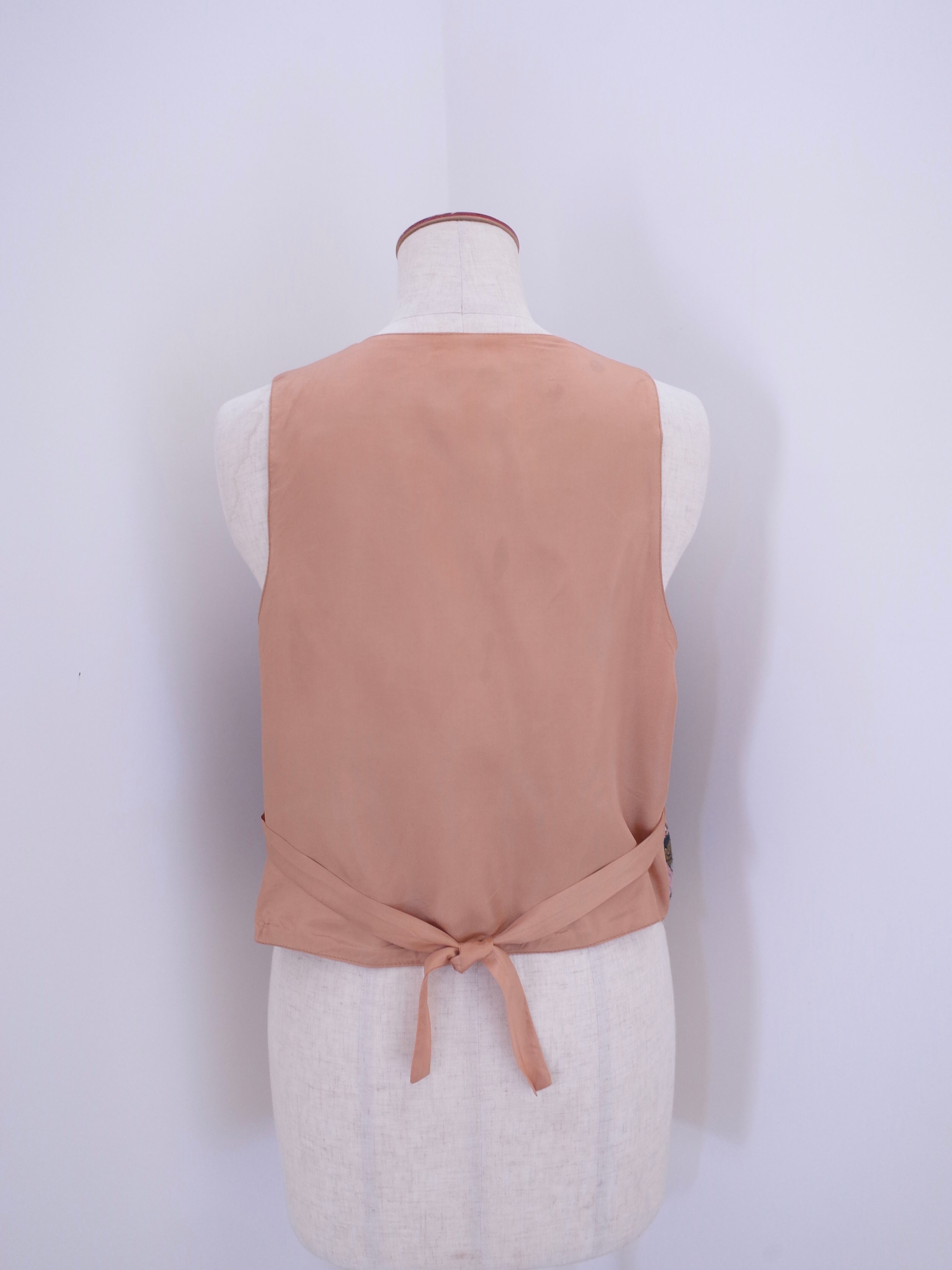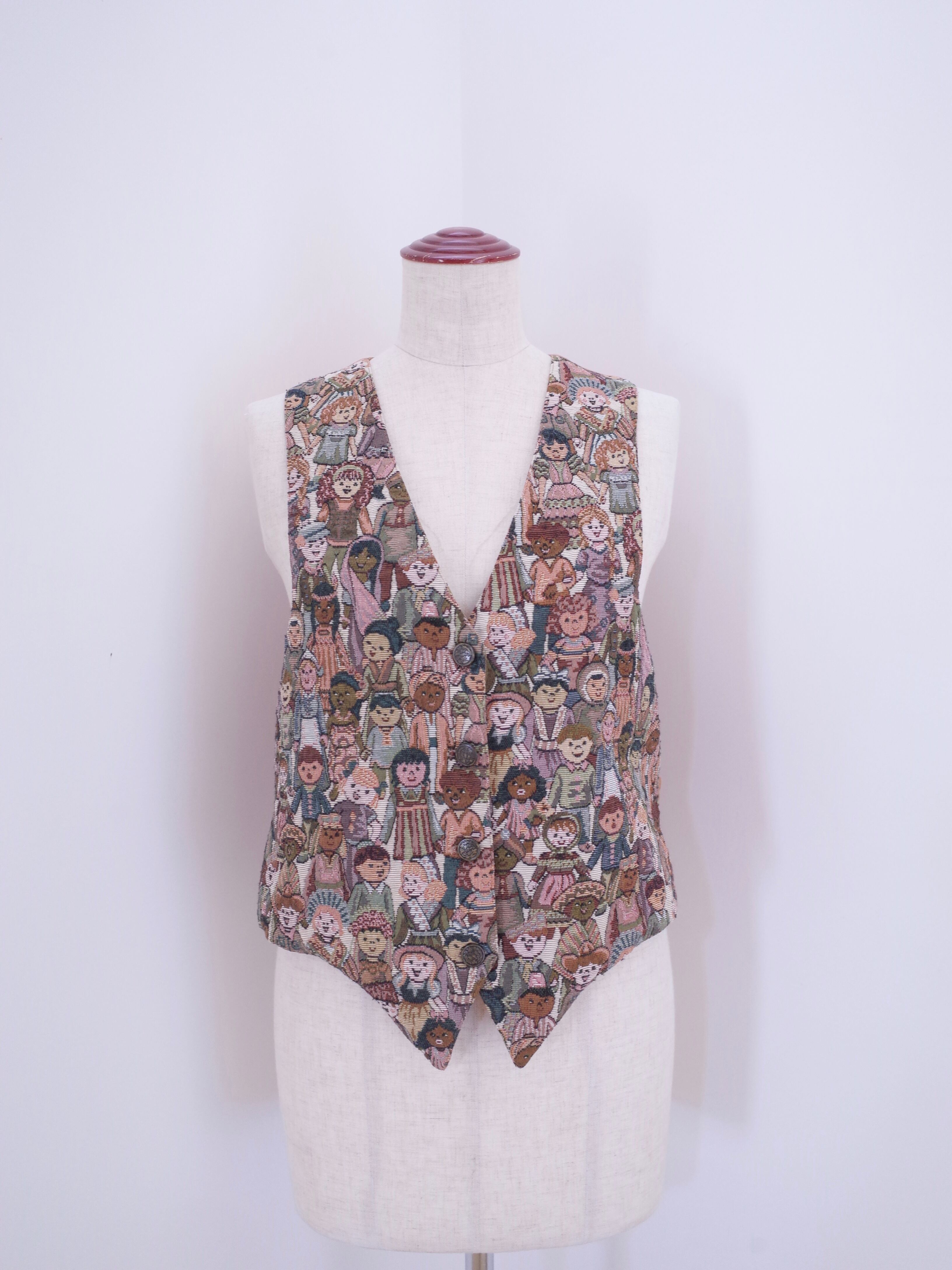 ゴブラン織りのベスト。様々な民族衣装を着た人々がデザインされています。まるで"It's a Small World"の世界。ワンピースと合わせたり、カットソーやジャケットとレイヤーして。タンクトップと重ねたらノースリーブのトップスのようにもお使い頂けるスタイリングの幅が広い一着です。