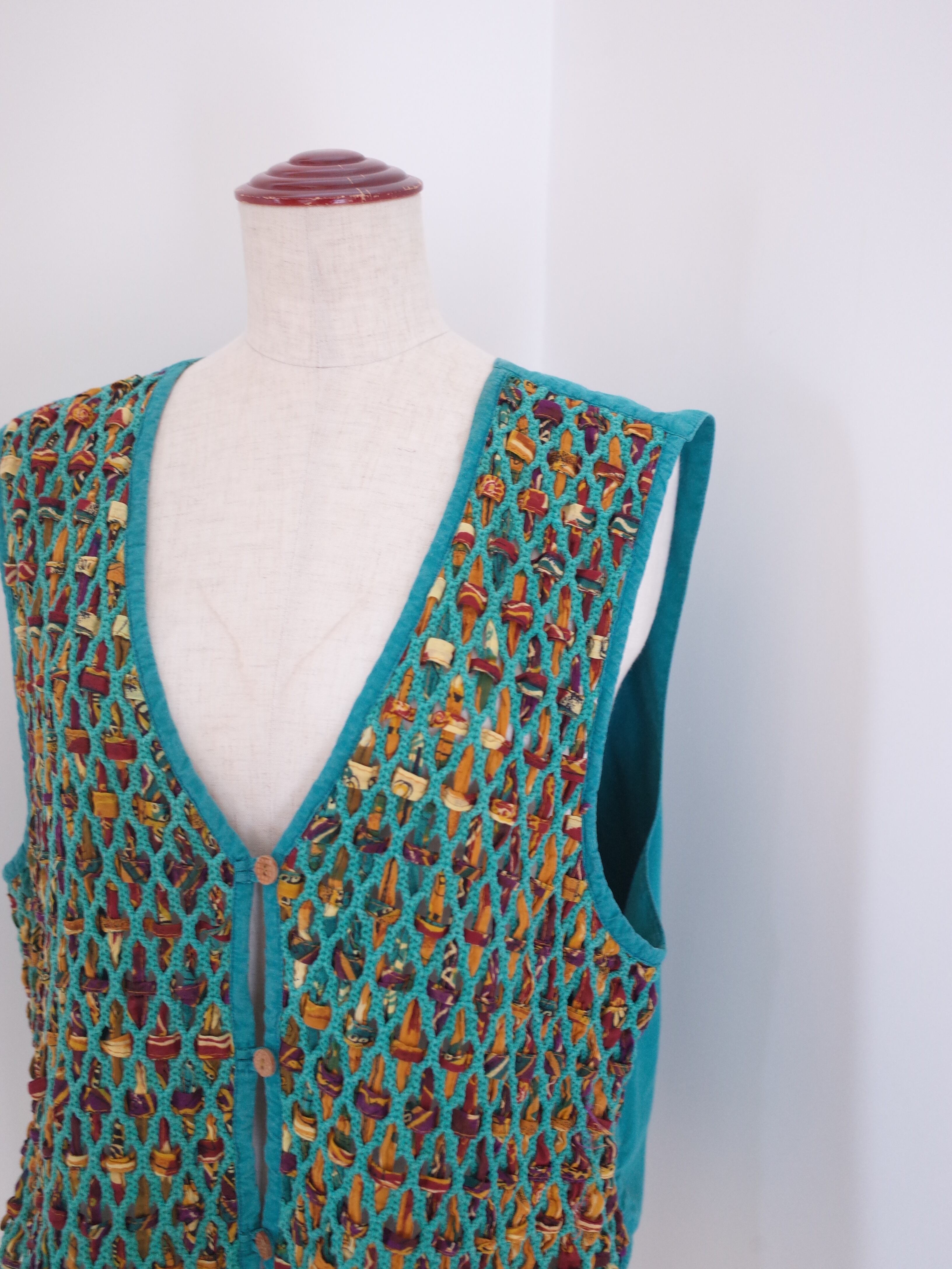 インド製のコットンを使用したベスト。ターコイズカラーのボディに布が編み込まれた手の込んだデザイン。ワンピースと合わせたり、カットソーやジャケットとレイヤーして。タンクトップと重ねたらノースリーブのトップスのようにもお使い頂けるスタイリングの幅が広い一着です。