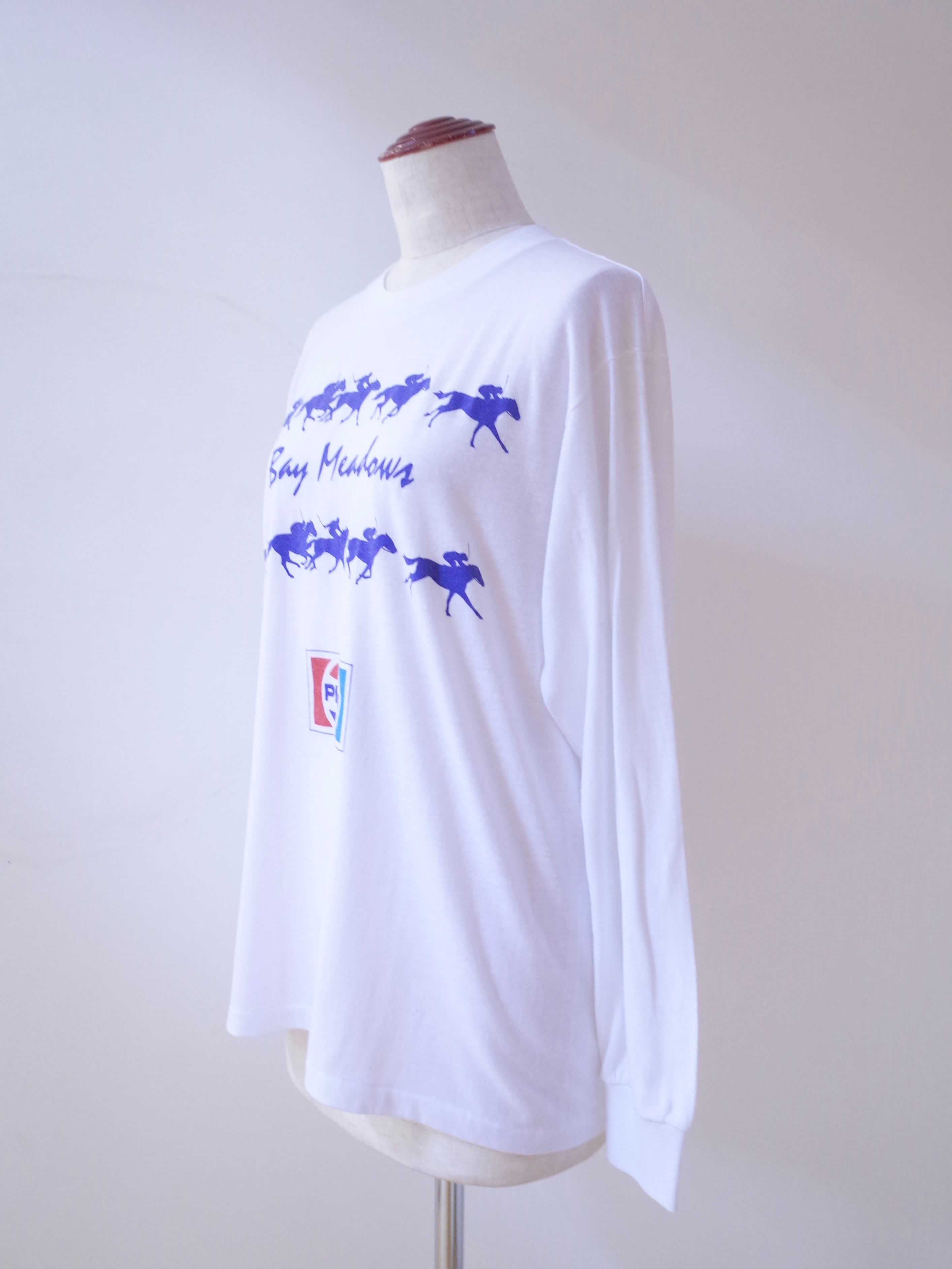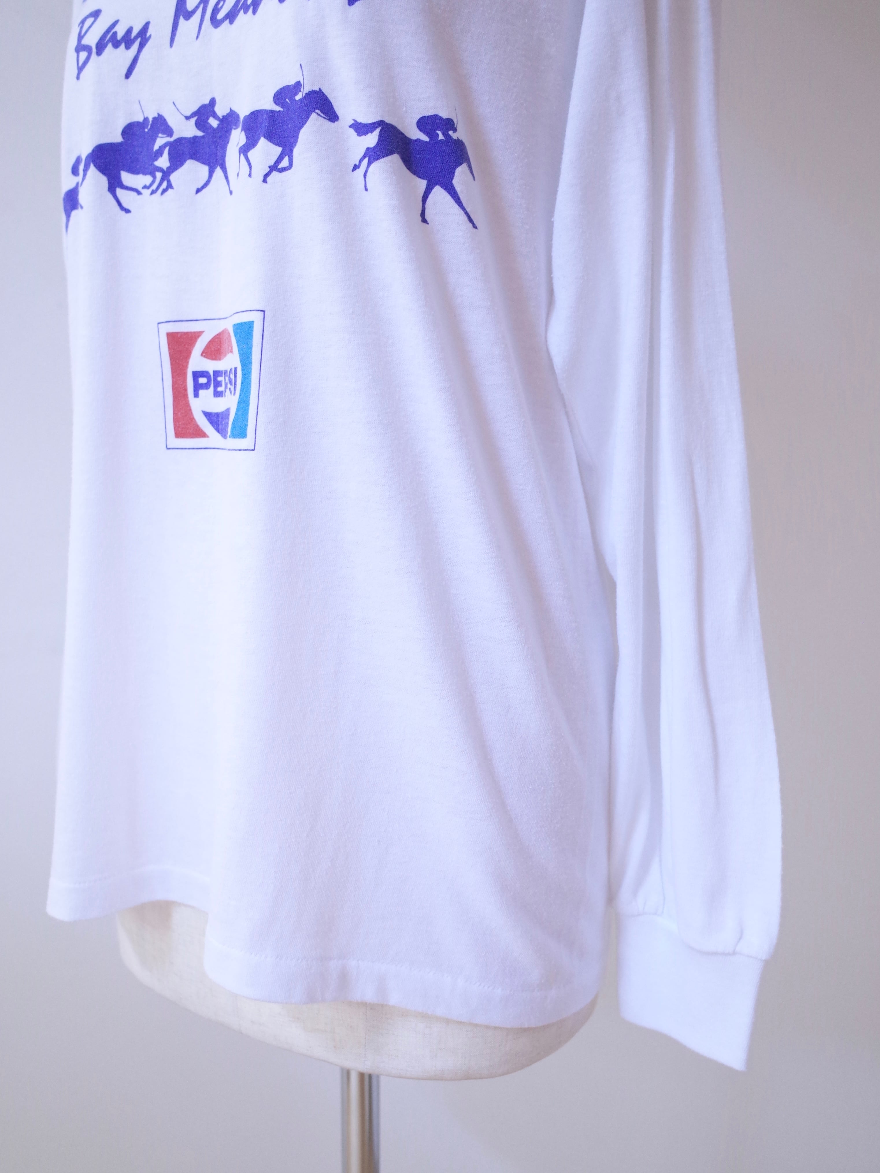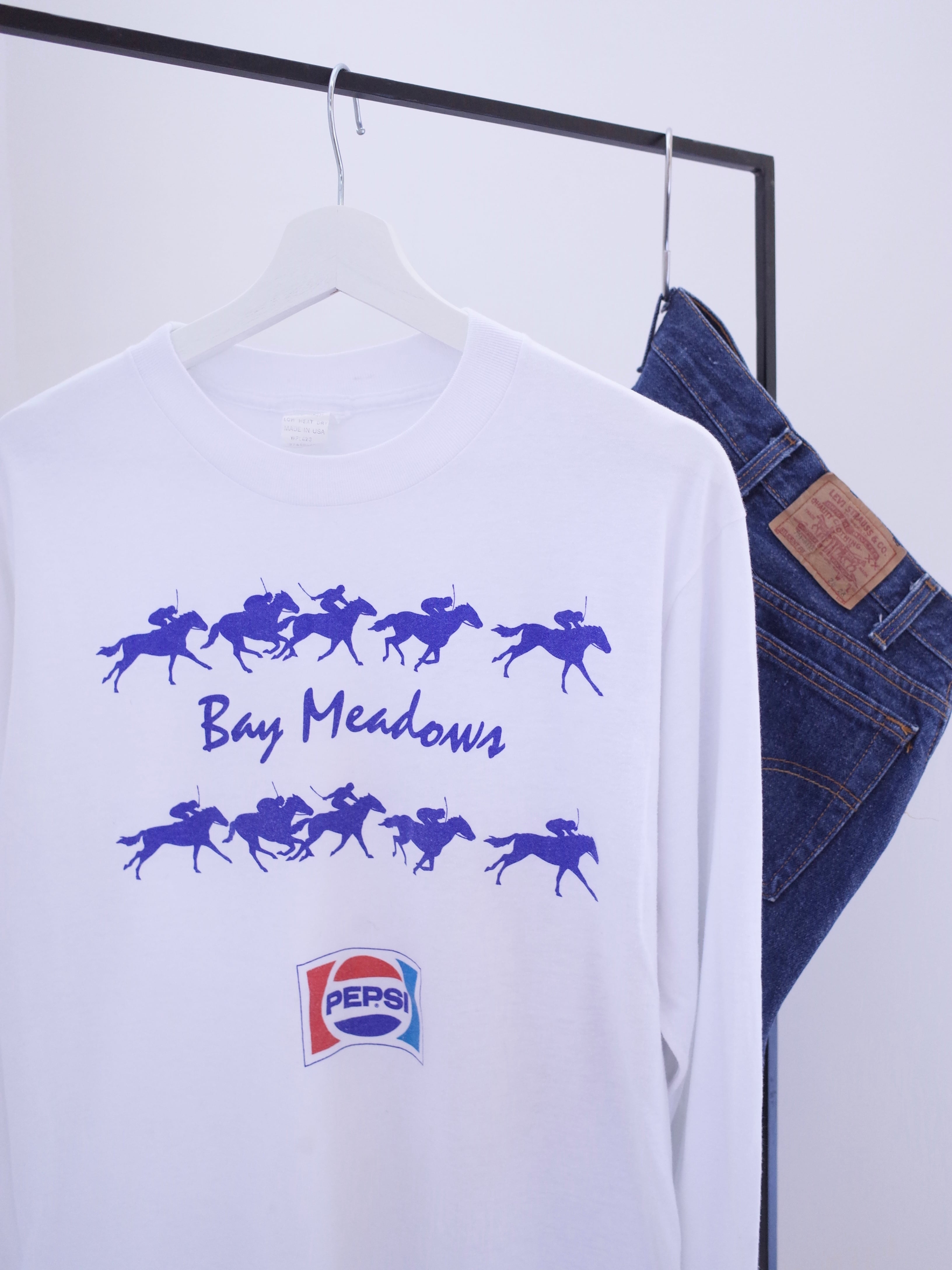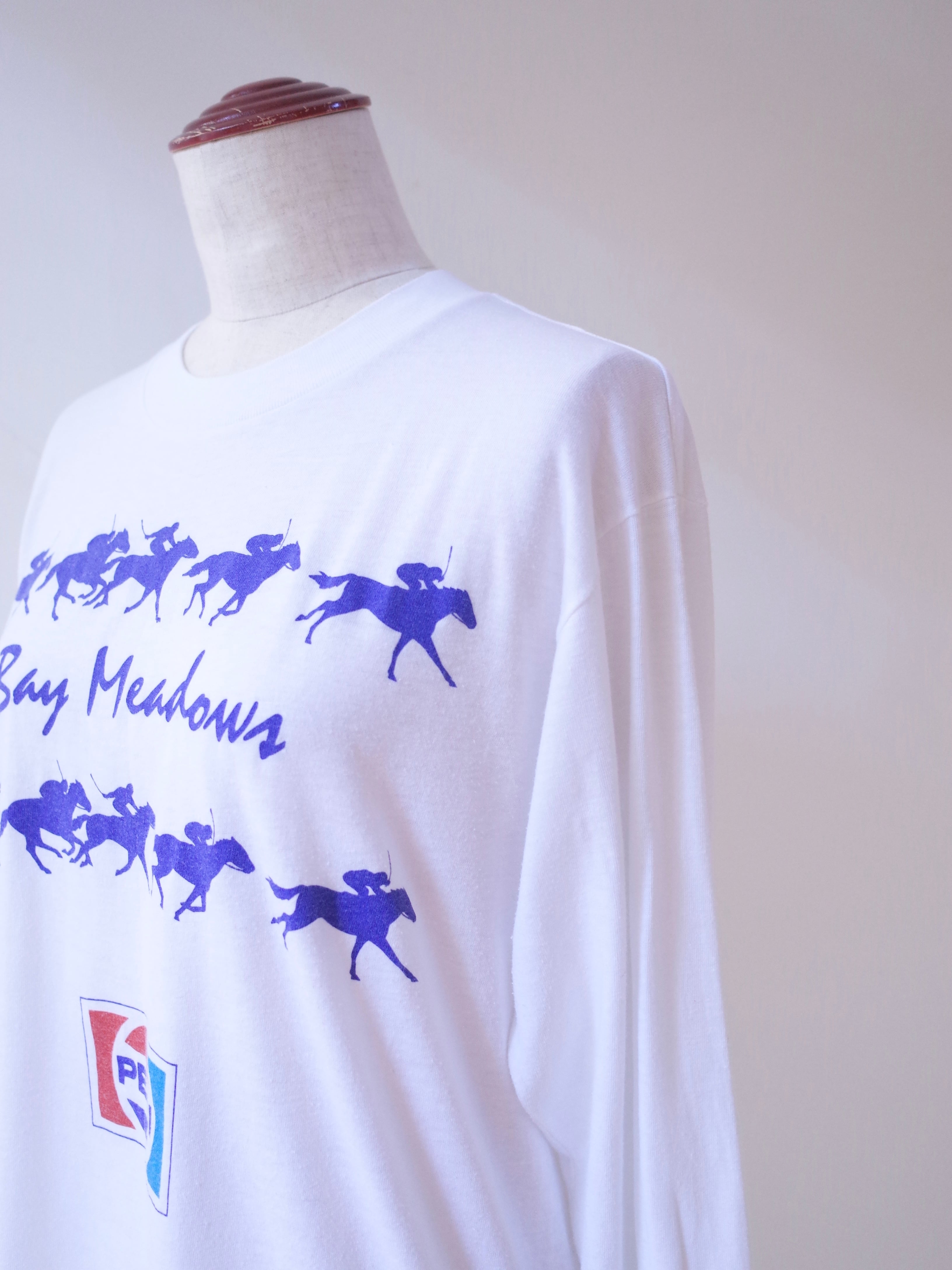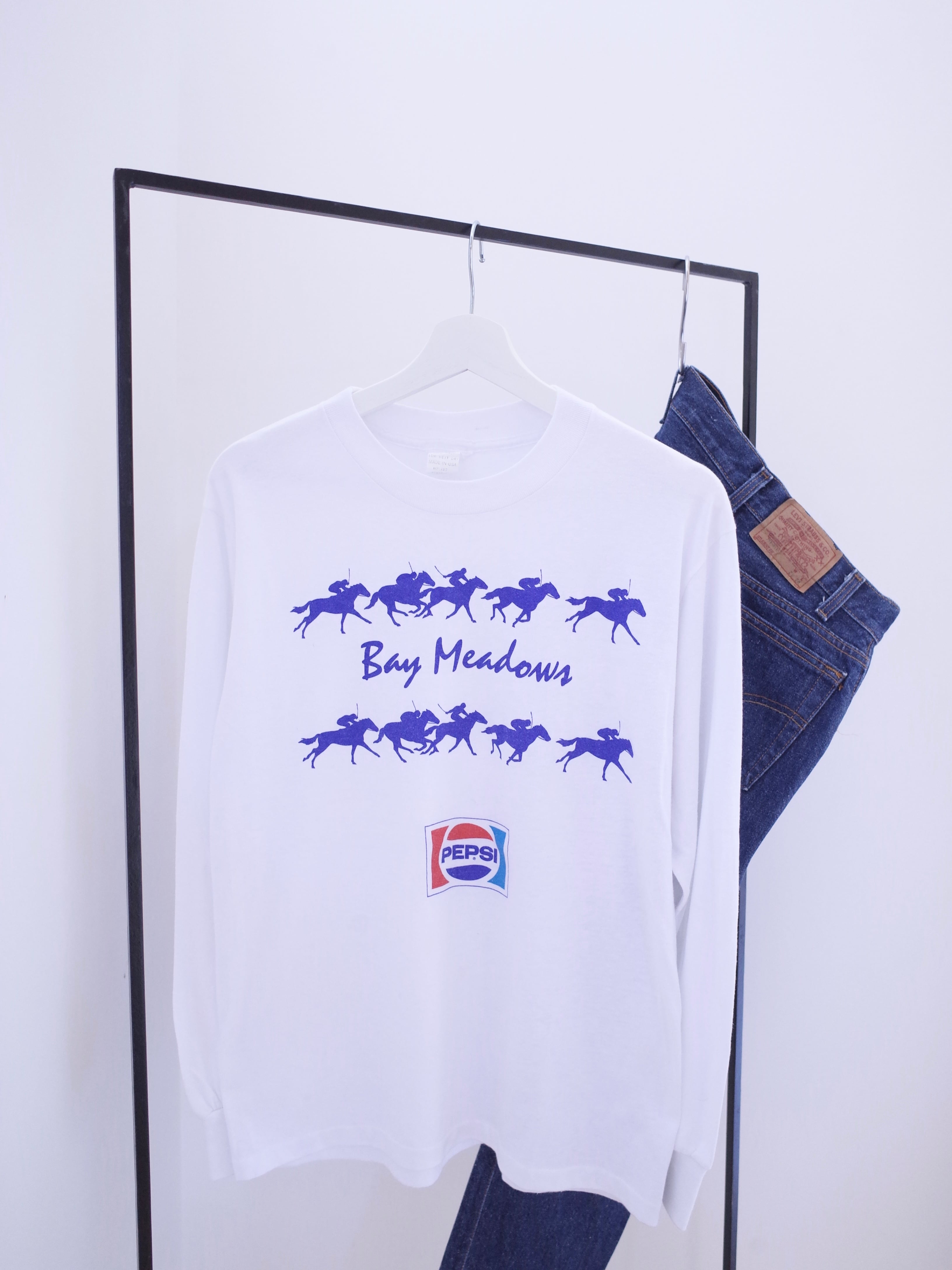 80年代アメリカ製Bay MeadowsのロンT。タグは切れてますが、内タグの表記からLevi'sボディだと思われます。1934〜2008年まであったカリフォルニアのベイメドウズ競馬場のプリント。協賛のペプシのロゴもGOODです。