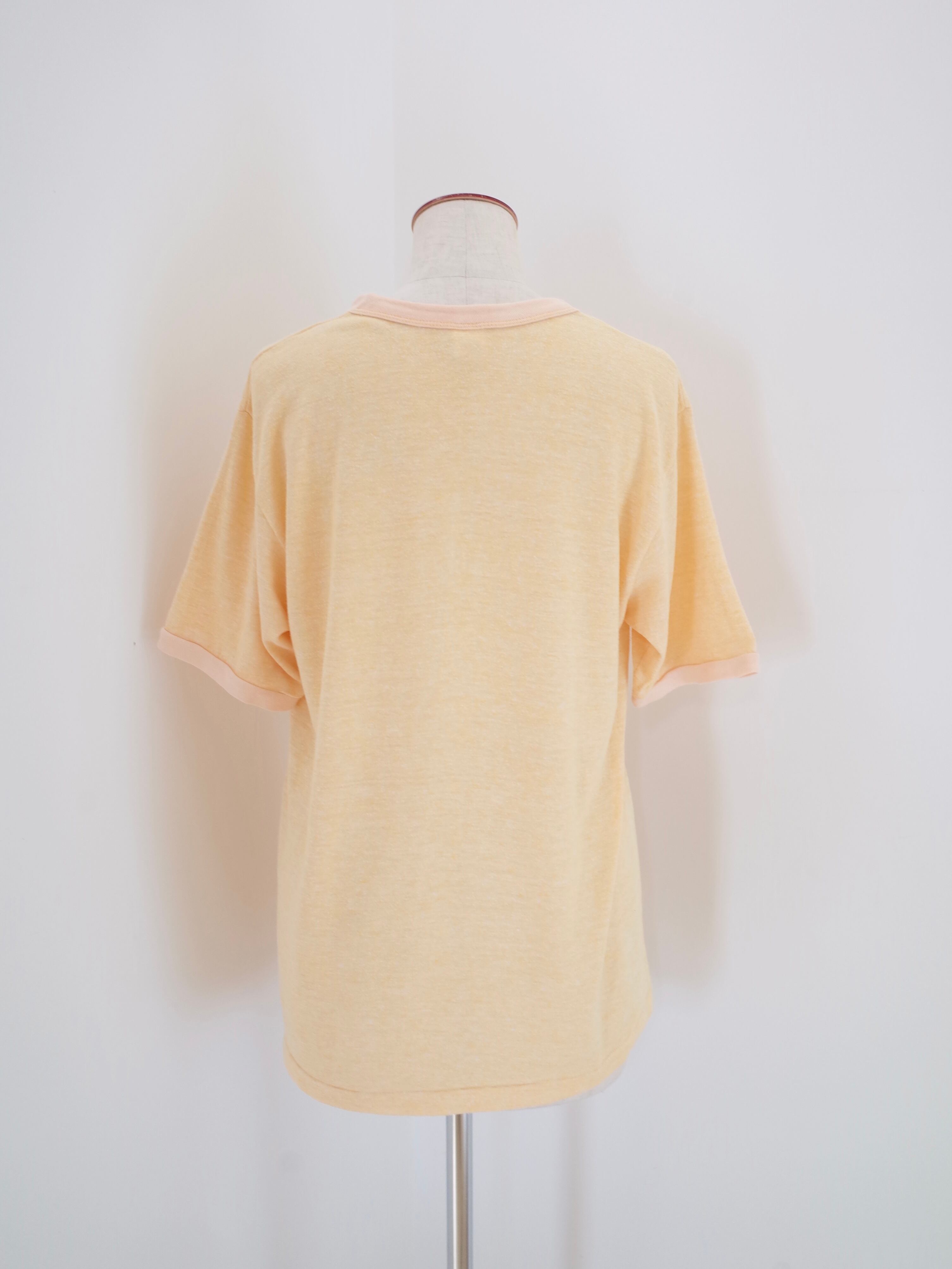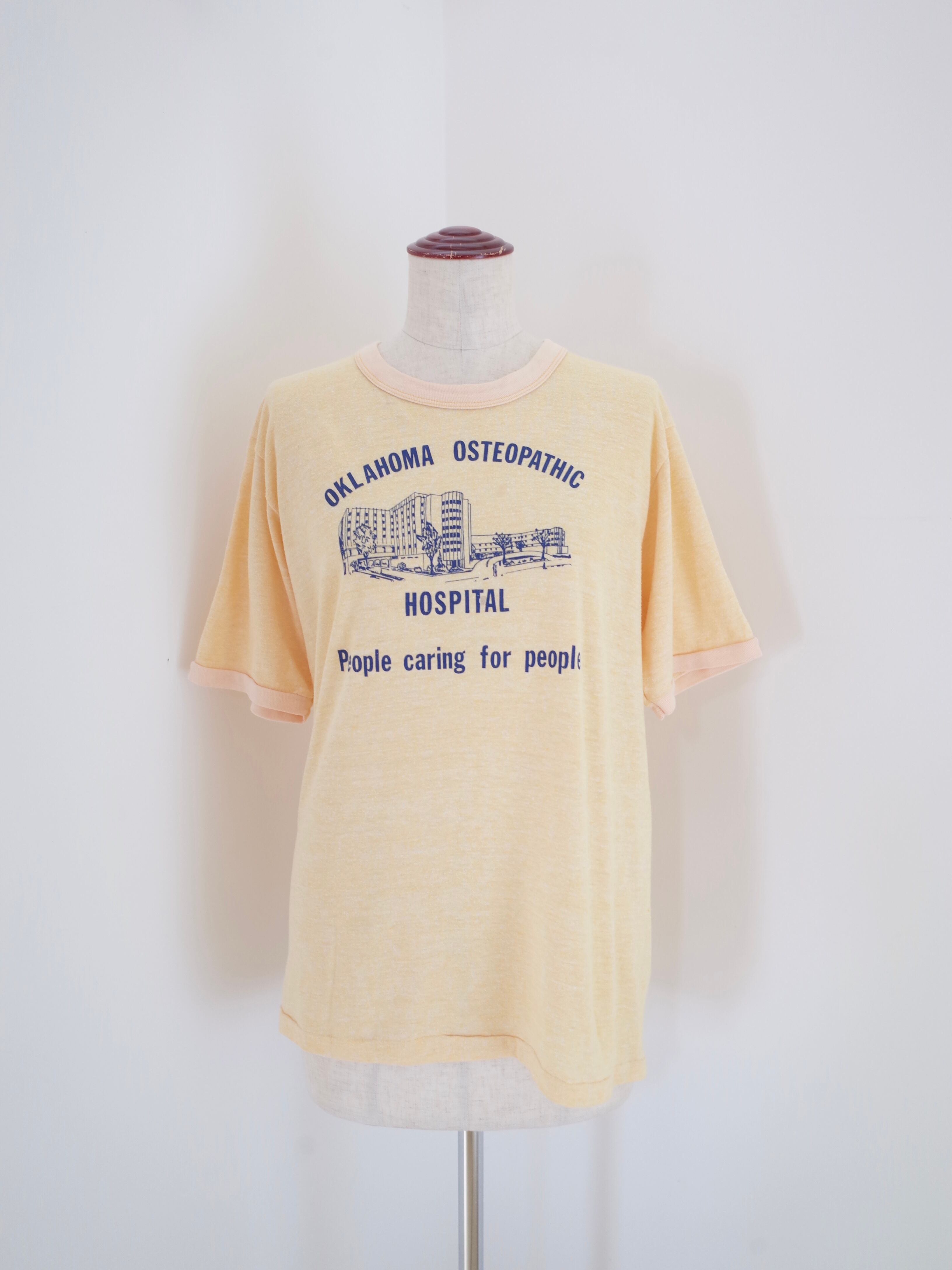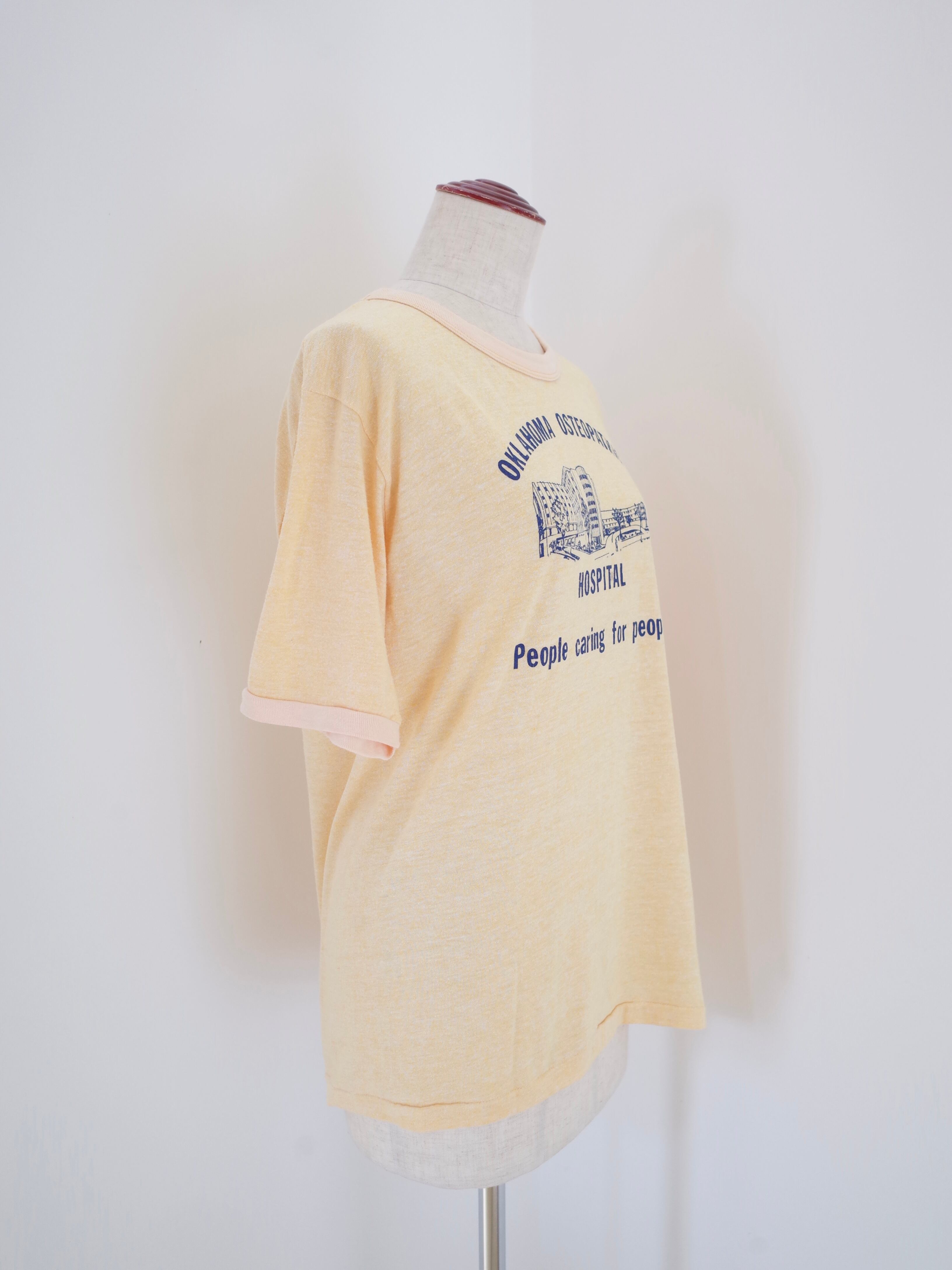 70〜80年代アメリカ製オクラホマの病院のTシャツ。珍しいイエローカラーのリンガーTに、プリントもGOODな一枚です。ヴィンテージTシャツならではのクタッとした質感も◎