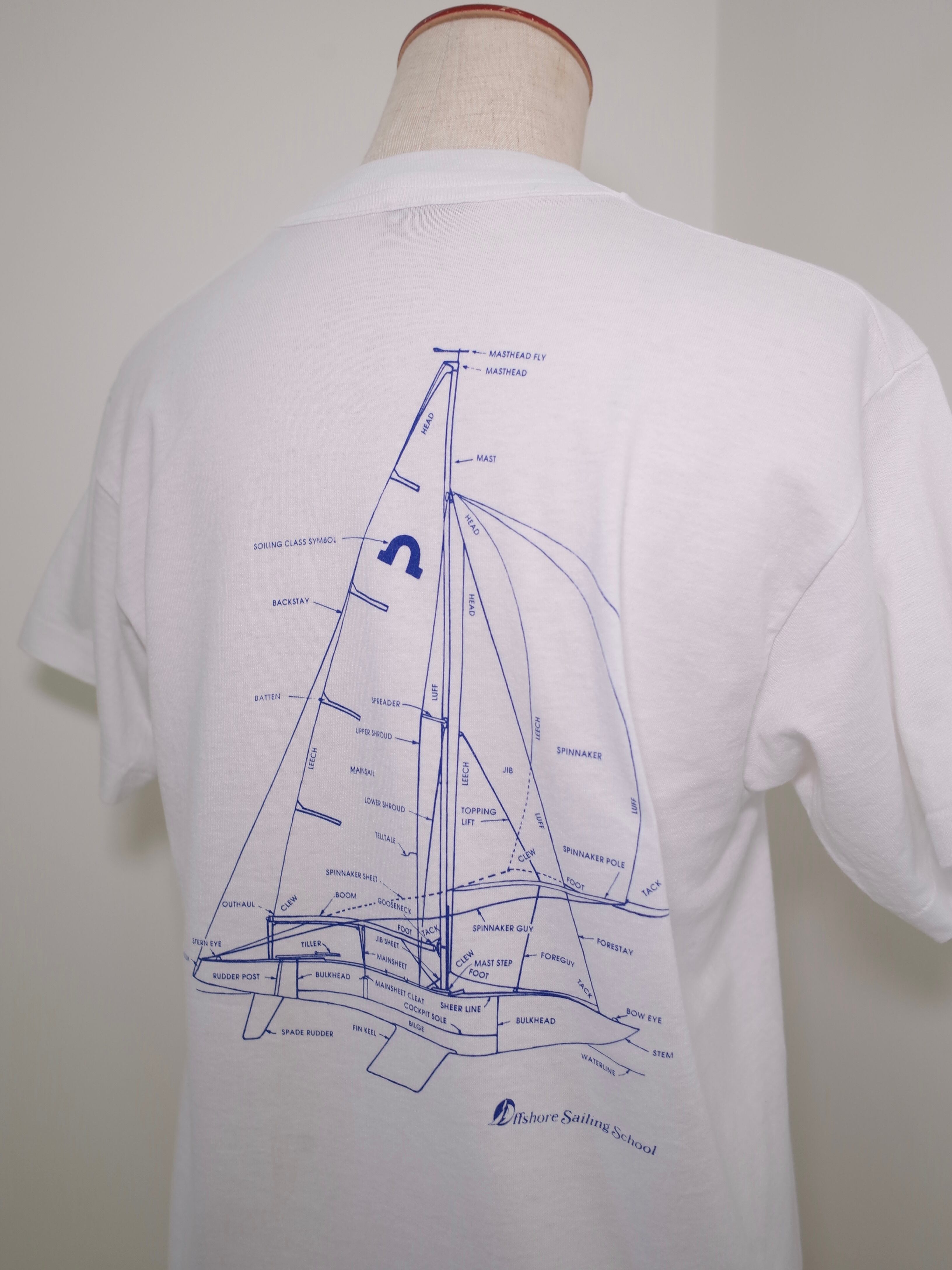 90年代アメリカ製FRUIT OF THE LOOMボディのTシャツ。セーリングスクールのTシャツで、バックのヨットプリントがgoodな一枚です。