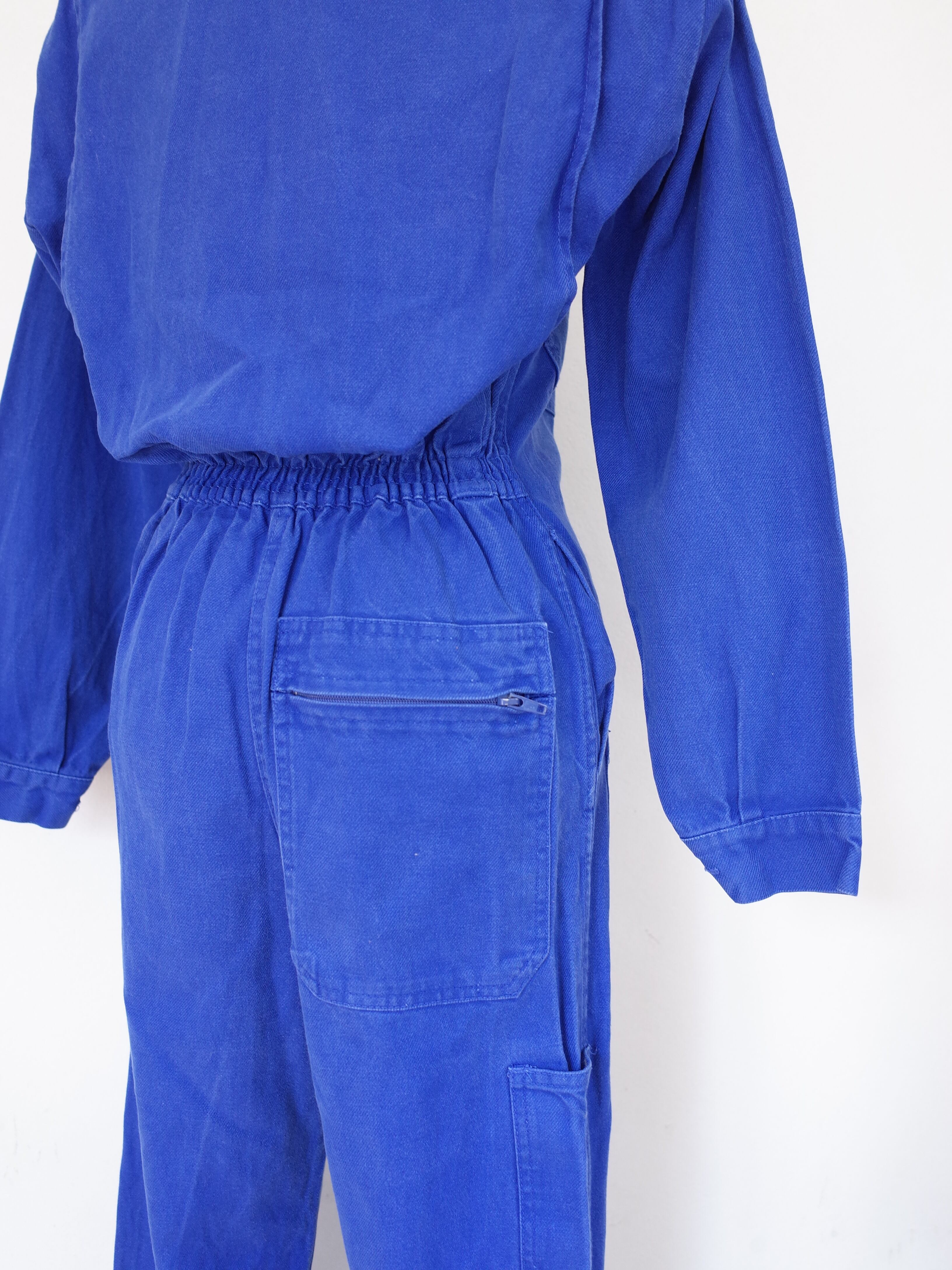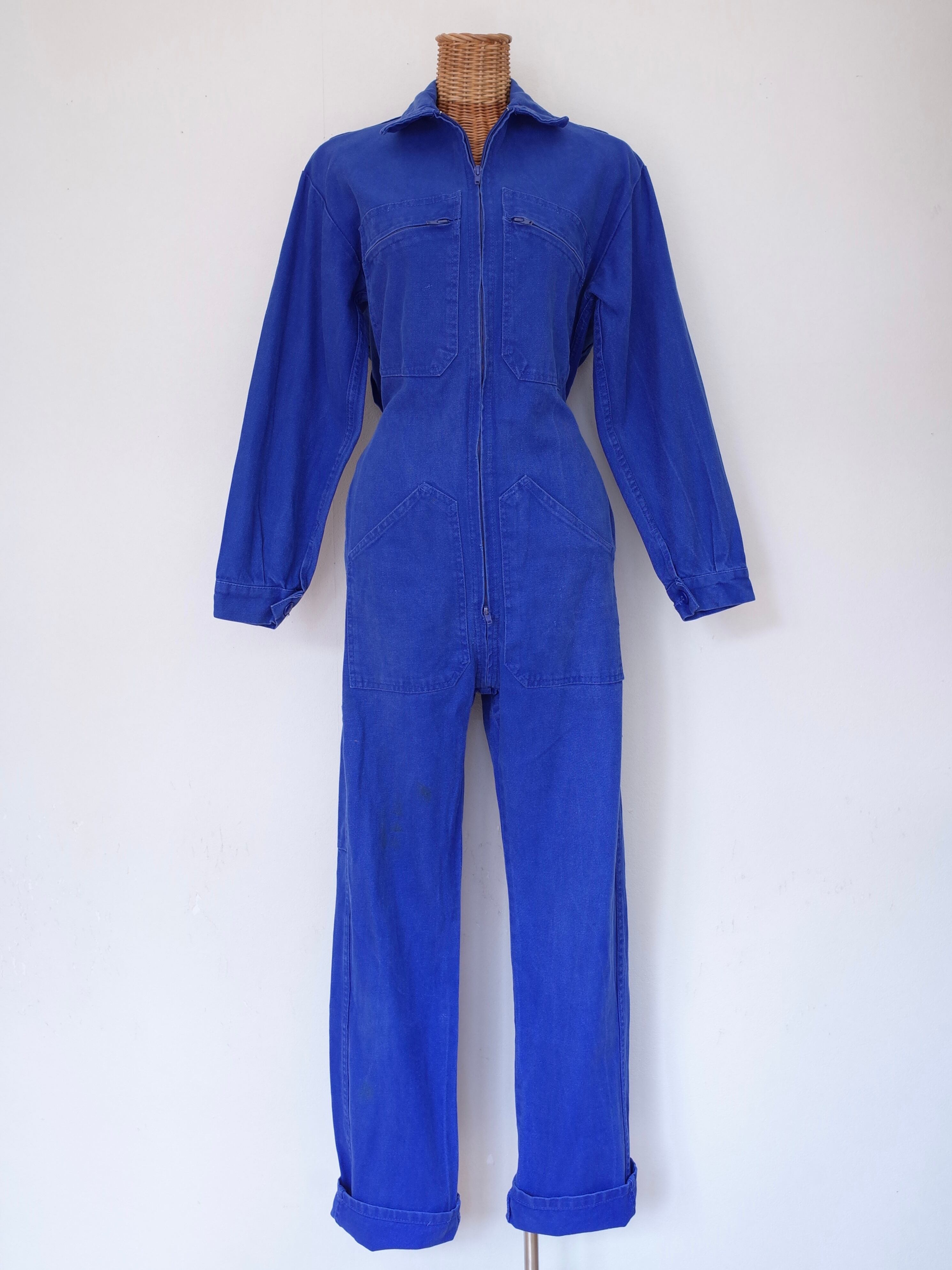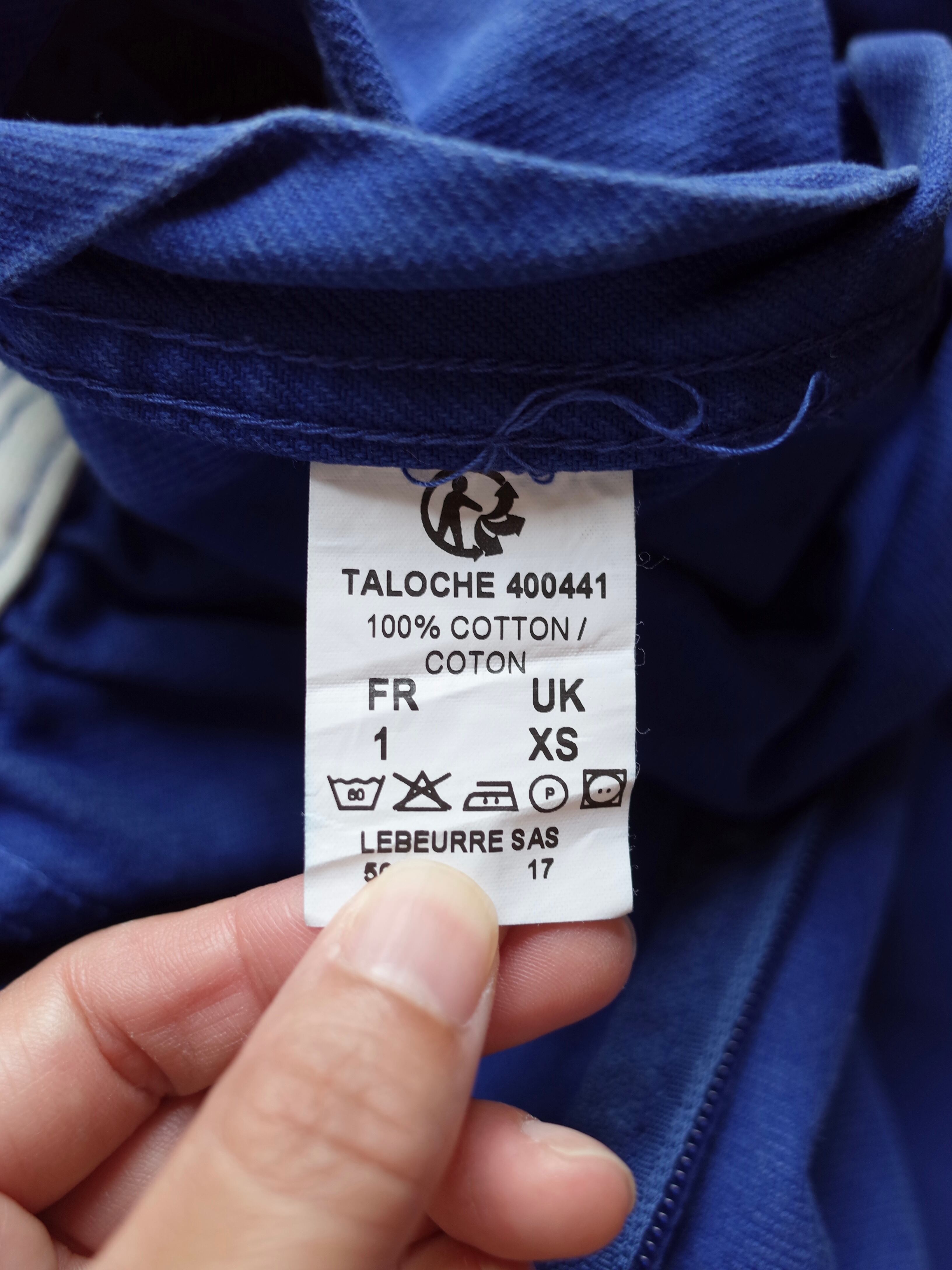 ユーロワークのつなぎです。シルエットは細身で小さめのサイズ感。ウエストにはゴムが入っていて、程よい位置で止まってくれます◎ワークウェアとしてはダメージも少ない方で、綺麗な感じで着用頂けます。小さいサイズをお探しの方におすすめです。