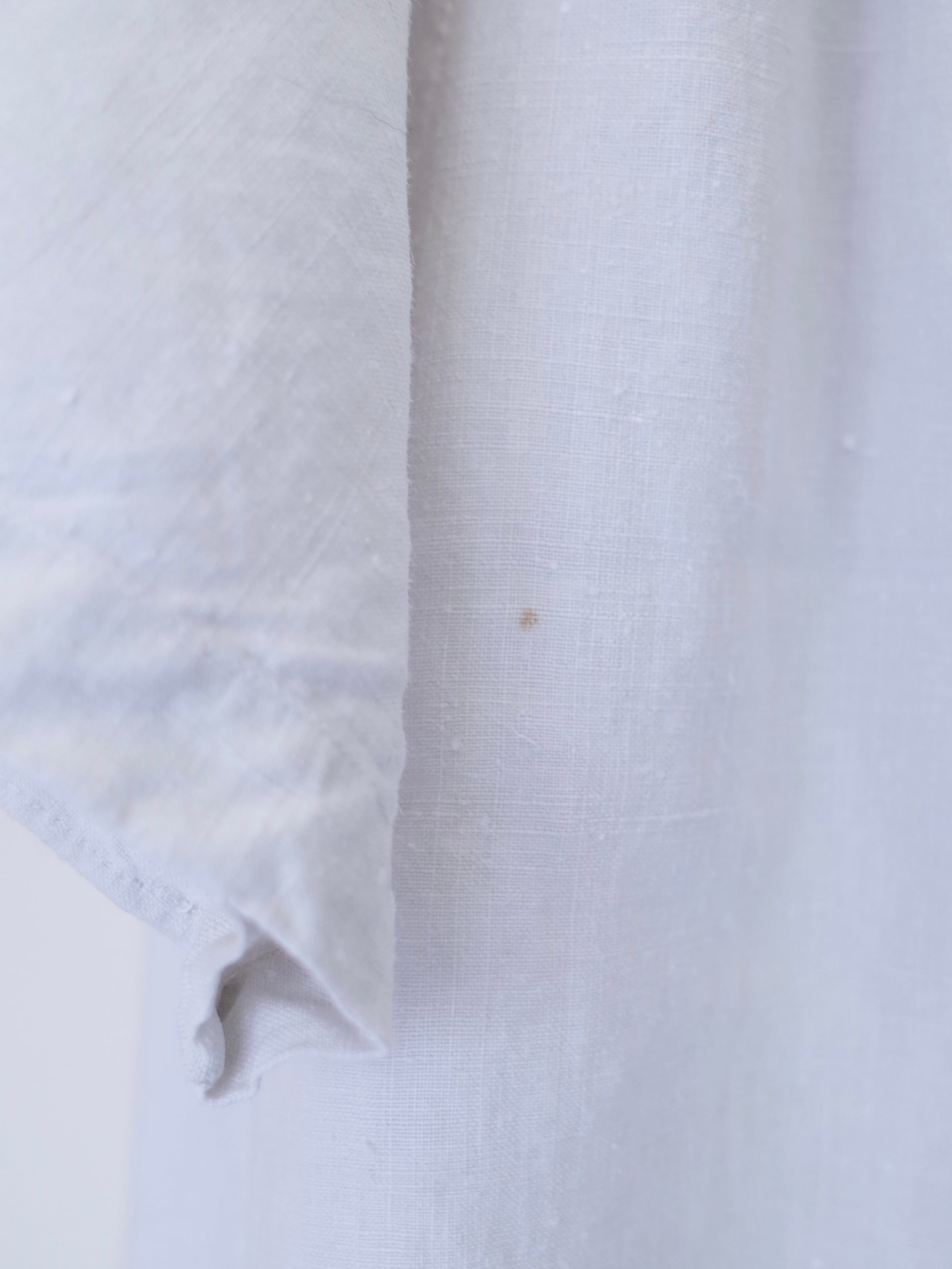 フランスで作られたアンティークリネンのワンピース。アンティークリネンは1920年代以前に作られたものとなりますので、約100年前のものです。当時はホームスパンと呼ばれ、家々で紡がれたリネンをワンピースやキッチンウエア、シーツなどに仕立てて、花嫁道具と一緒に嫁ぎ先に渡されたとのことです。