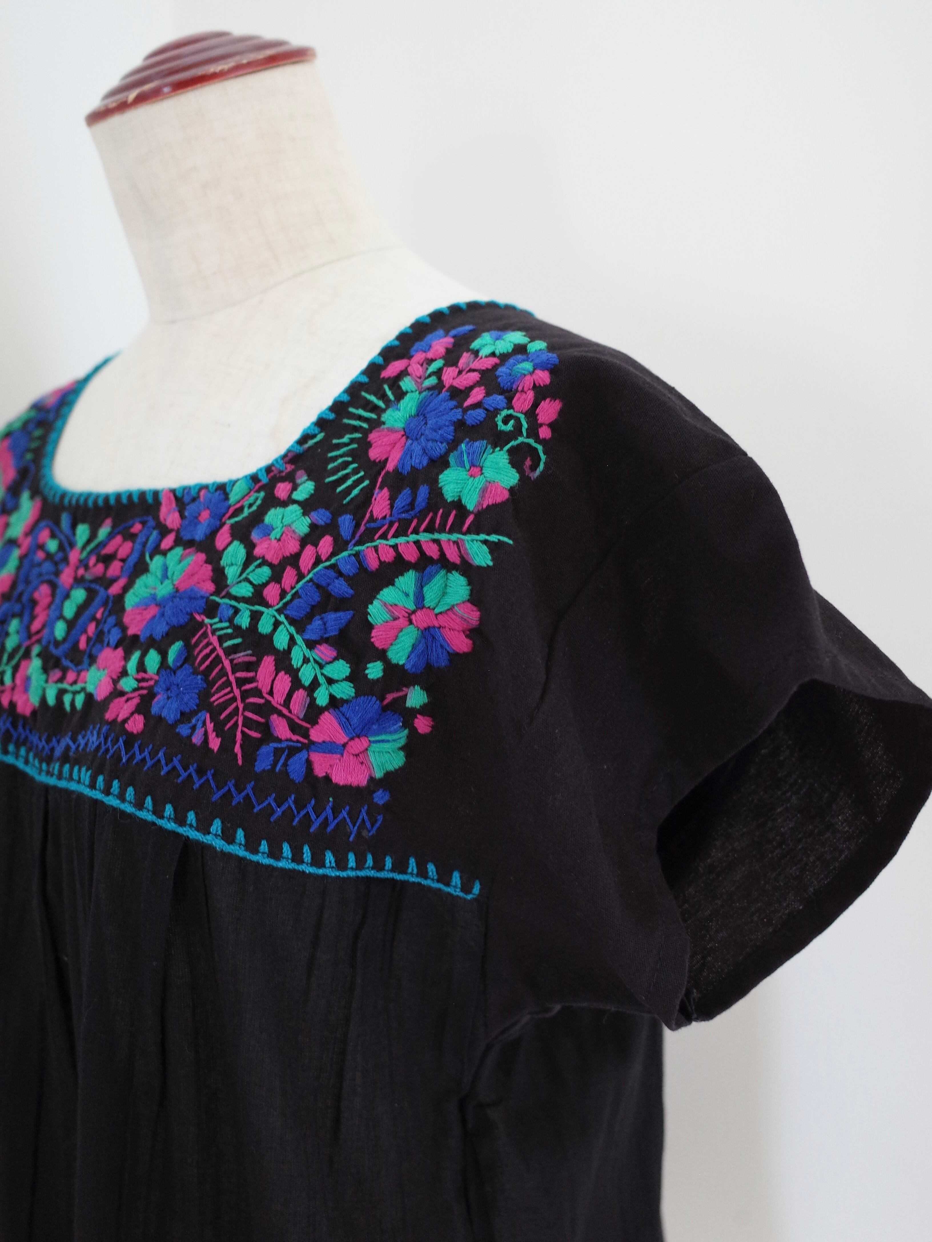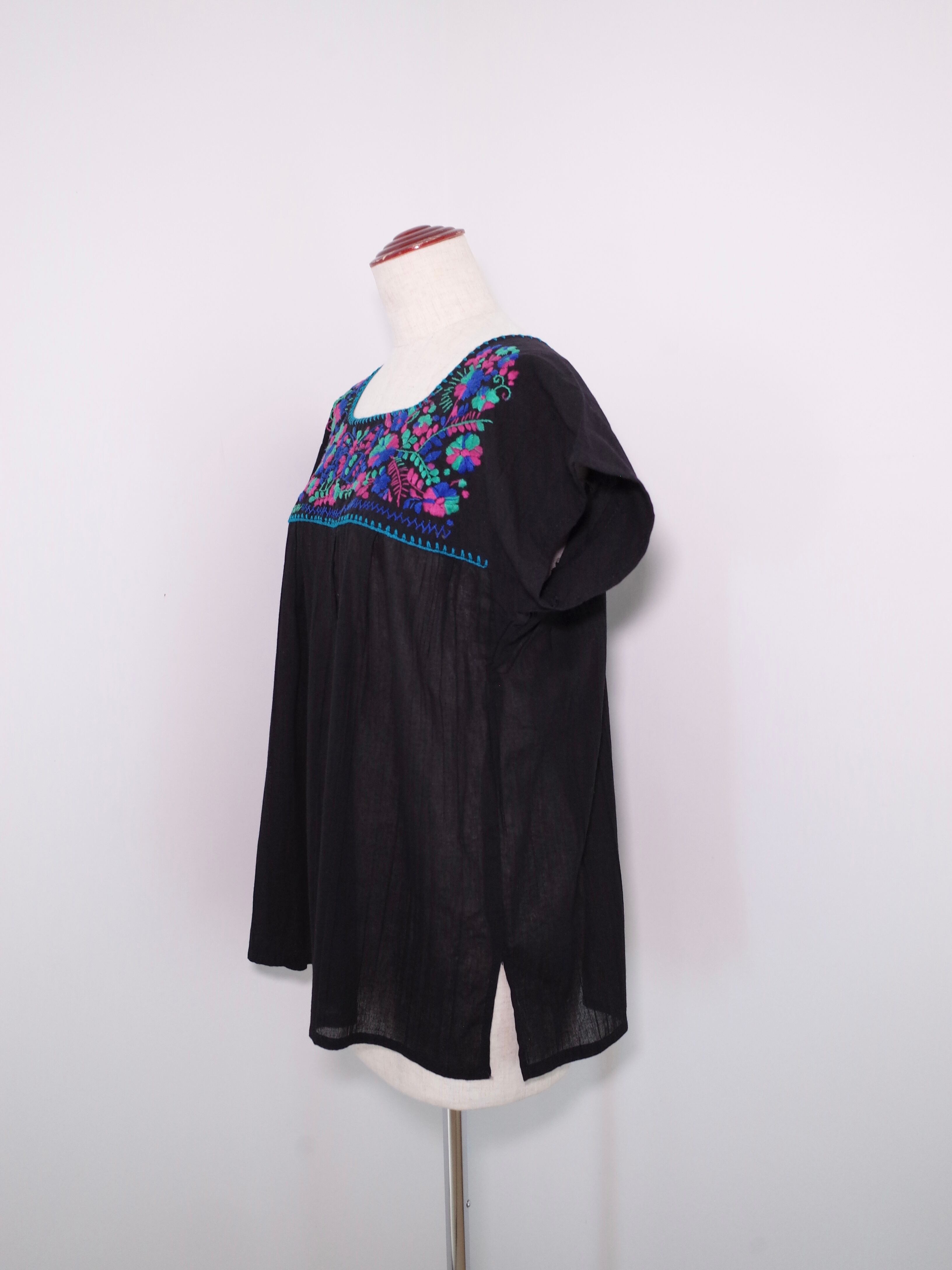 メキシコの刺繍ブラウス。胸元の刺繍部分より下は、若干の透け感があり涼しげな一枚です。ブラック地にセンスの良い配色の刺繍がGOODなブラウスです。