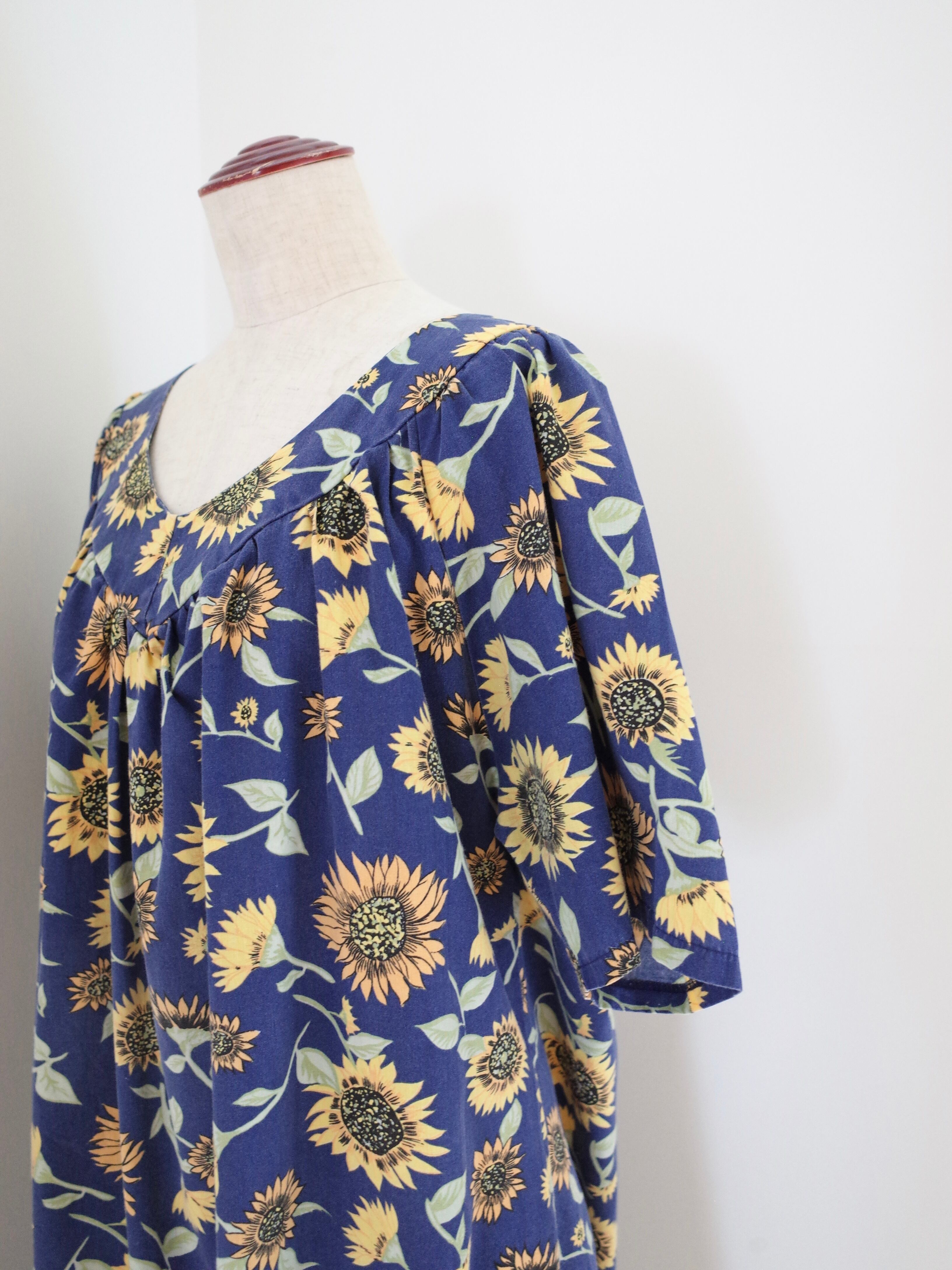 アメリカ製ひまわり柄がかわいいワンピース。ハワイのムームーのような雰囲気の一枚。サラッとした生地感に程よくボリュームのあるシルエット。バサっと着られる涼しいワンピースです。