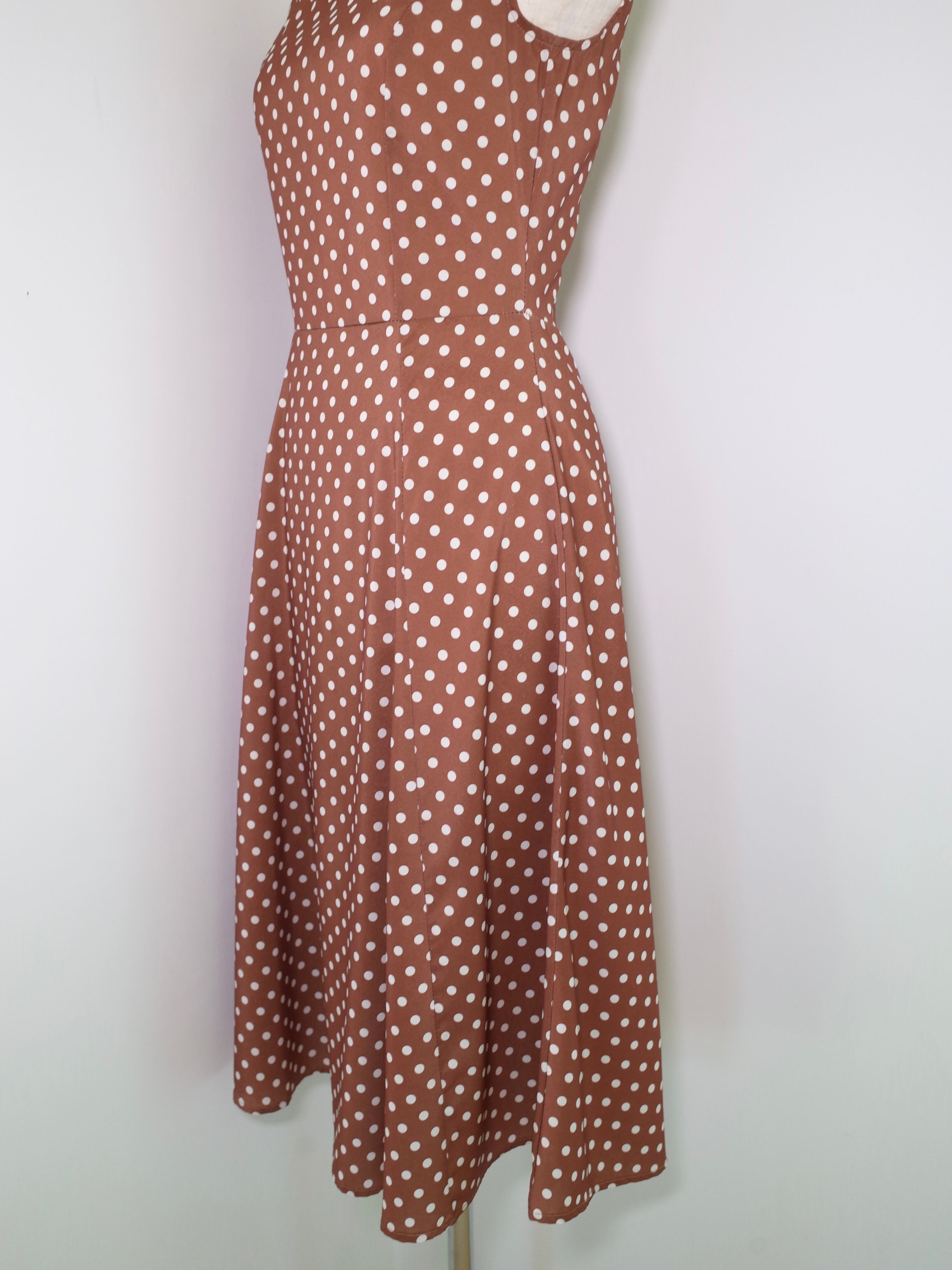 ドット柄ノースリーブのシンプルなワンピース。ブラウンベースにホワイトのドットが可愛い一枚。程よく伸縮する生地なので着やすさもあります。デニムなどのボトムとレイヤーするとカジュアルな雰囲気に◎